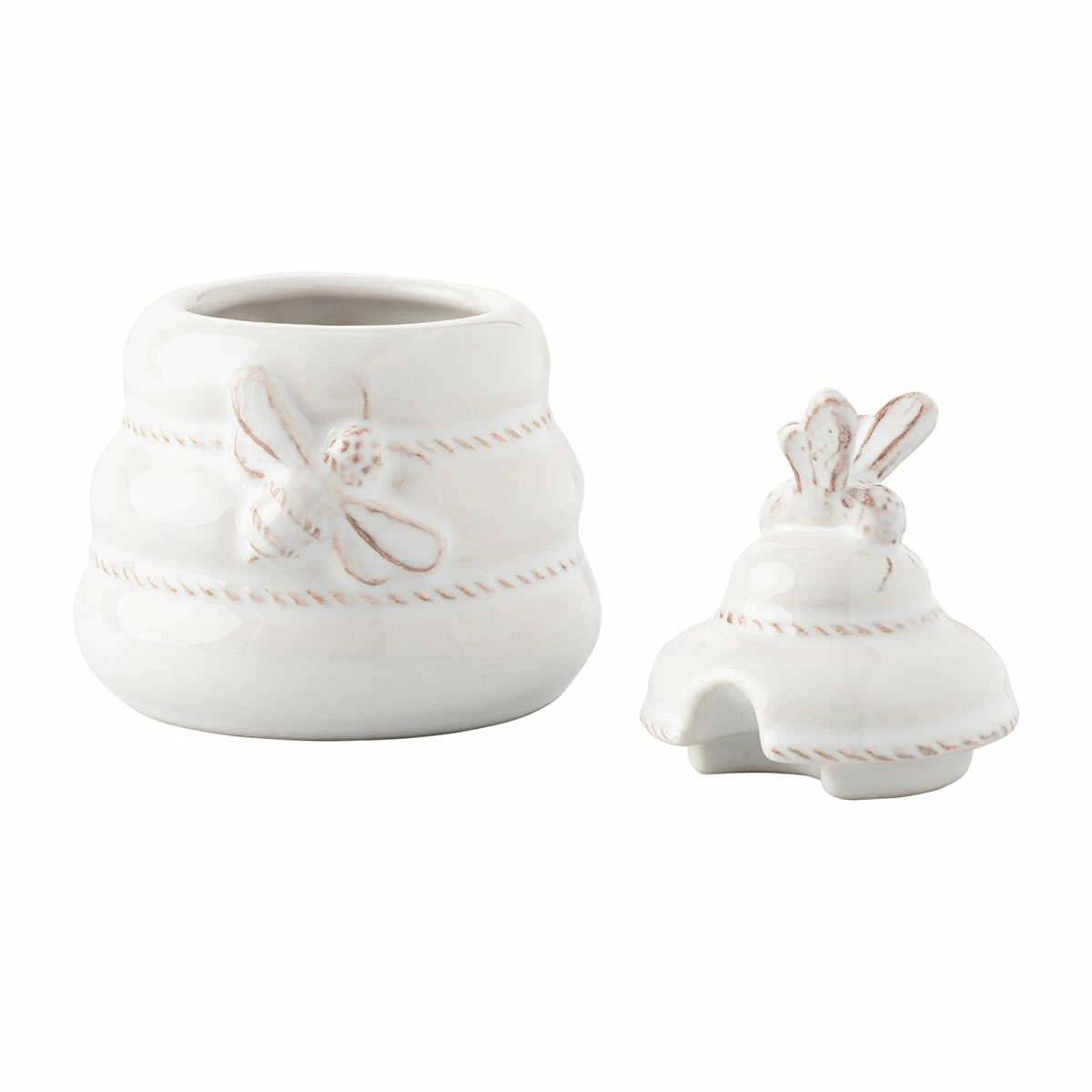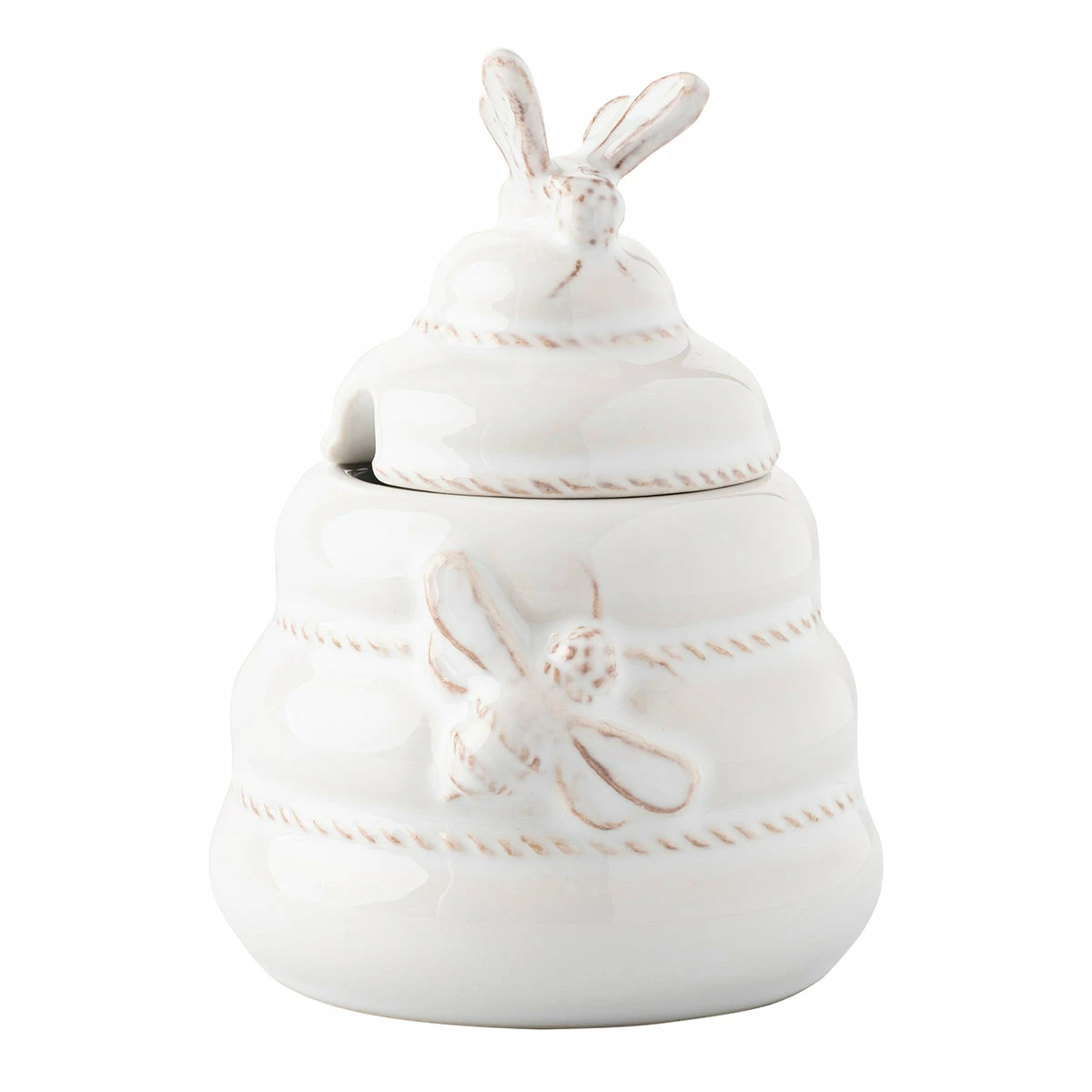 From breakfast to tea time, this beautifully sculpted ceramic hive gives a home to your favorite honey – with a lid and wooden spoon for serving.