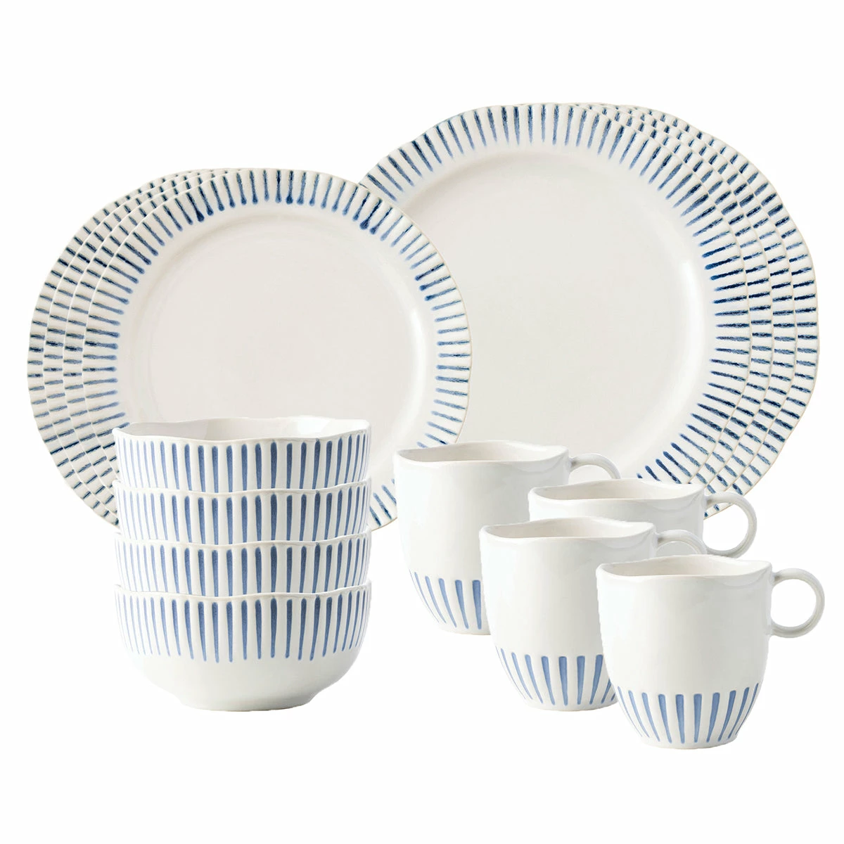 Equally stunning and simplistic, radiant stripes in breezy shades of blue adorn this dinnerware collection. This 16 piece set provides service for four and includes 4 dinner plates, dessert/salad plates, cereal/ice cream bowls and cofftea mugs.Â