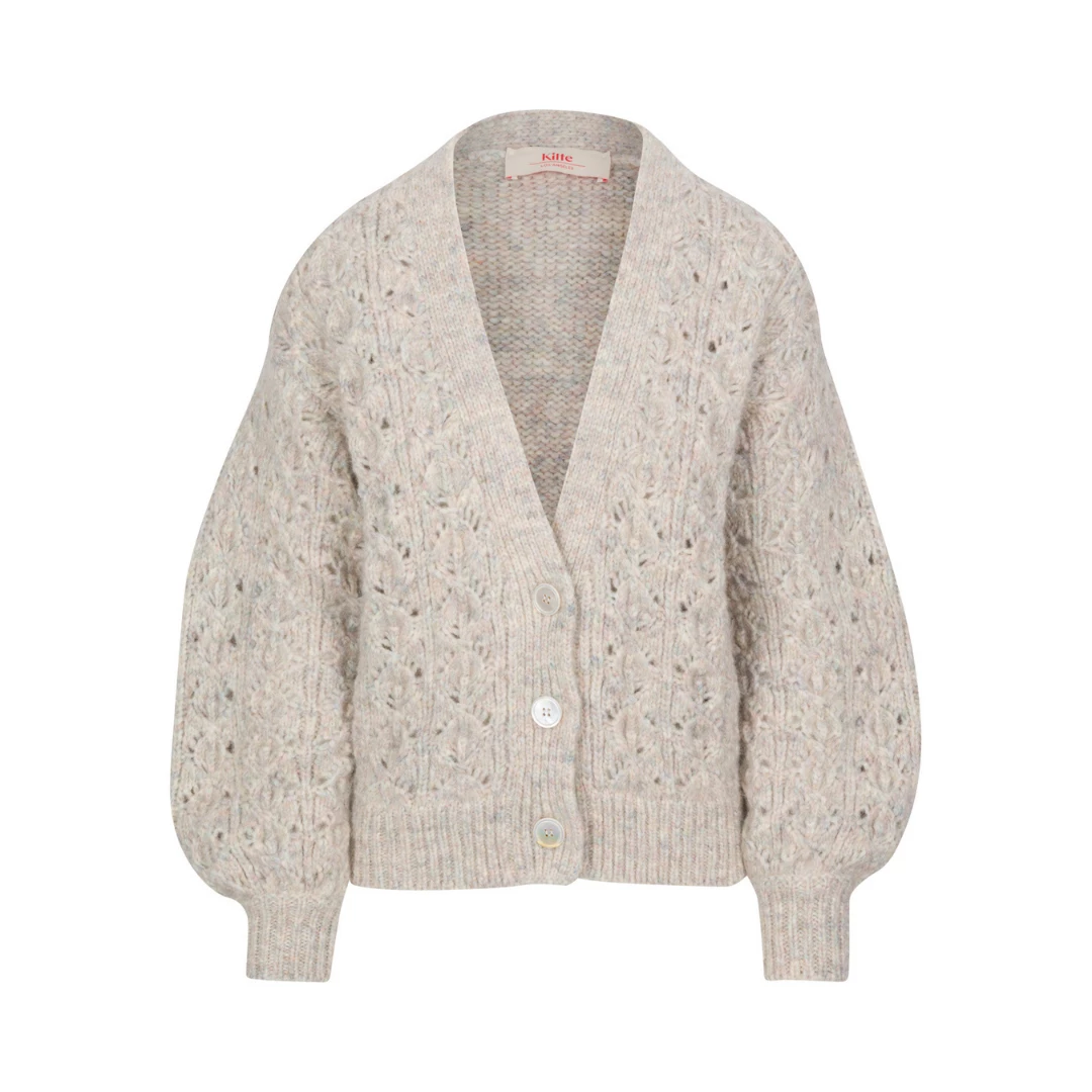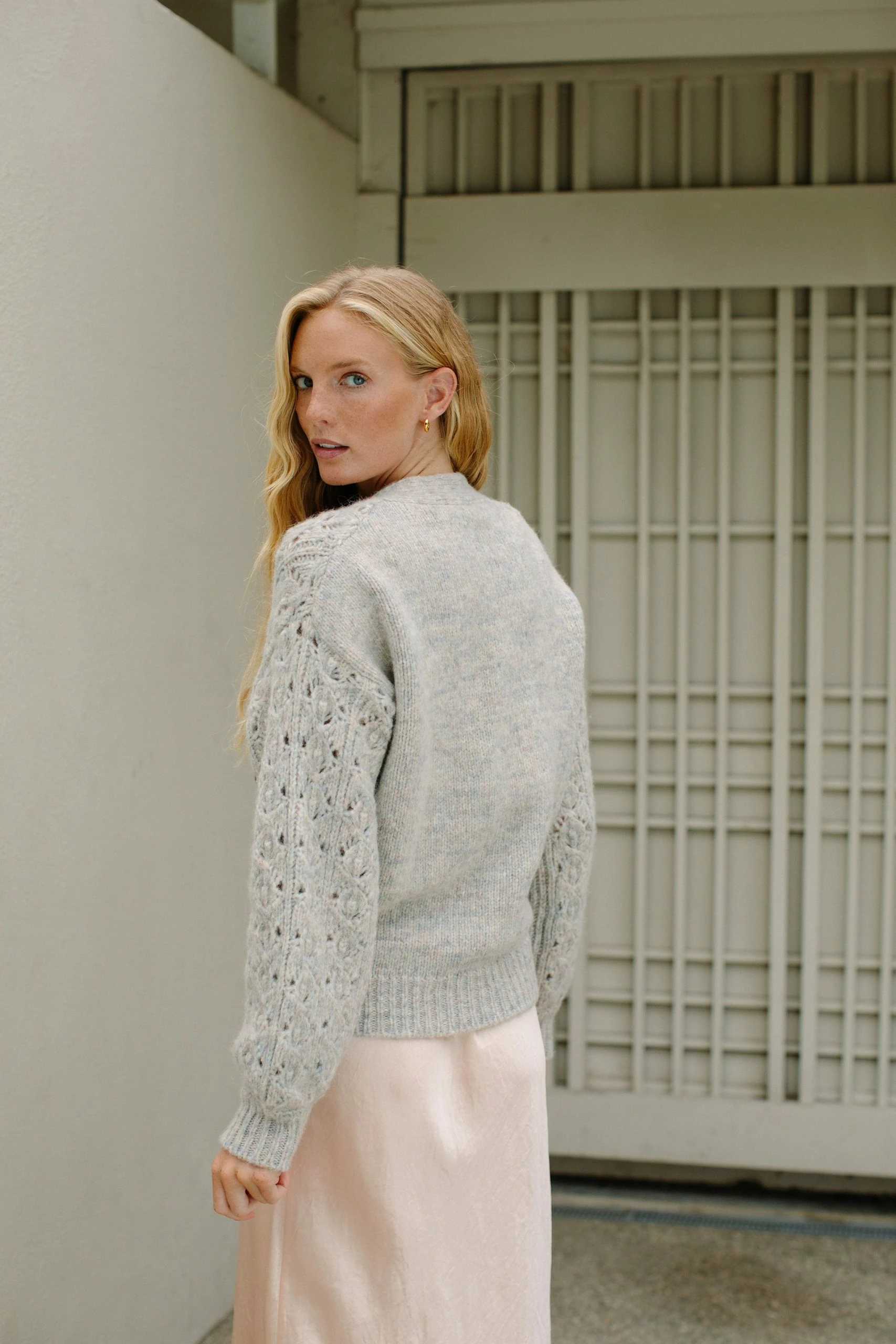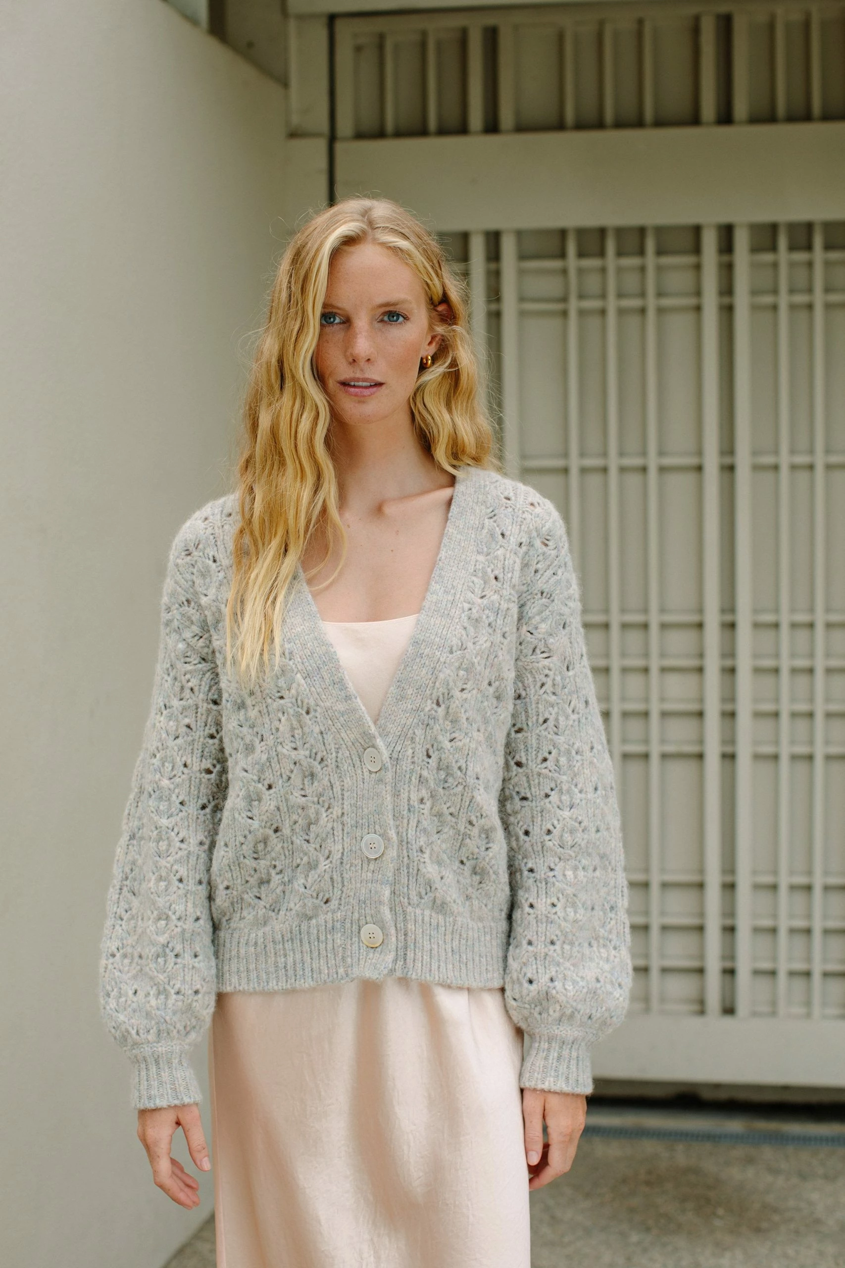 Feel irresistibly familiar? Made with a soft alpaca blend, the Lucy Cardigan features an oversized silhouette and eye-catching pointelle details. Button up in mother of pearl fasteners. 100% made in Italy.