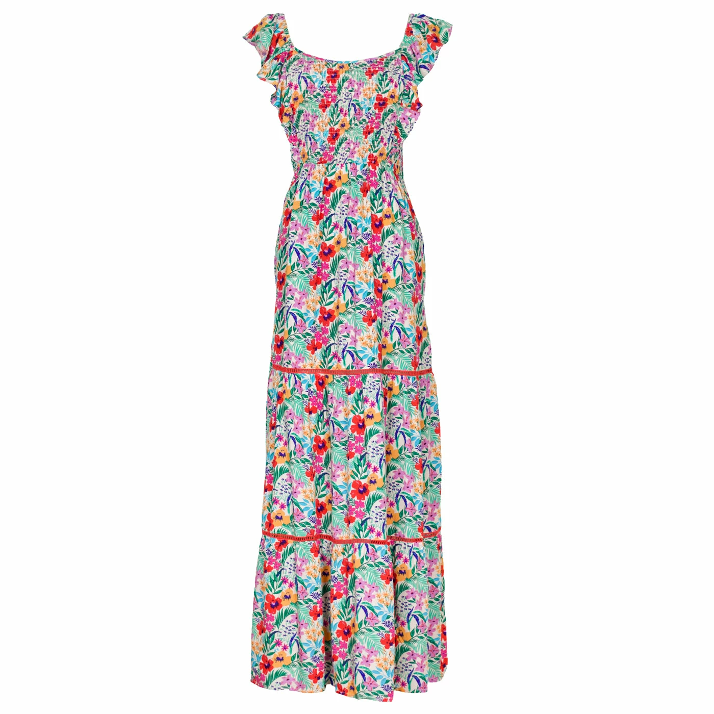 The All Summer Long Maxi Dress features a smocked bodice with a flowy tiered maxi skirt, baby ruffle sleeves, and hidden side pockets.