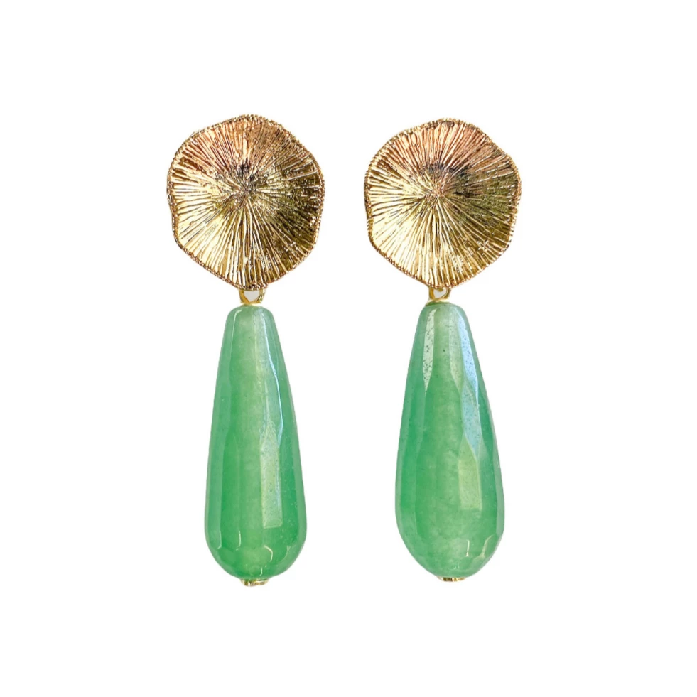 Gold-plated disc earring posts with elegant green quartz gemstone drop.