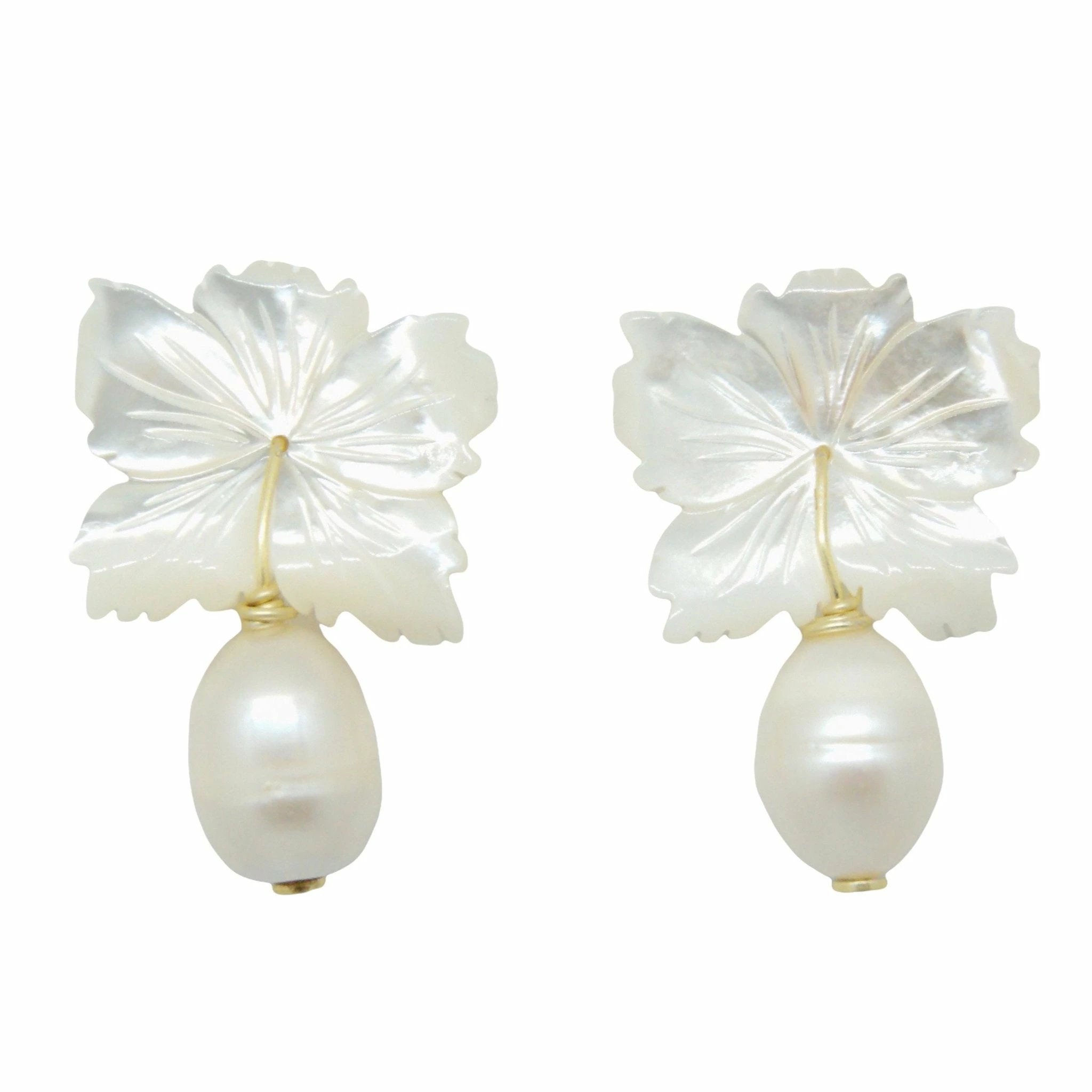 Carved Mother of Pearl flower earrings with white freshwater pearl drop. You will want to wear these timeless earrings all year long.