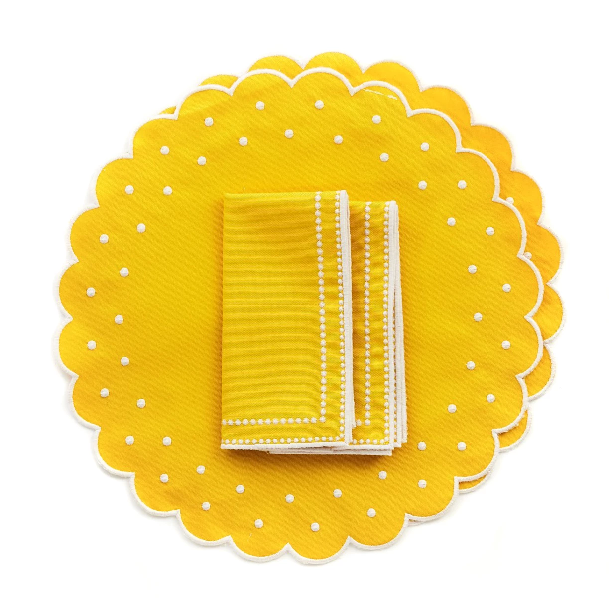 Dress your table with these stylish and elegant yellow placemats with a white embroidered trim and matching yellow napkins