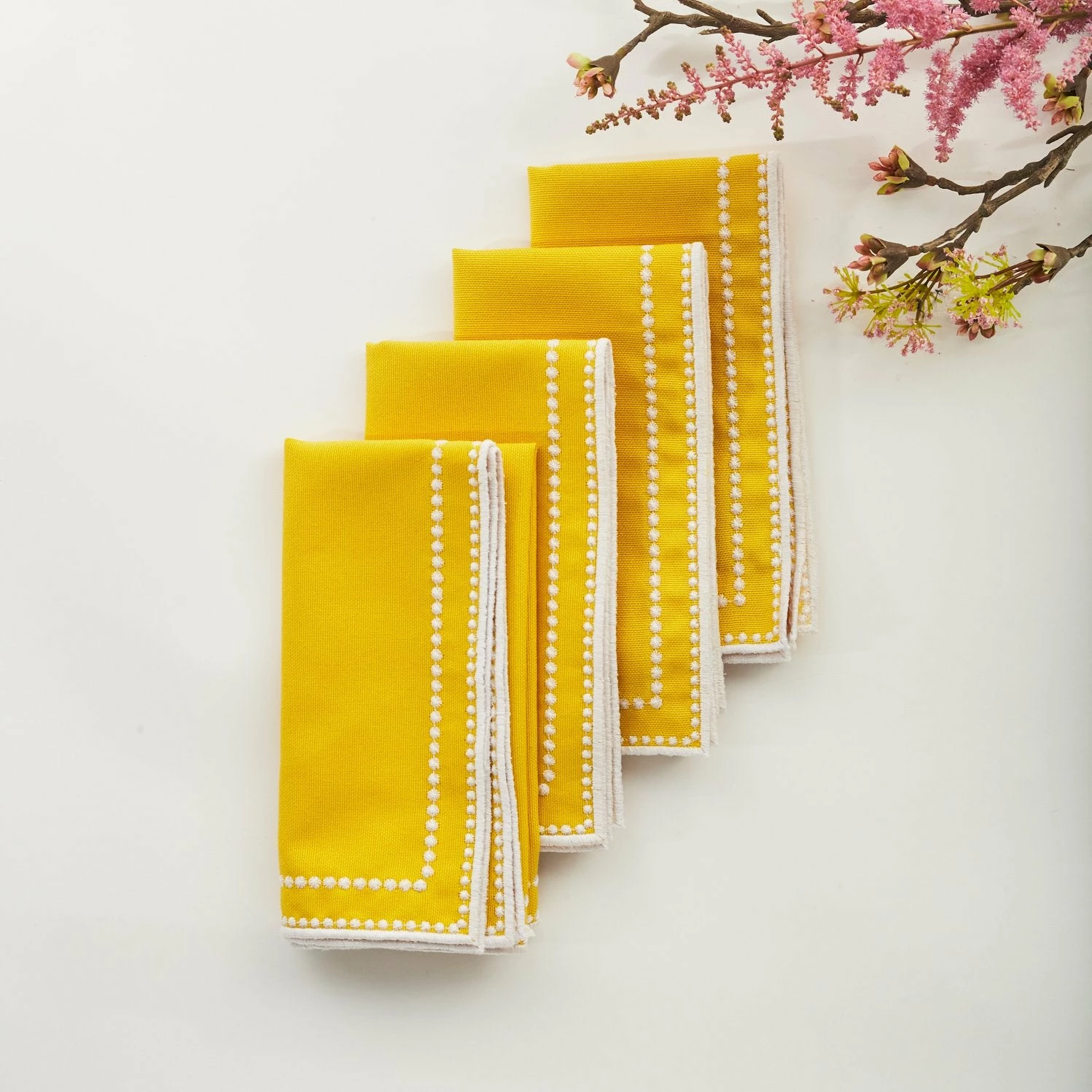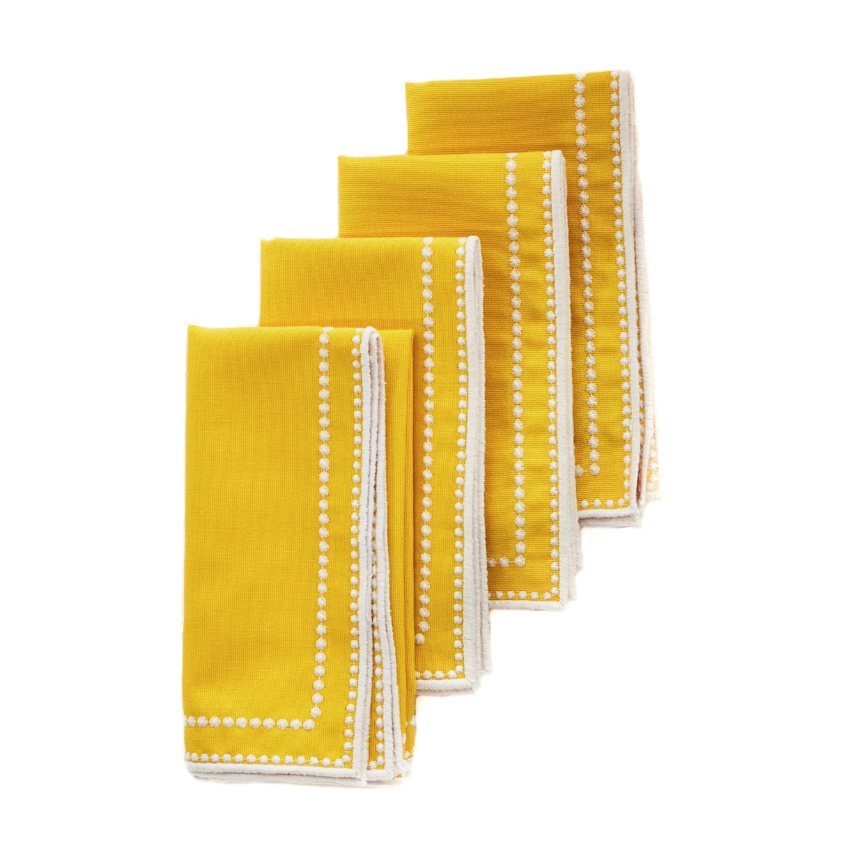 Their handmade, exclusive Margaux Yellow Napkin brings a dash of color to any table. These stylish and elegant yellow napkins are embroidered with a white trim. This classic design is timeless.