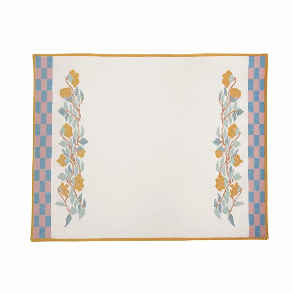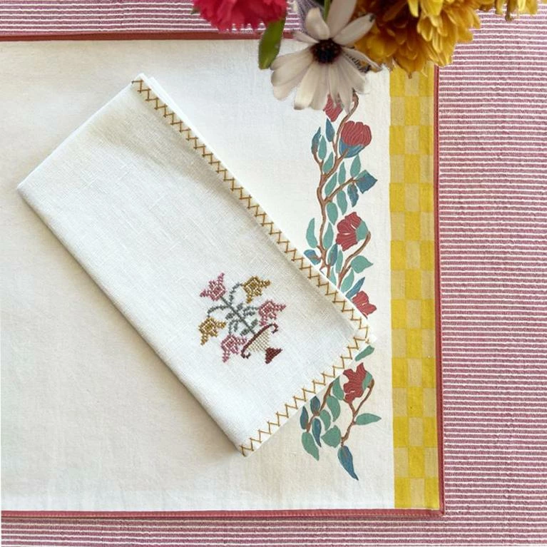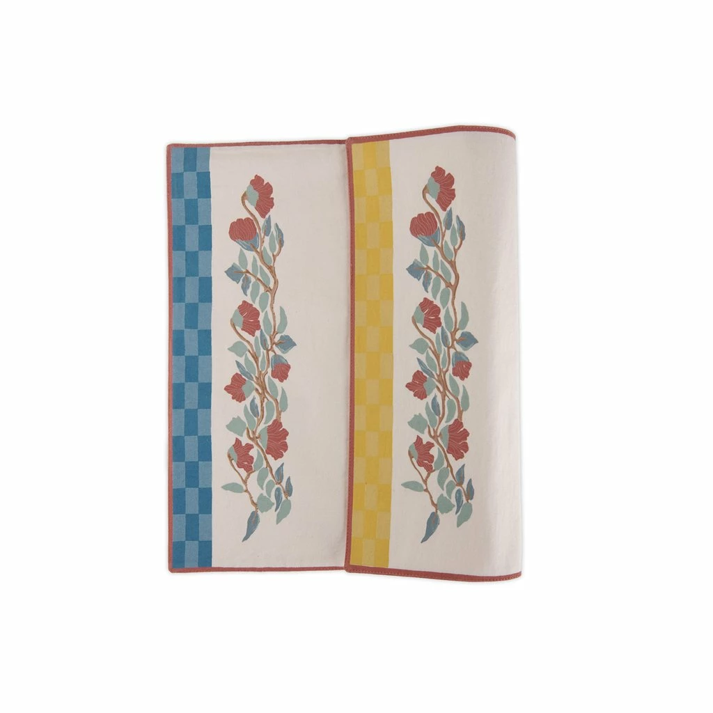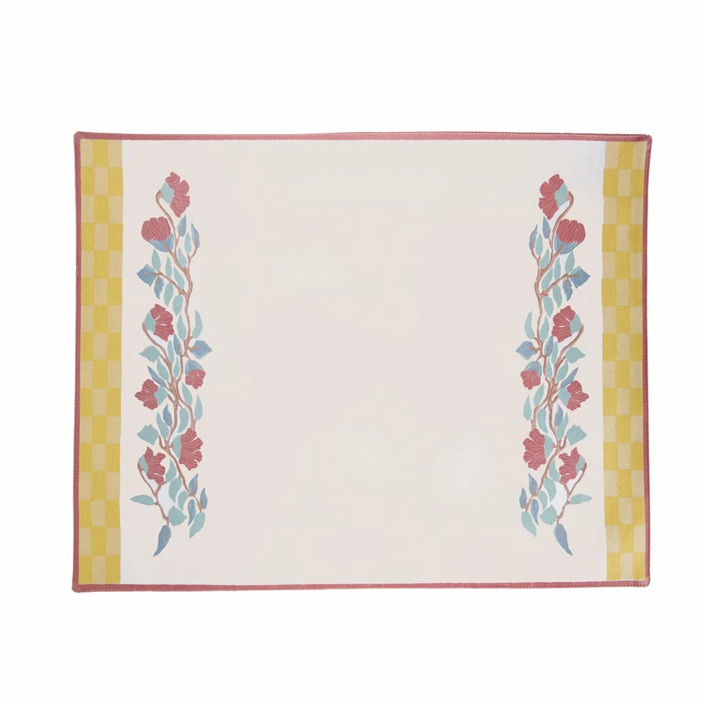 Adorned with a lively floral and chequerboard pattern inspired by tapestries from the Wissa Wassef Art Centre, these stylish placemats will bring summer joy to your table. With a bold colour variation on either side, they are undeniably playful and versatile.