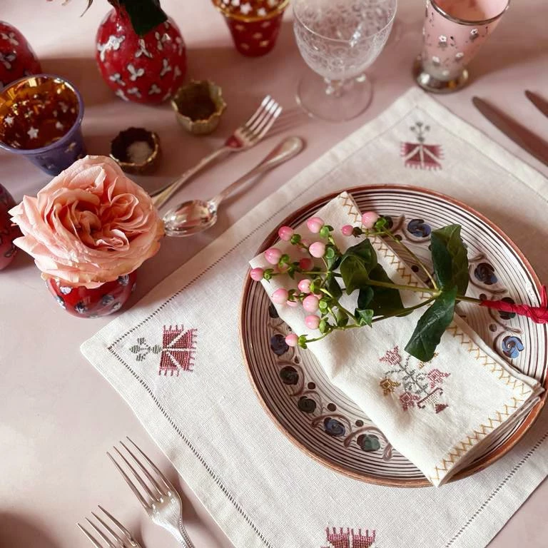 These stunning placemats feature a hand-embroidered carnation motif inspired by Ottoman floral samplers and are delicately finished with hand-drawn needlework. Bold yet elegant, they will set the tone for a fun dinner party.