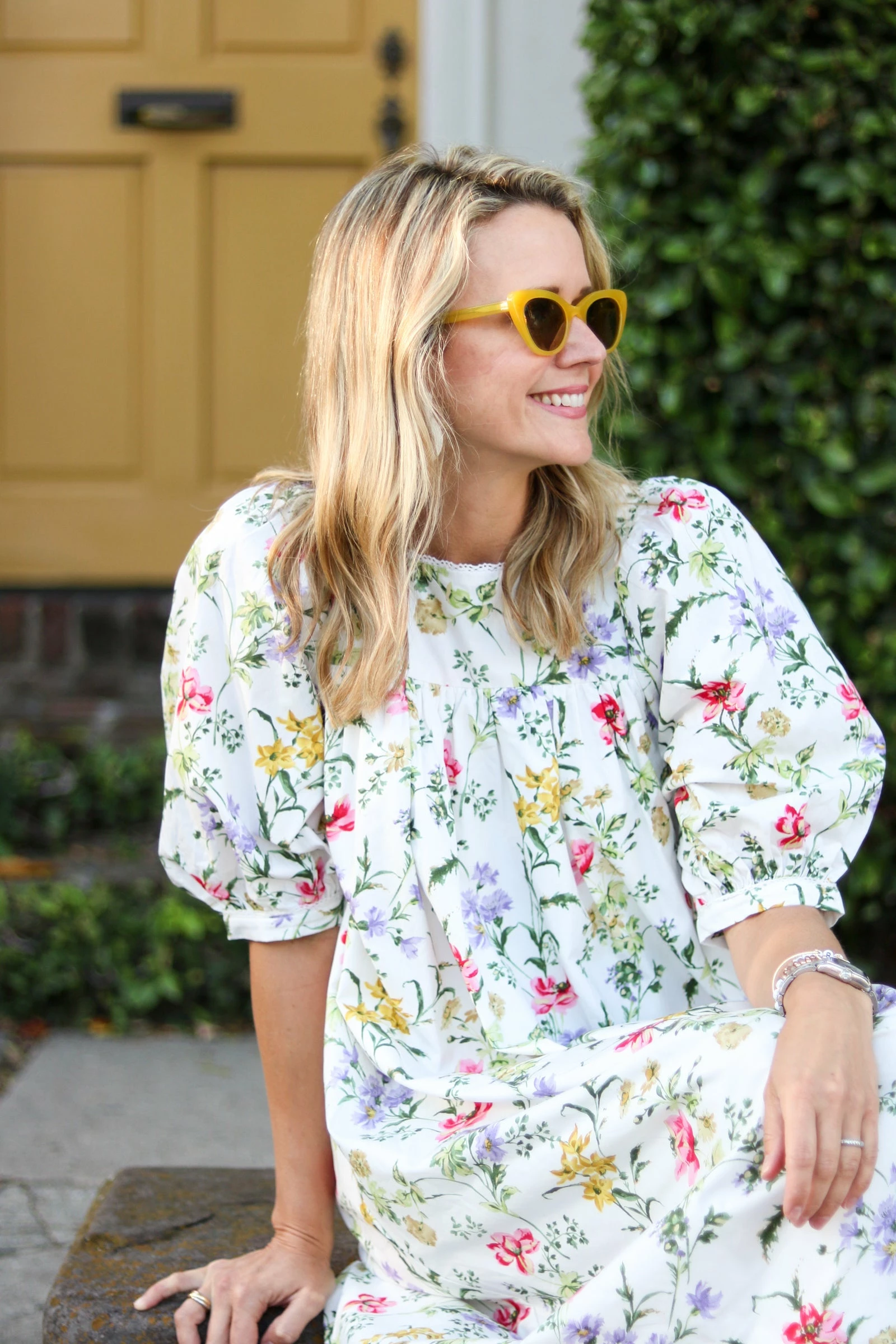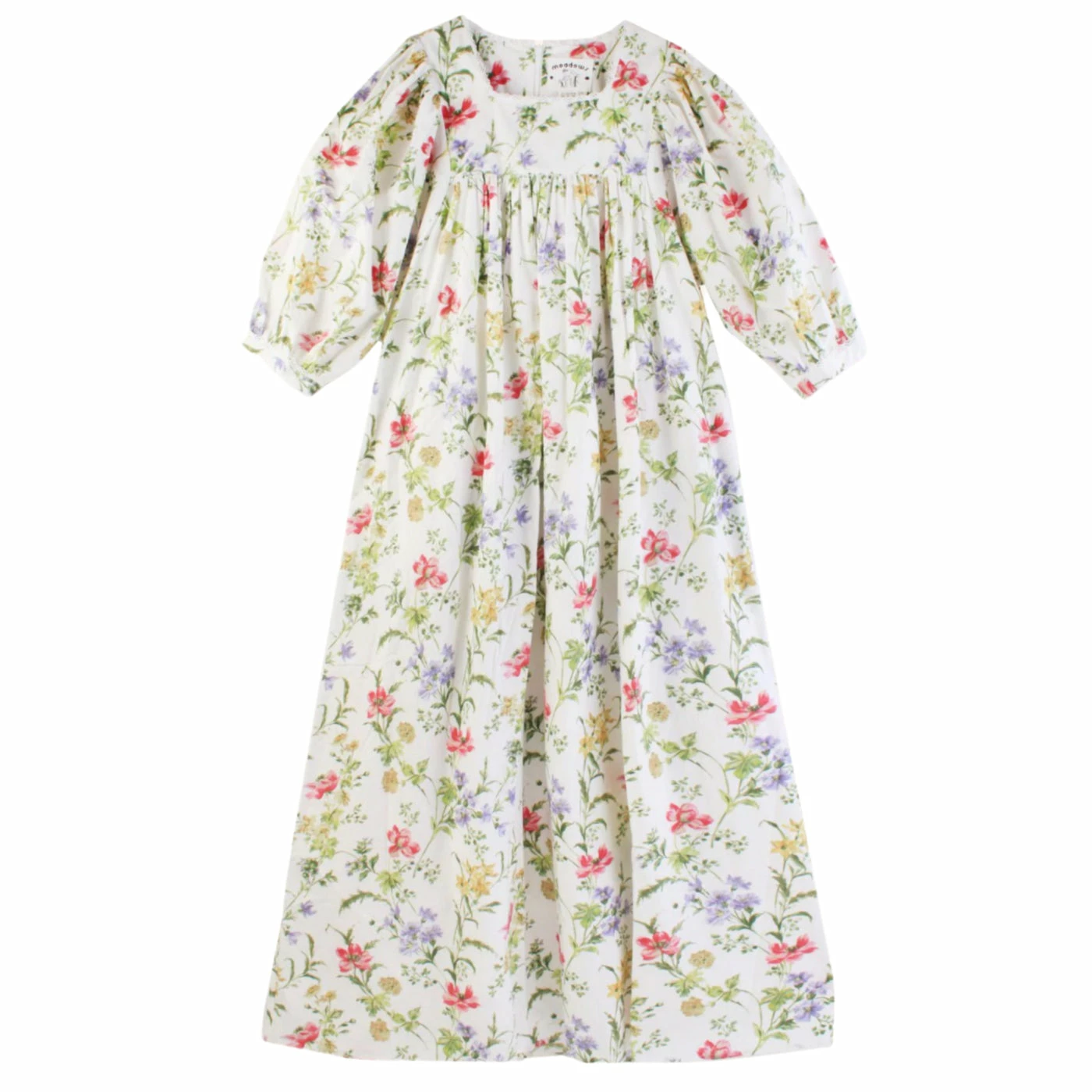 The Crocus Dress features a square neckline and 3/4 length voluminous sleeves gathered at the cuff and shoulder.