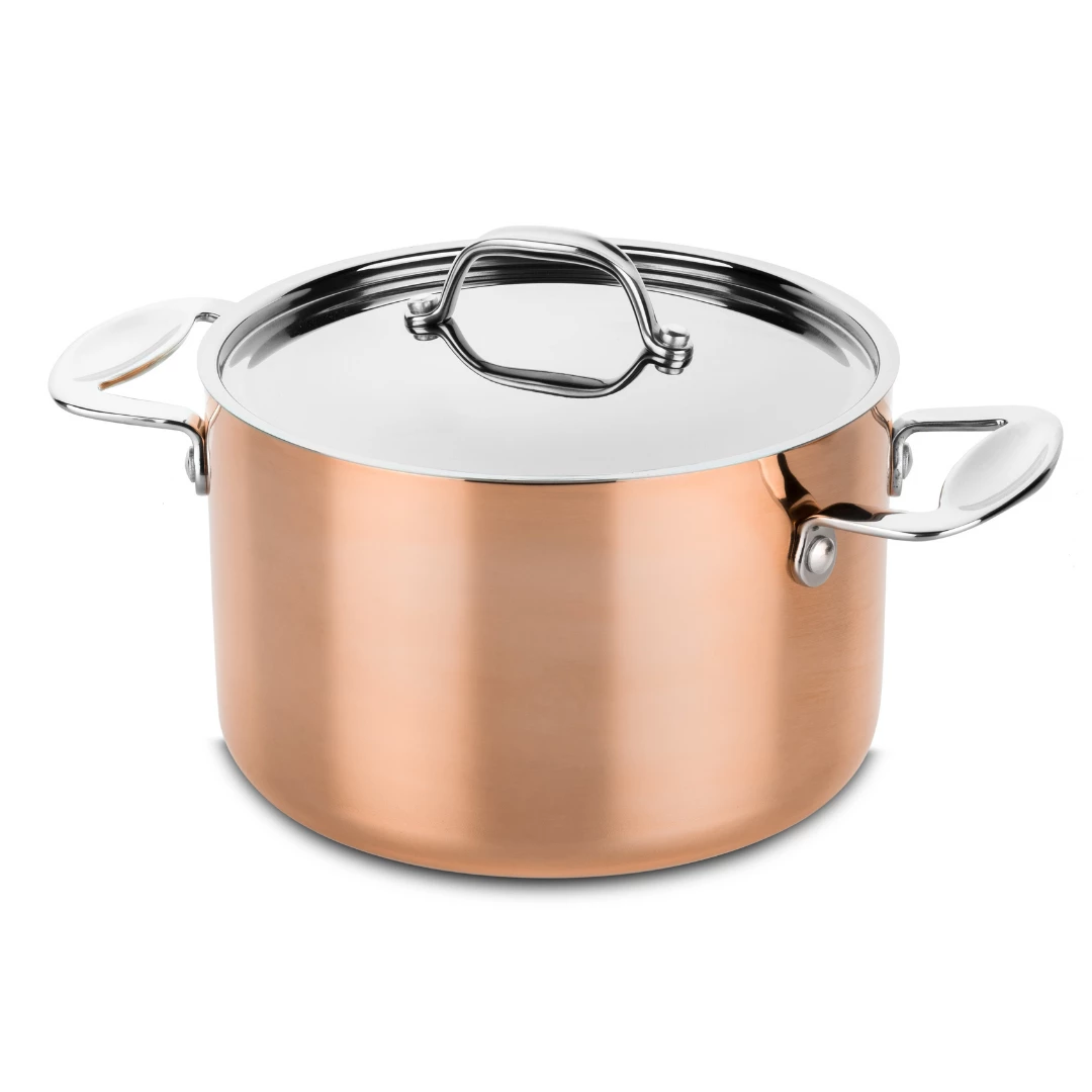 Copper allows optimal heat conduction, while aluminum forms the connection between the thermal conductivity of the copper and the strong stainless steel inside. This combination of materials provides the advantages of copper and the benefits of stainless steel. After silver, copper is the best conductor of heat. A copper pan allows you to cook with great precision. You can precisely select a temperature and keep the contents of the pan at that temperature for a long time.