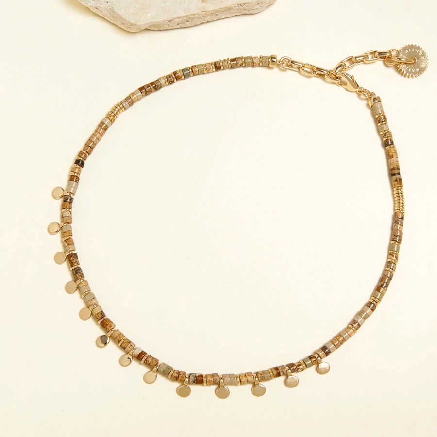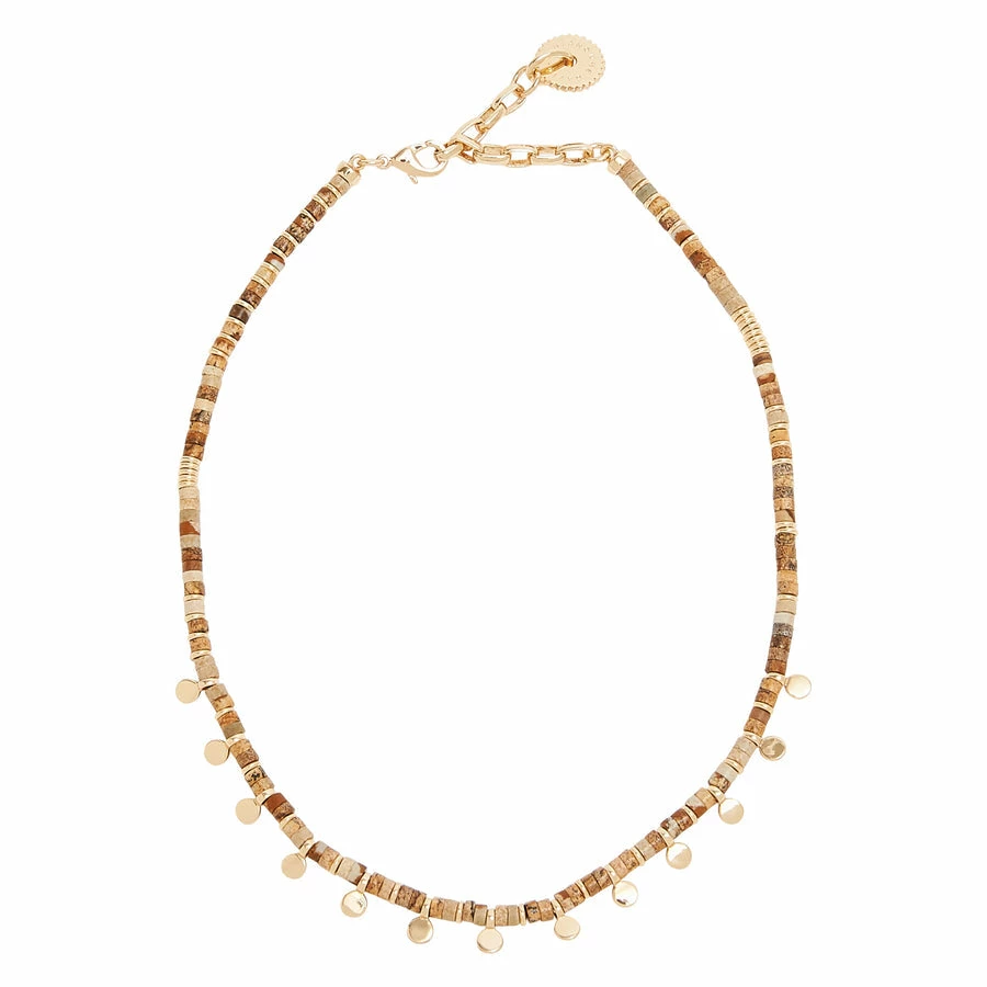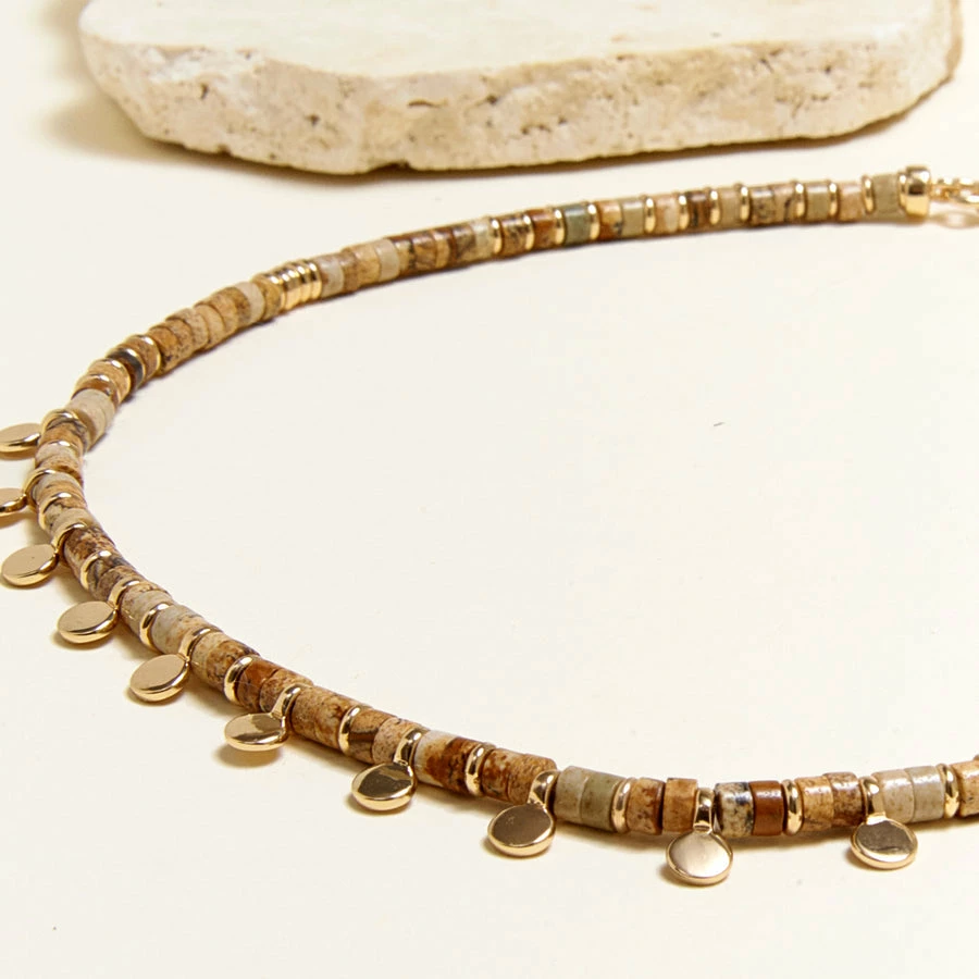A stunning strand of jasper, gold beads, and gleaming golden discs–she was designed to be layered.