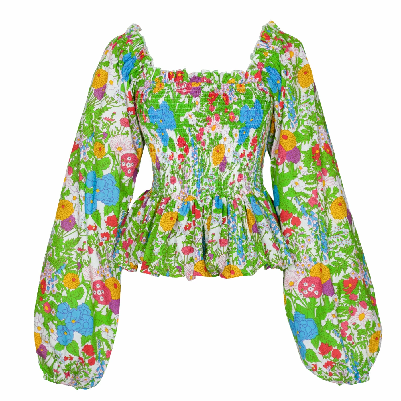 The flirty Circe Top has a smocked body and long peasant sleeves with a ruffle hem. Cute with high waisted jeans or a flow summer pant.