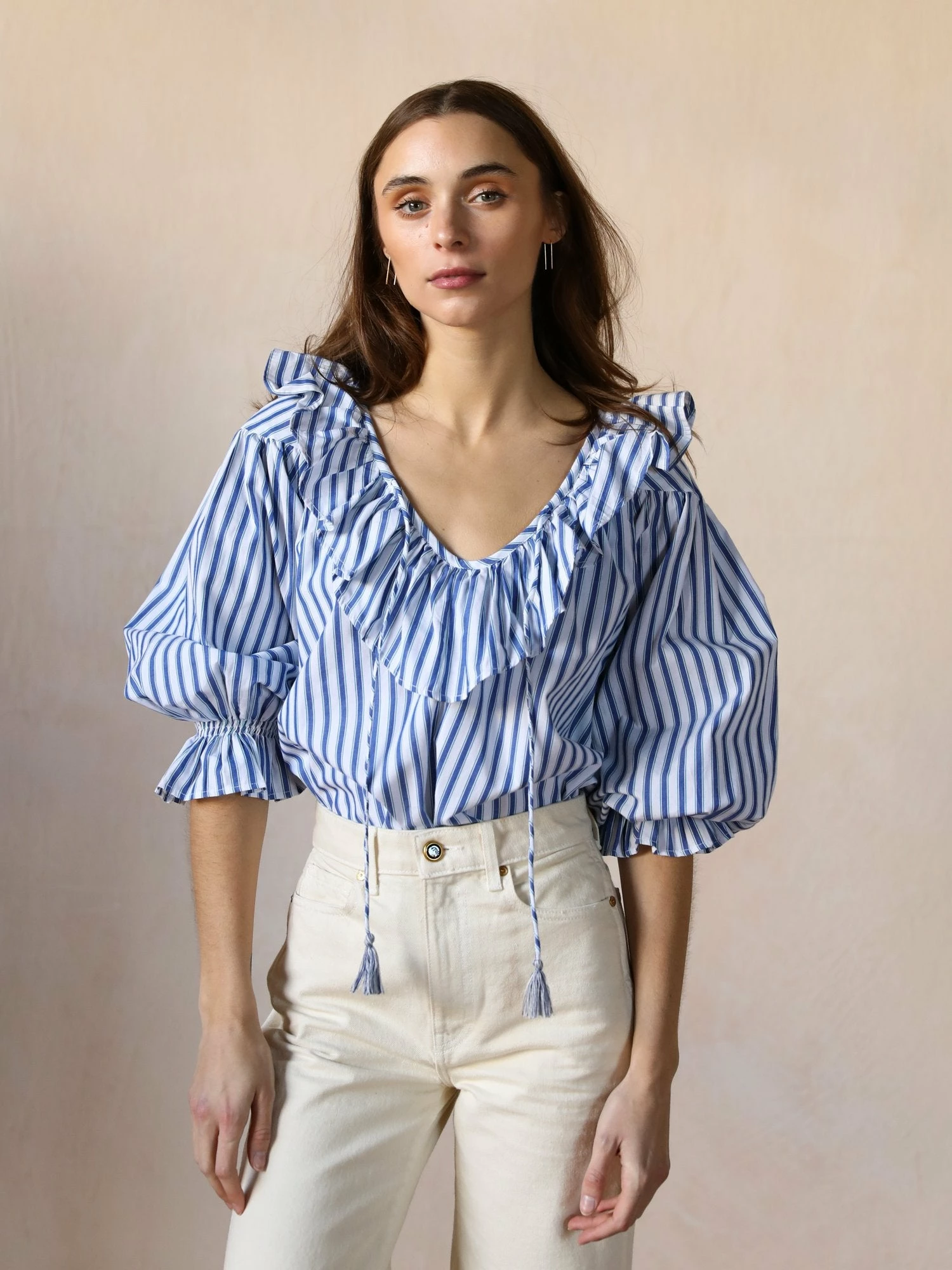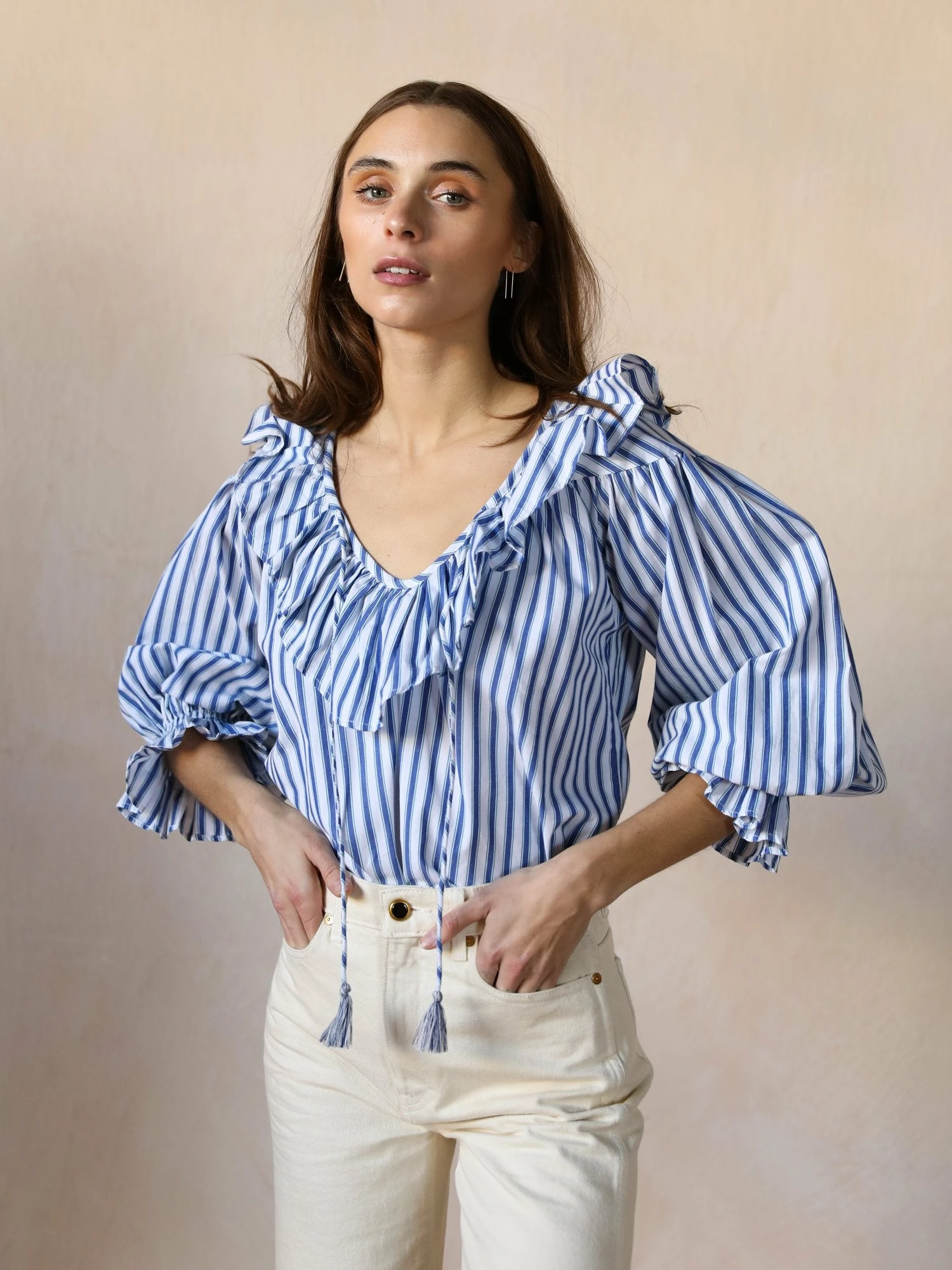 The May top features a soft ruffle neckline with tassled ties and puff sleeves. Feminine and easy.