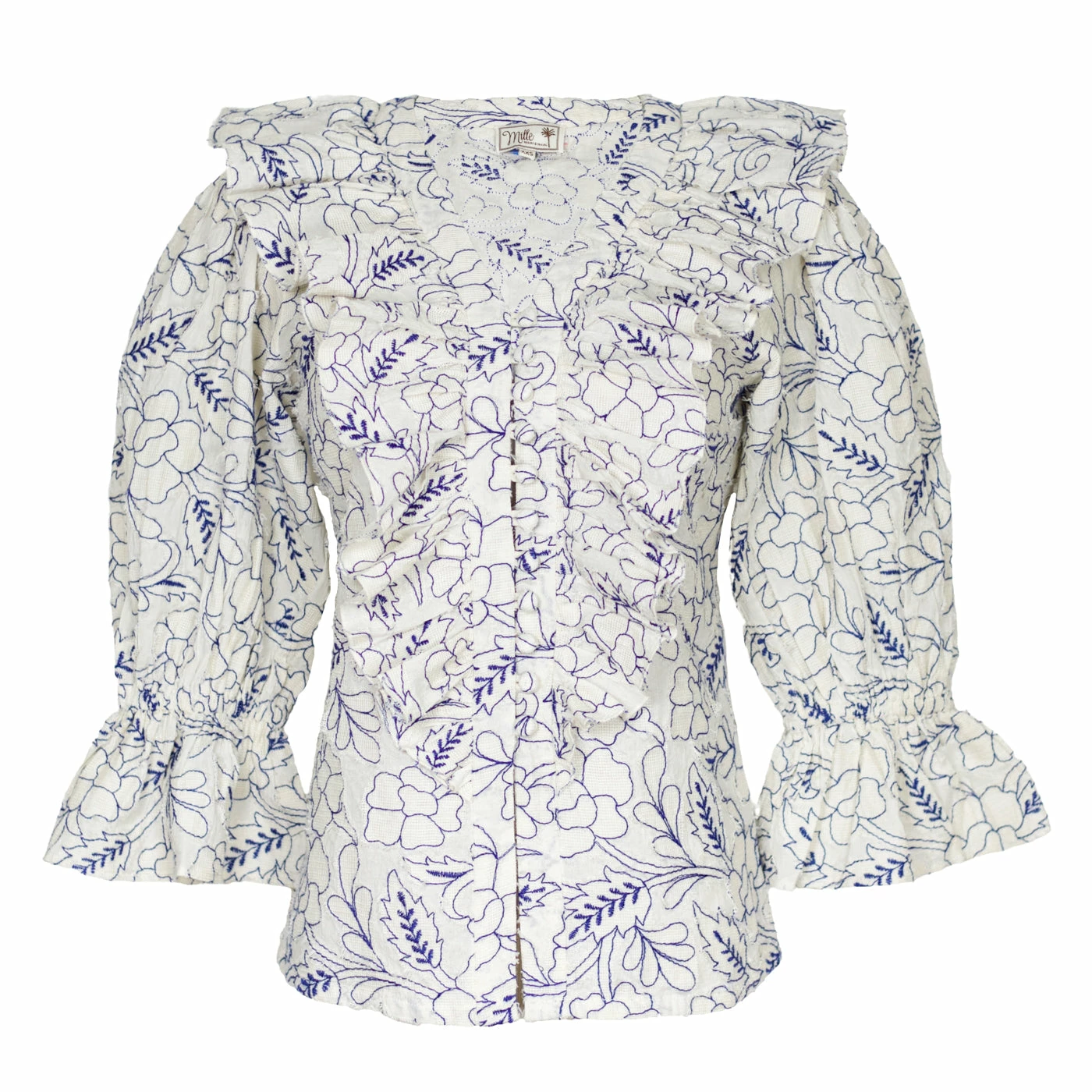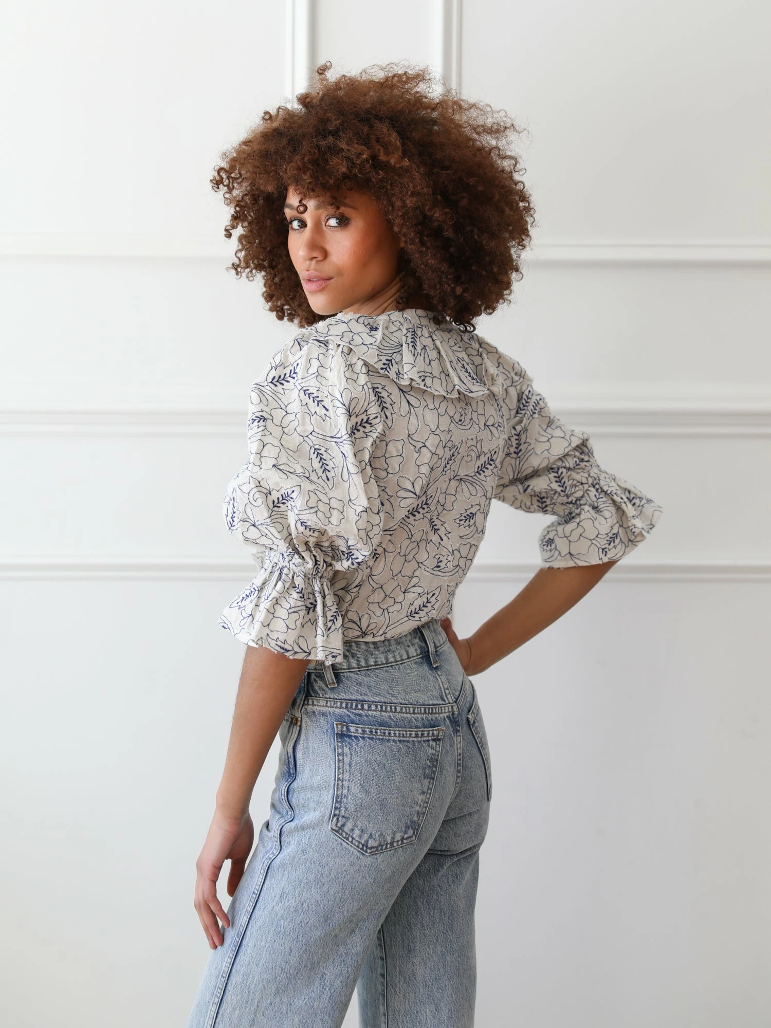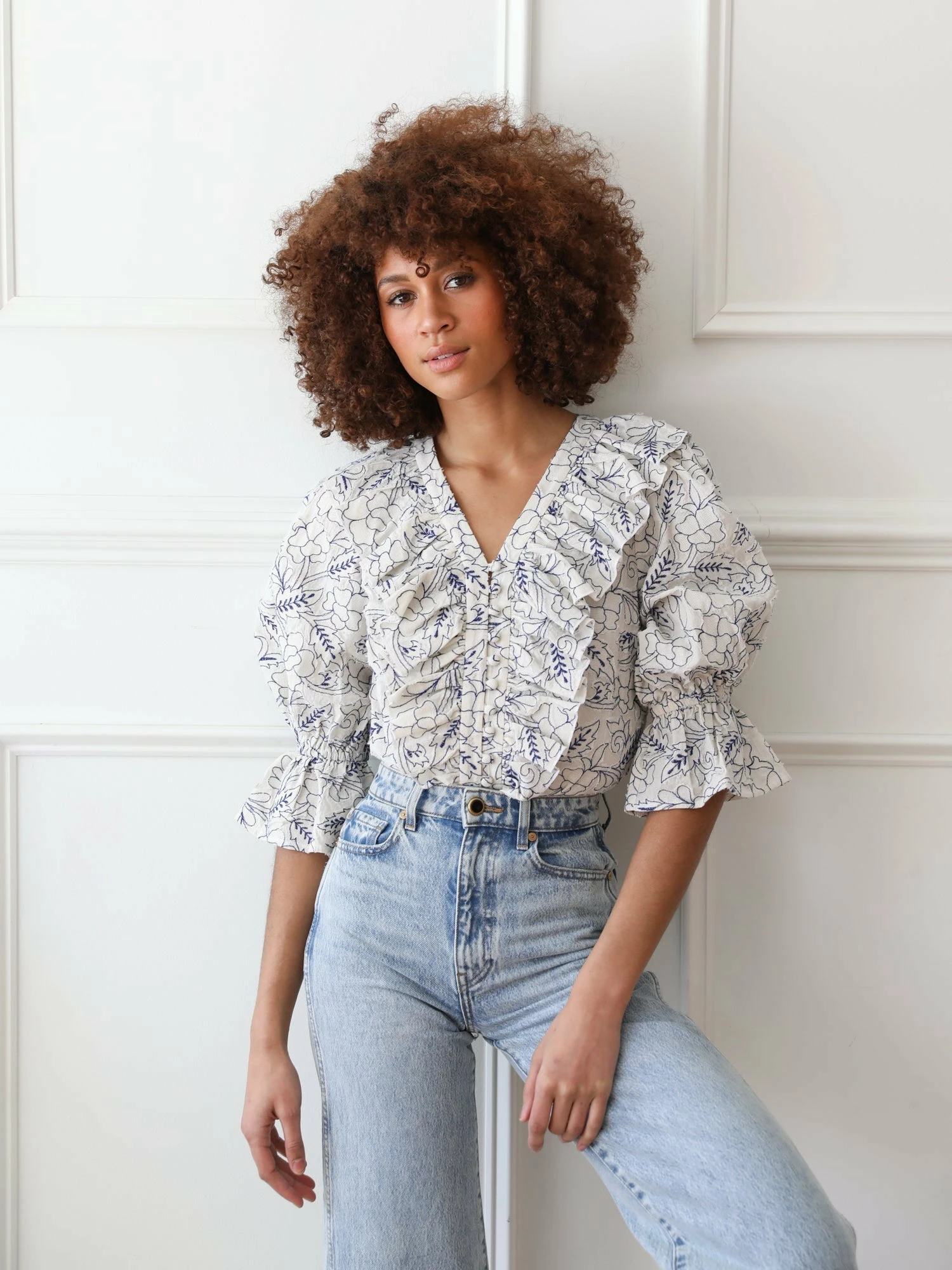 A ruffled neckline and button front give the Hanna top a soft feminine vibe. Easy to dress up or down. Featured in embroidered floral print.