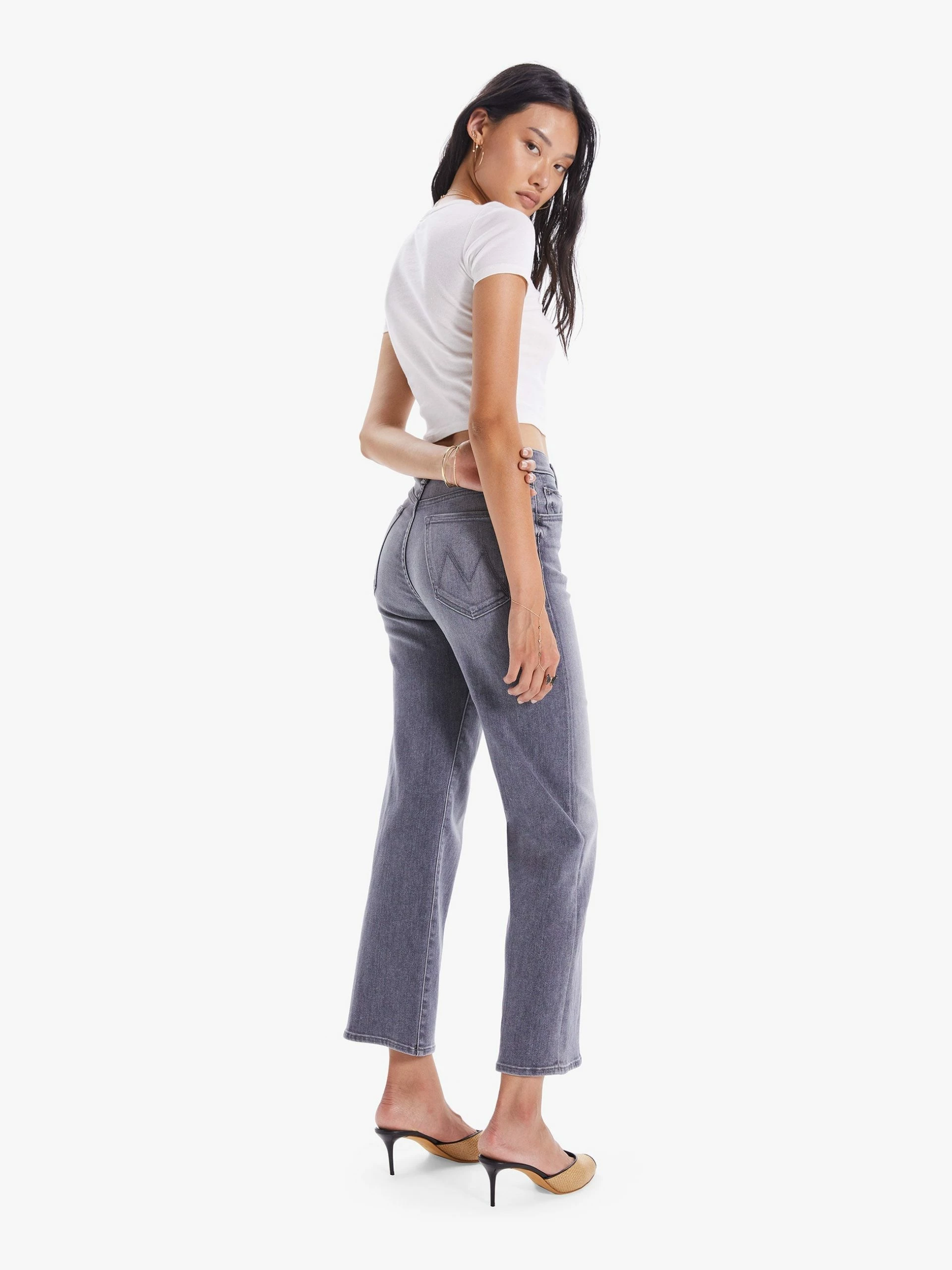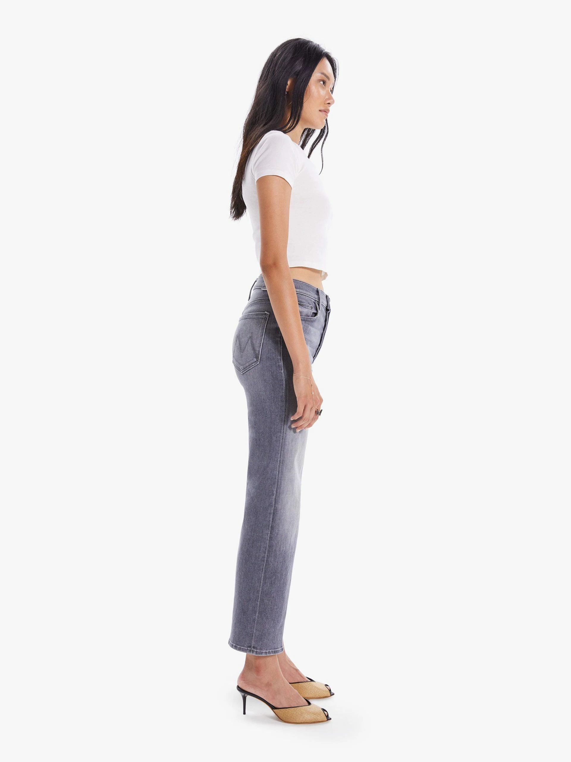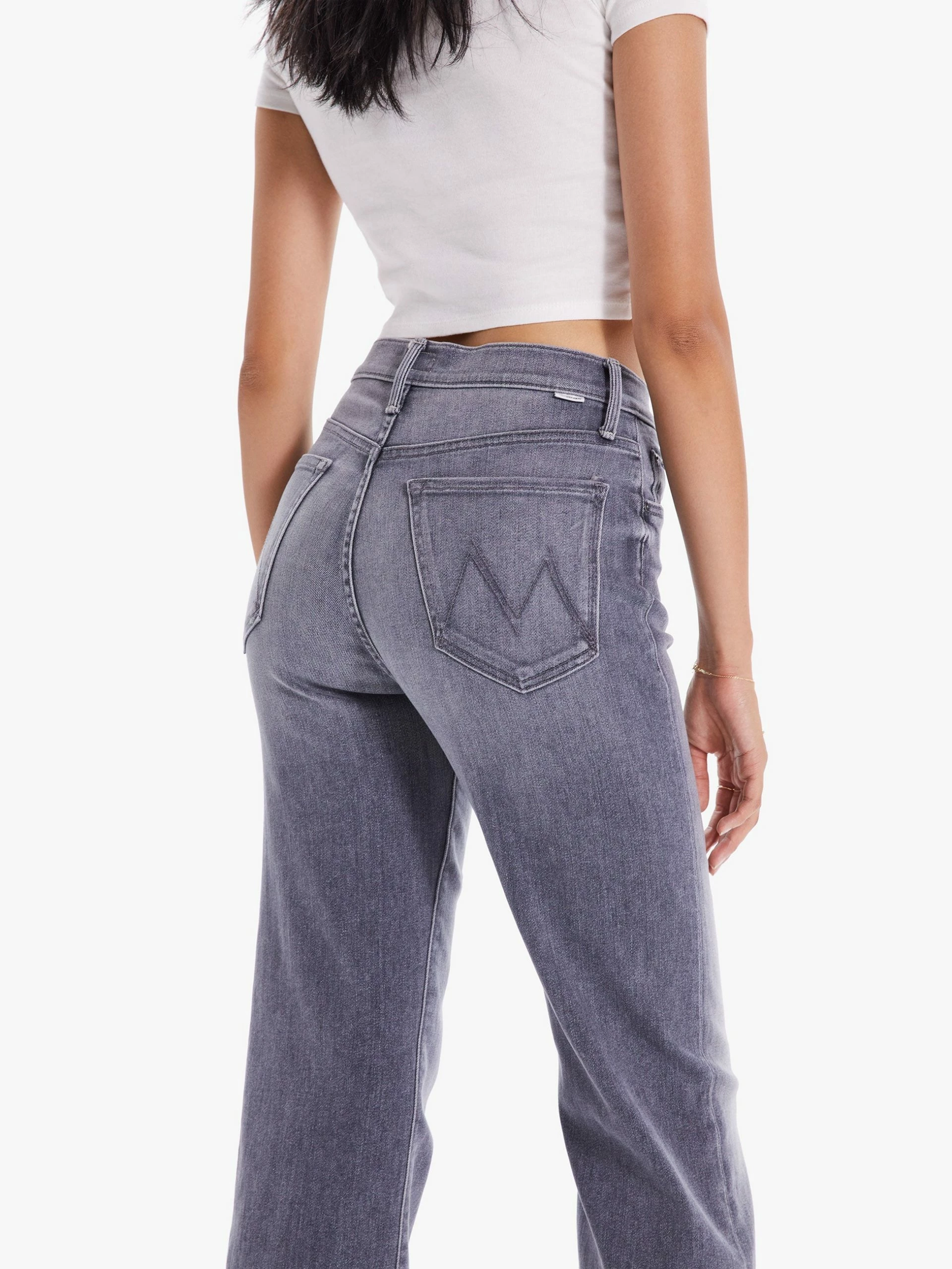 Treble maker. High-waisted jeans with a straight leg, button fly and clean ankle-length inseam. Crafted from stretch denim, Bars & Phrases is a light grey wash with whiskering and fading. MOTHER’s mixing up something good.