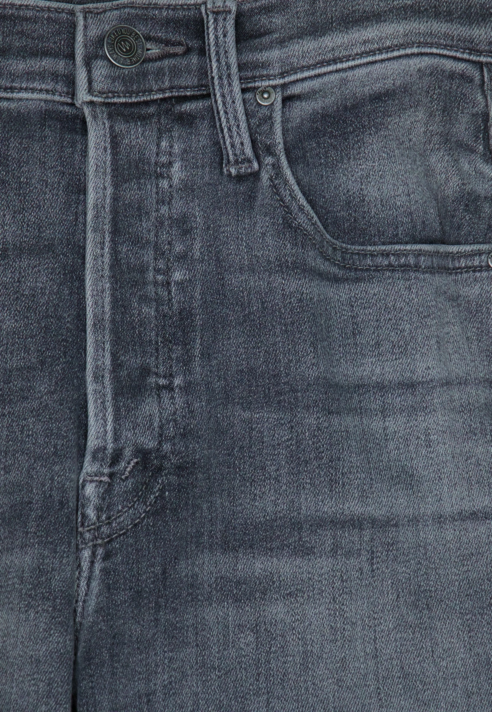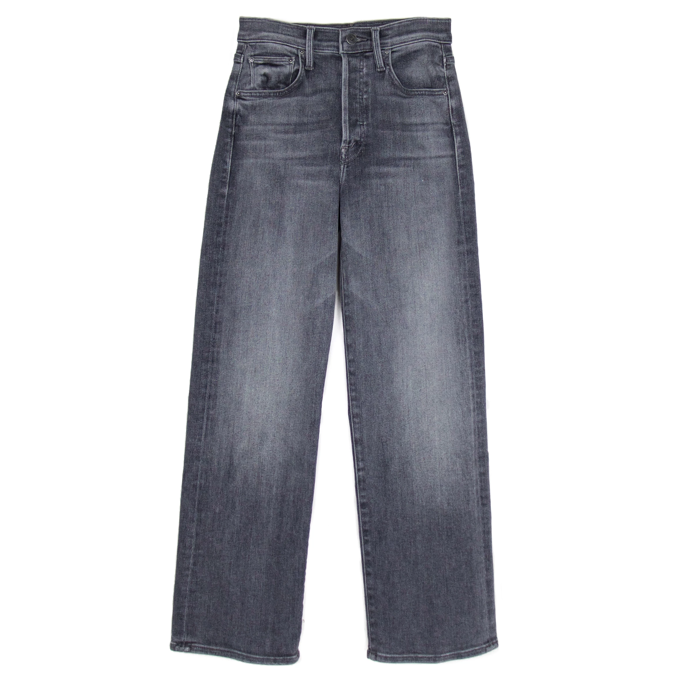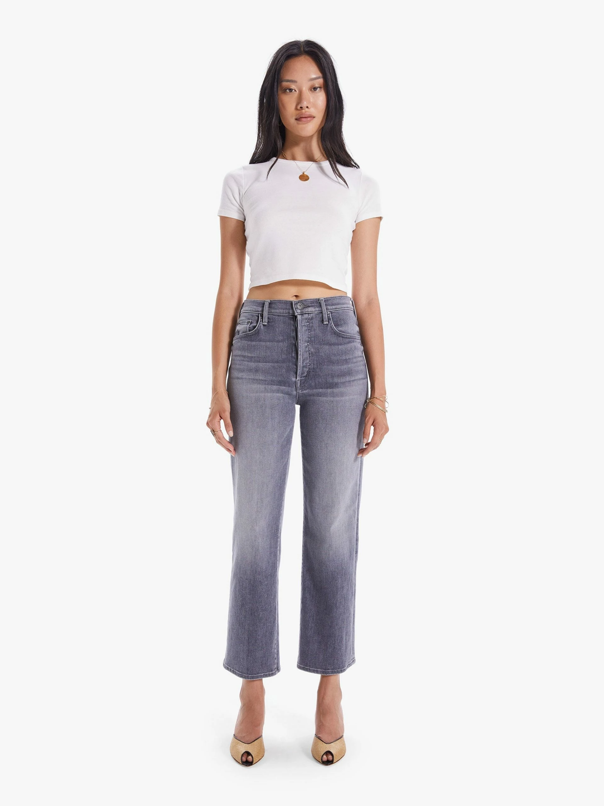 Treble maker. High-waisted jeans with a straight leg, button fly and clean ankle-length inseam. Crafted from stretch denim, Bars & Phrases is a light grey wash with whiskering and fading. MOTHER’s mixing up something good.