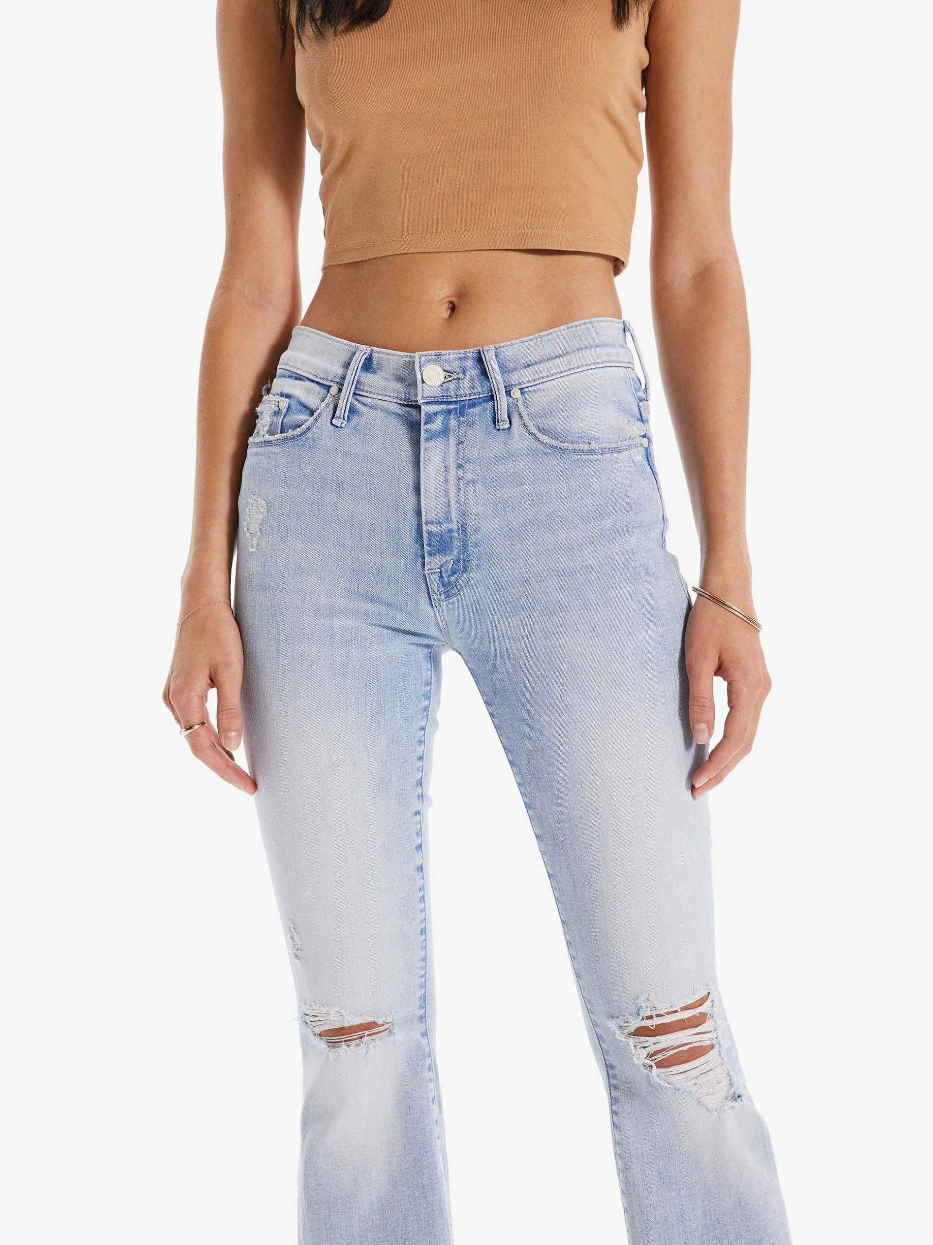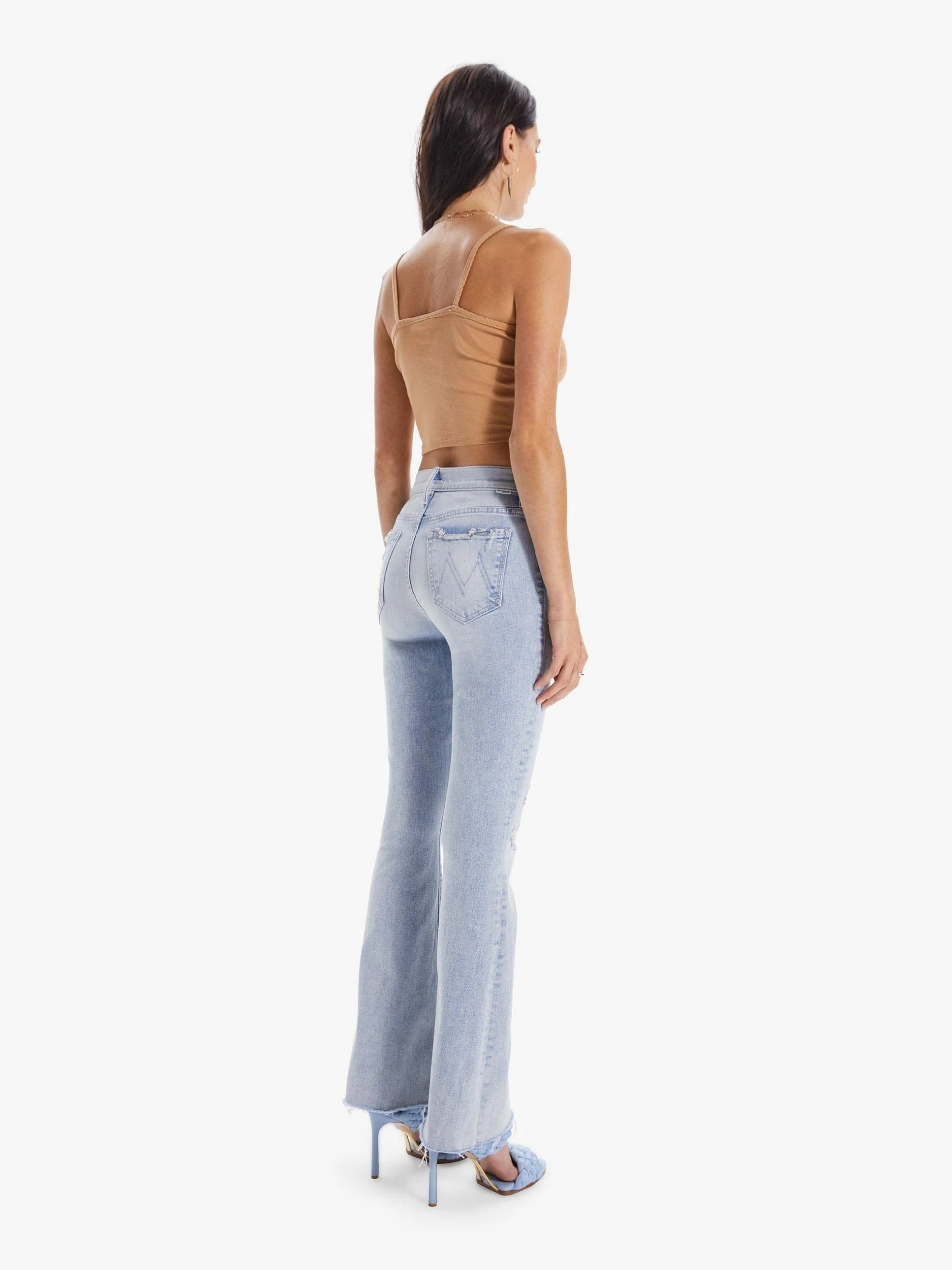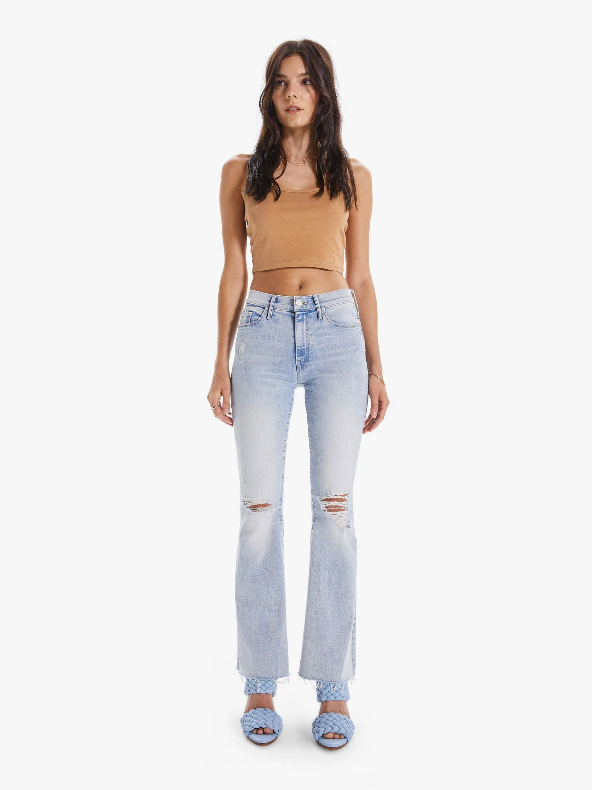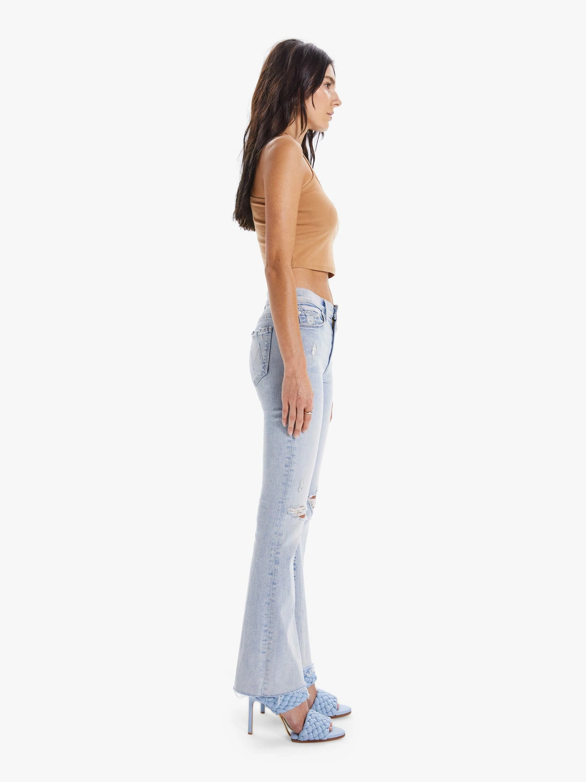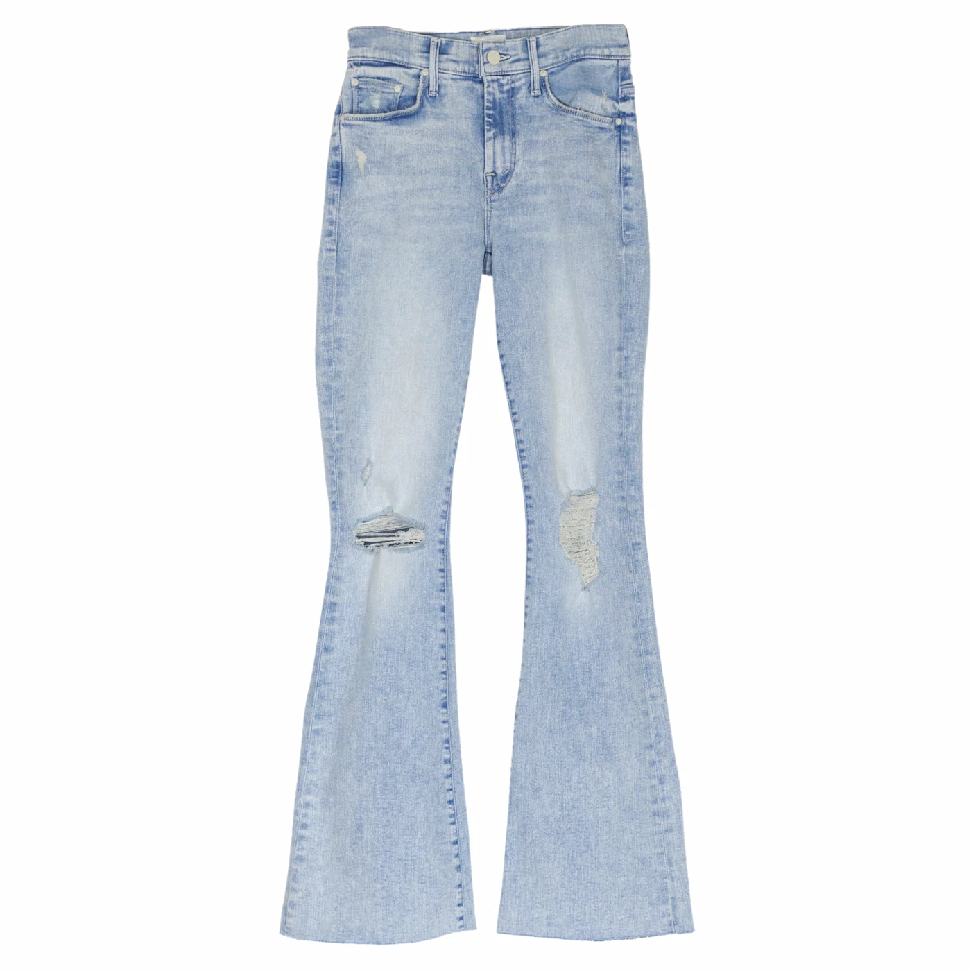 Mother Denim does it again. These mid-rise flare jeans have a 31-inch inseam and a raw hem. Cut from stretch denim, Action Shot is a light wash with fading, distressing and rips at the knee.