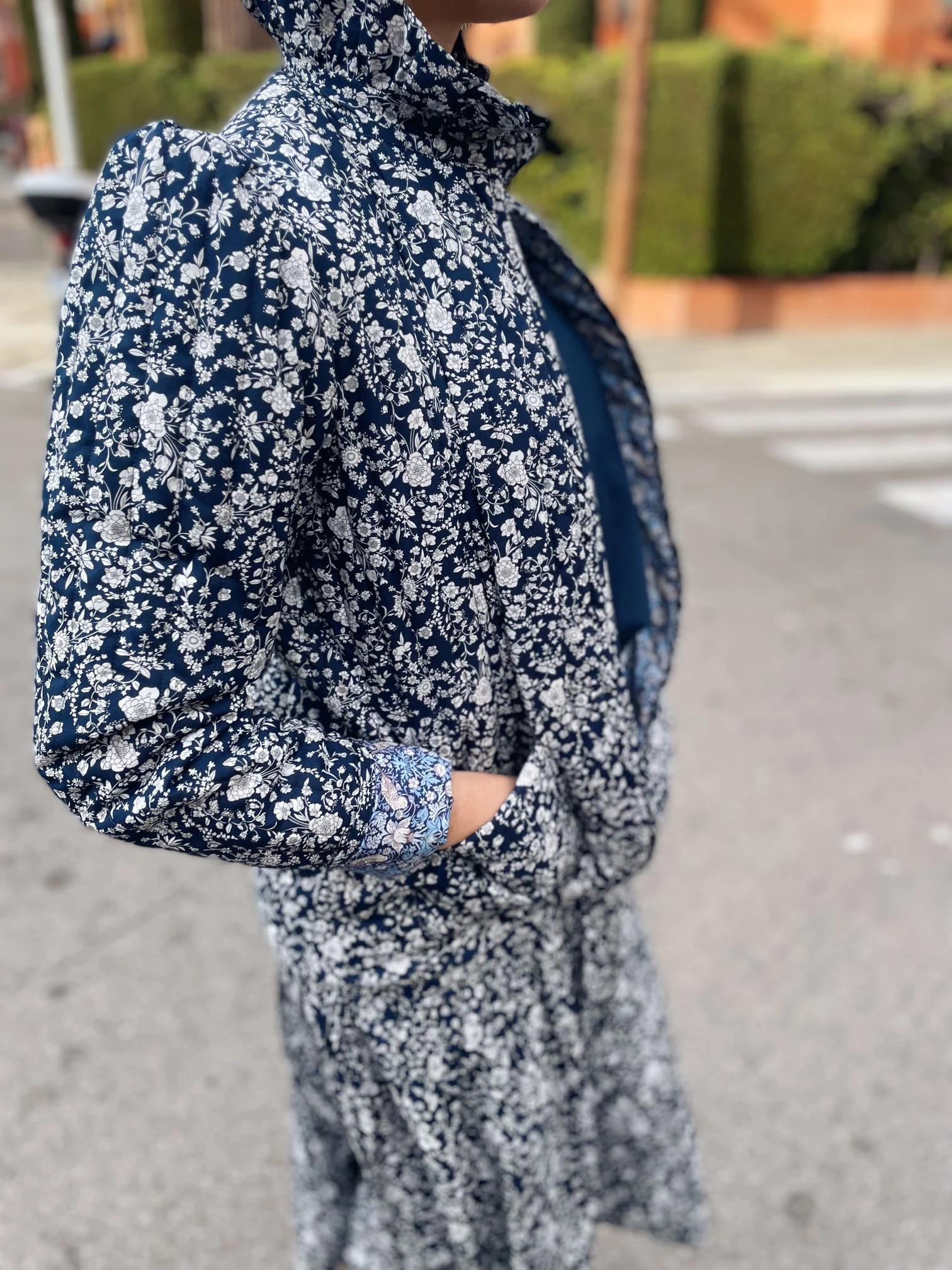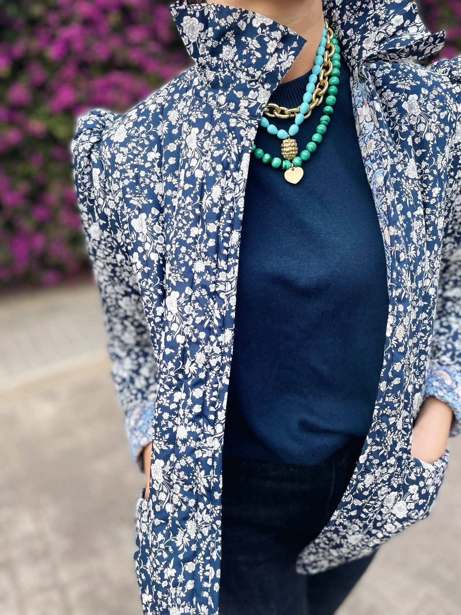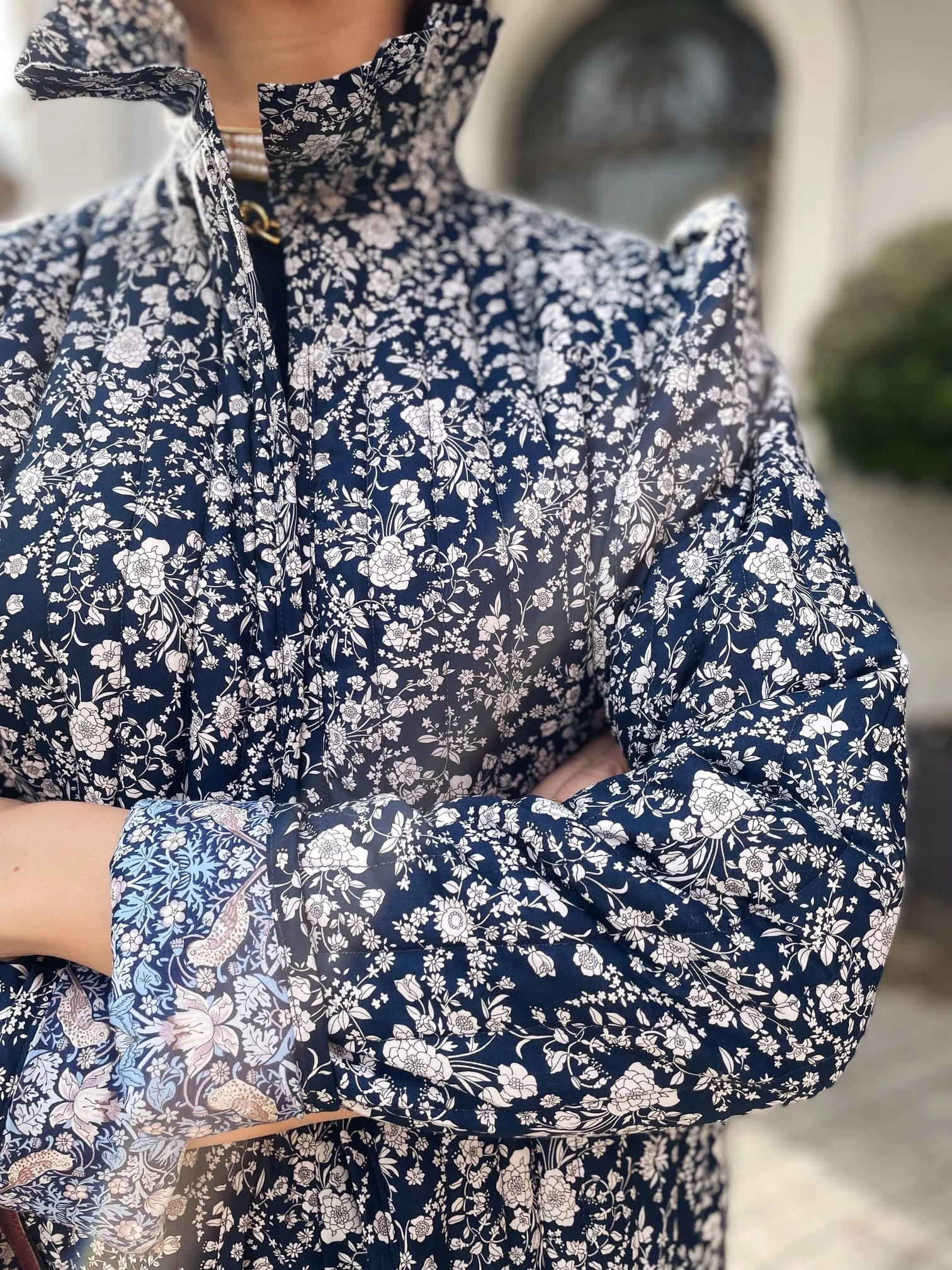The Nicoletta Quilted Coat, a spring night’s perfect piece. Hand quilted in Spain, this reversible coat is sure to complete any outfit from morning to night. Pair with a long sleeve to transition into the cooler months. Created with two classic and elegant prints from Liberty London, the outside in timeless navy and white floral print and the inside in a William Morris birds design.