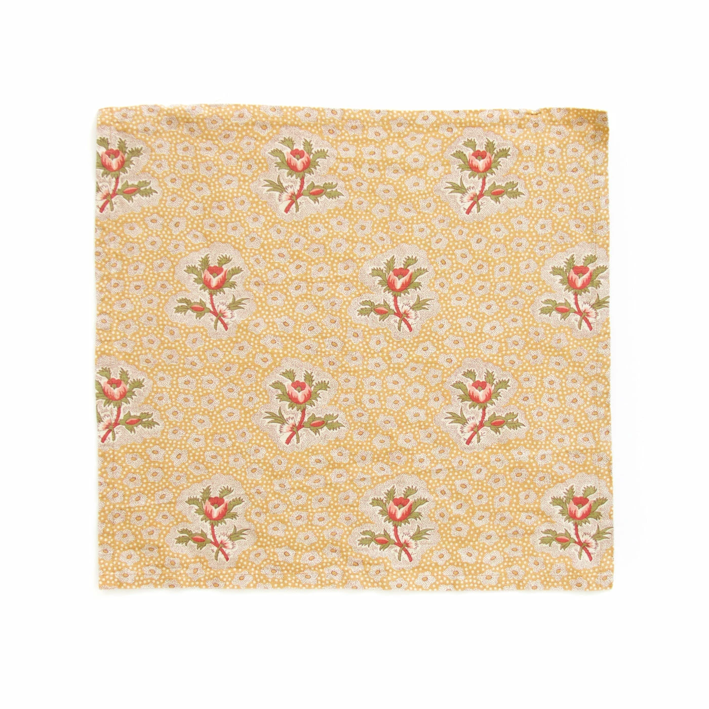 Set a romantic autumn mood at the table with this vintage set of four muted mustard napkins with accents in a rich red and olive green. The fabric was sourced from overseas and was the perfect fit atop the lounge chairs at the cottage. We got so much interest in the chair, we figured the fabric was worthy of shelf space elsewhere in the showroom and a site debut. Linens felt like the natural choice, so for a limited time, we are offering these in sets to dress your fall table accordingly. Fabricated in a tactile cotton poplin, we suggest setting them off by pairing with dishes in contrasting hues.