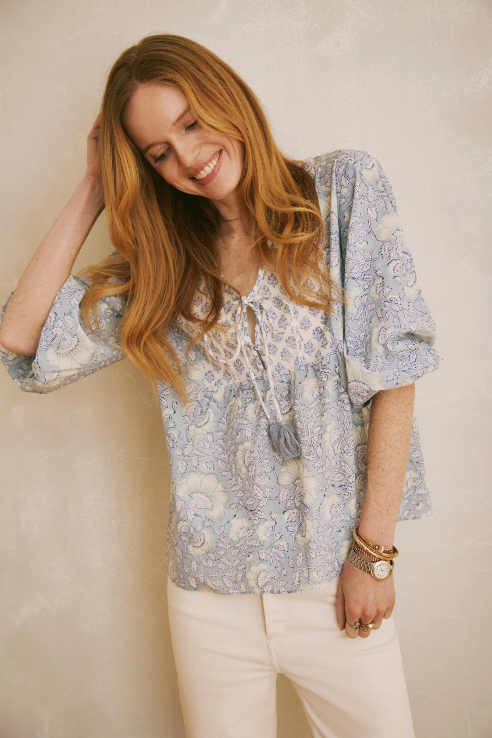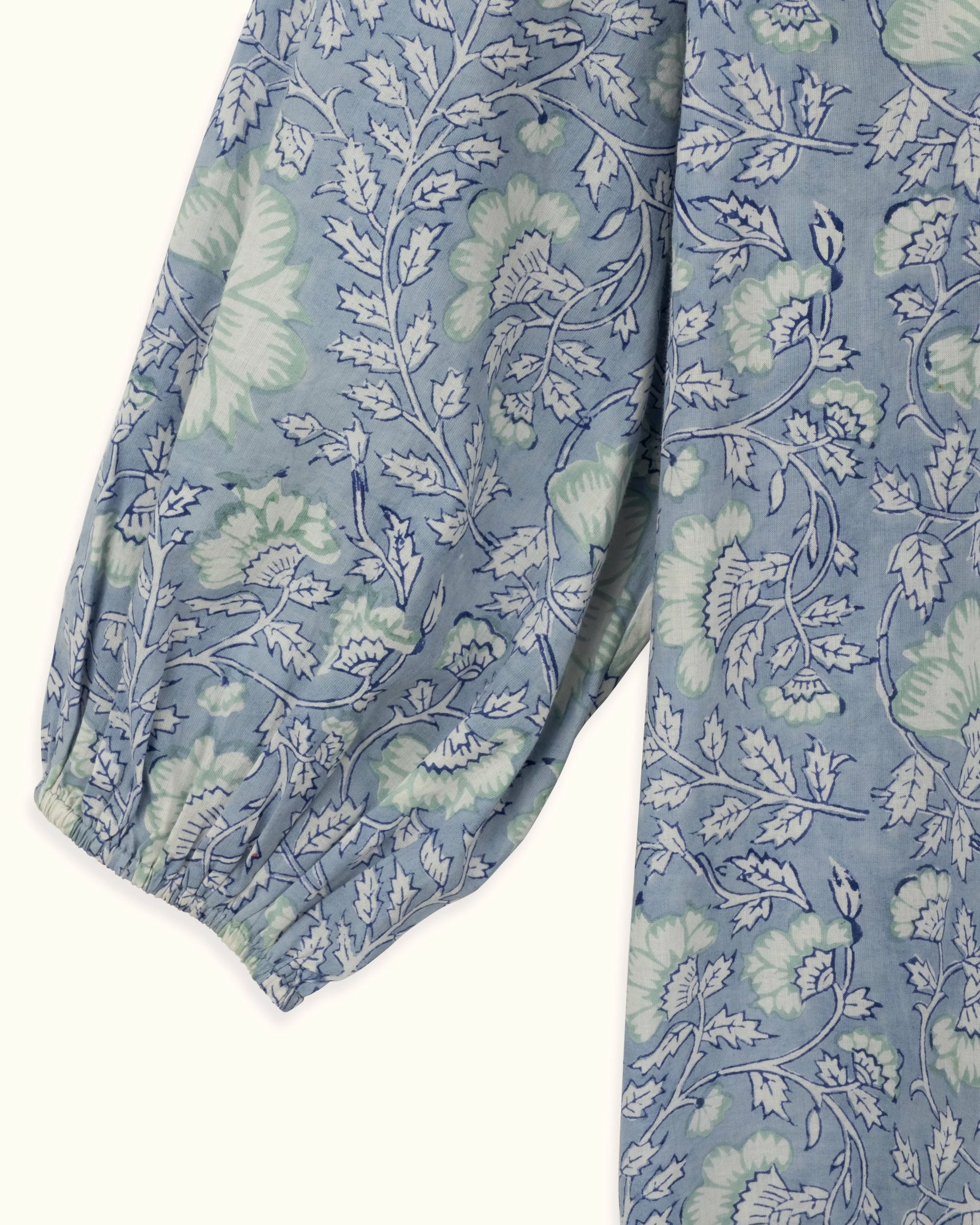 The Iris is back for SS22 in a stunning new mixed print style. It is slightly fitted in the body and has a shaped panel across the back in smaller scale floral print. A fabric covered button and tassels add additional pretty details to the neckline and front.The sleeves are relaxed and elasticated. Push them up, tuck the elastic under and puff them out to create a bit of drama!
