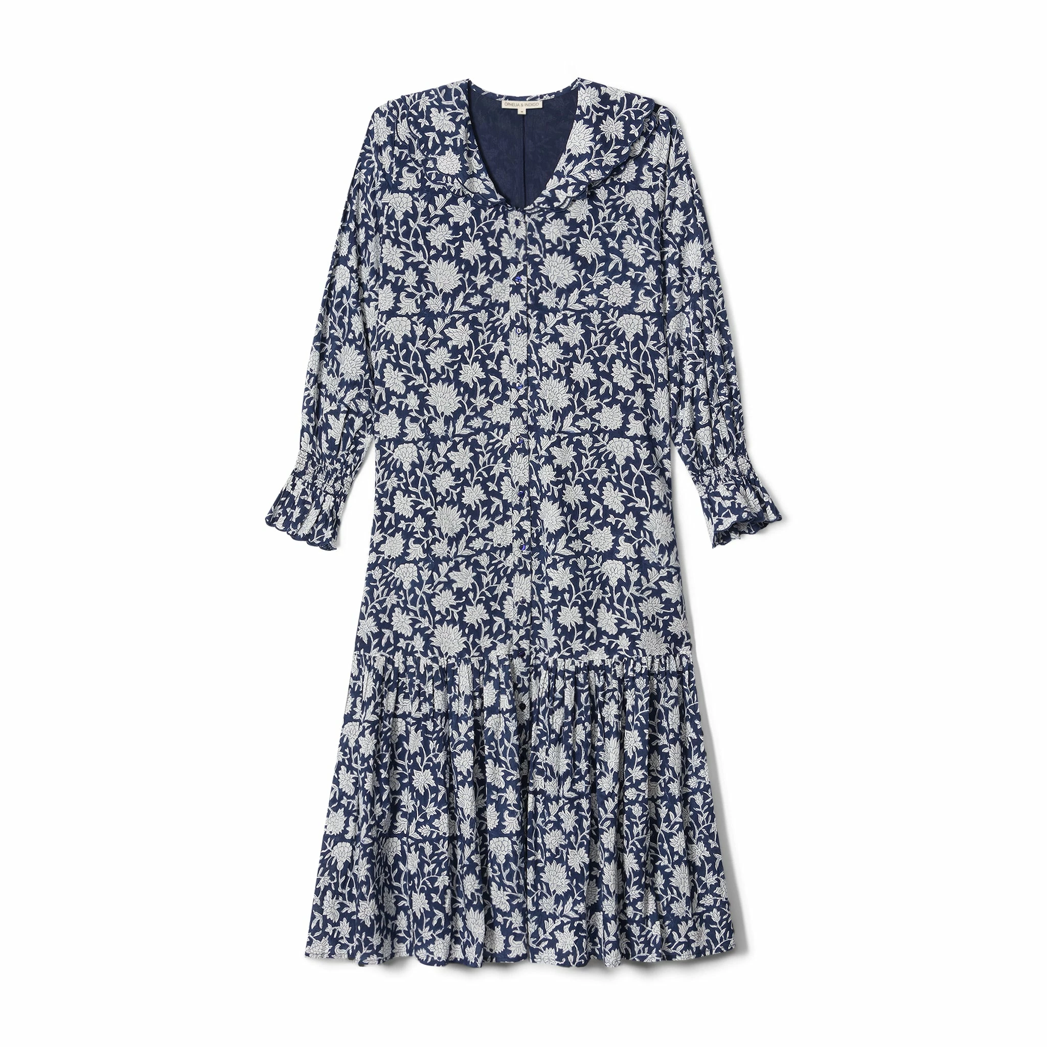 The Tilly is a dream of a dress. It features a double scalloped collar, with a dyed to match overstitch in the same color as the beautiful dahlia block print cotton it is made in. The pretty scallop detail appears again on the shirred cuffs which we think would look lovely peeking out under the sleeves of a cardigan. It has a flattering v-shaped neckline and is buttoned through to the hem with a full bottom tier. Like all O & I pieces, it’s a true day-to-night gem.