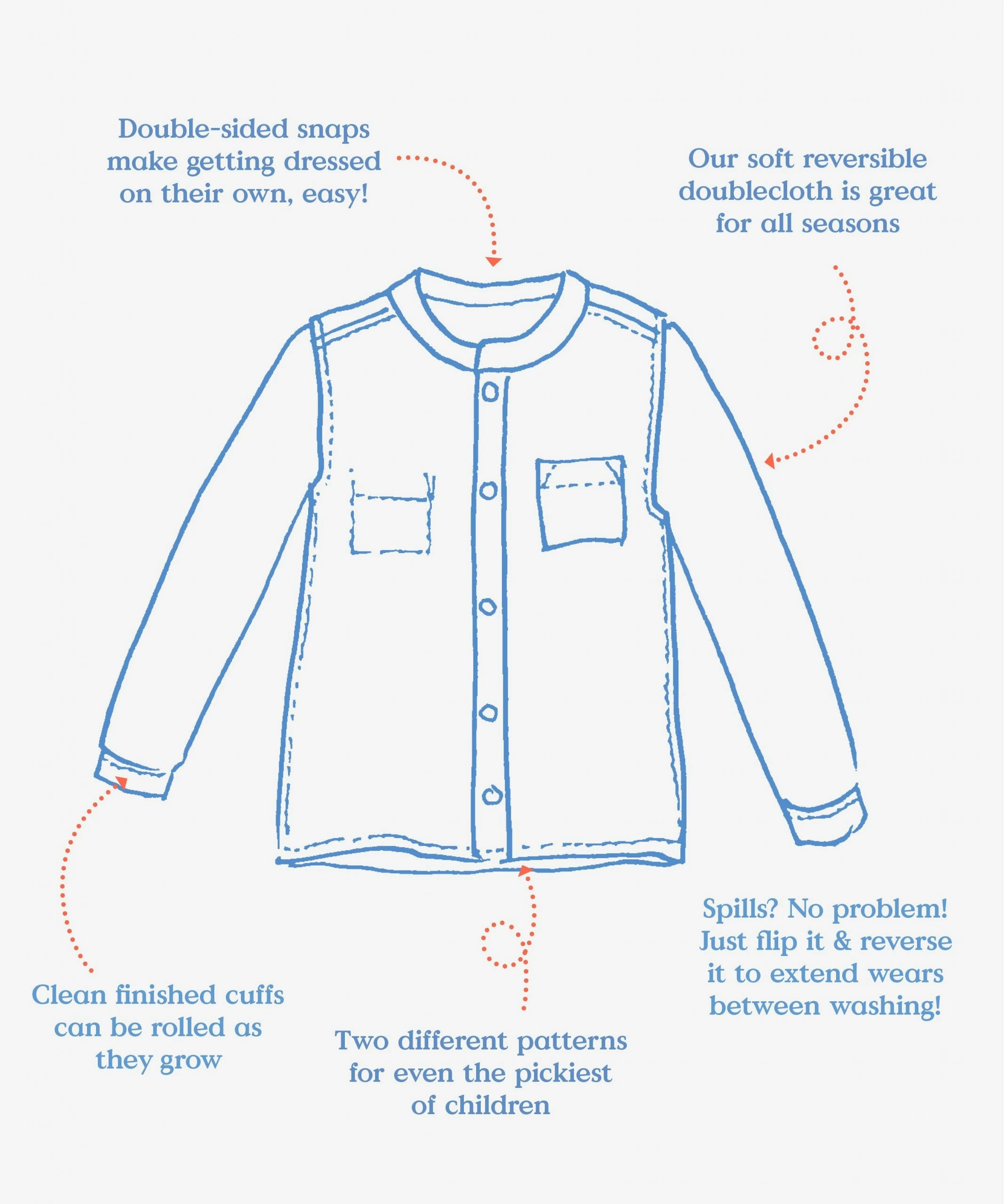 Reversible! Or magic clothes in the words of one child we know. These shirts are made from incredible Japanese double cloth; A different pattern on each side of the same piece of fabric. The shirt closes with our signature double-sided “O” snaps.
