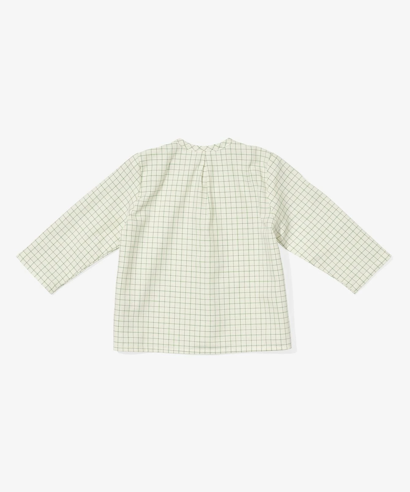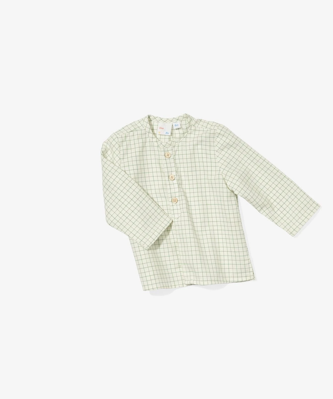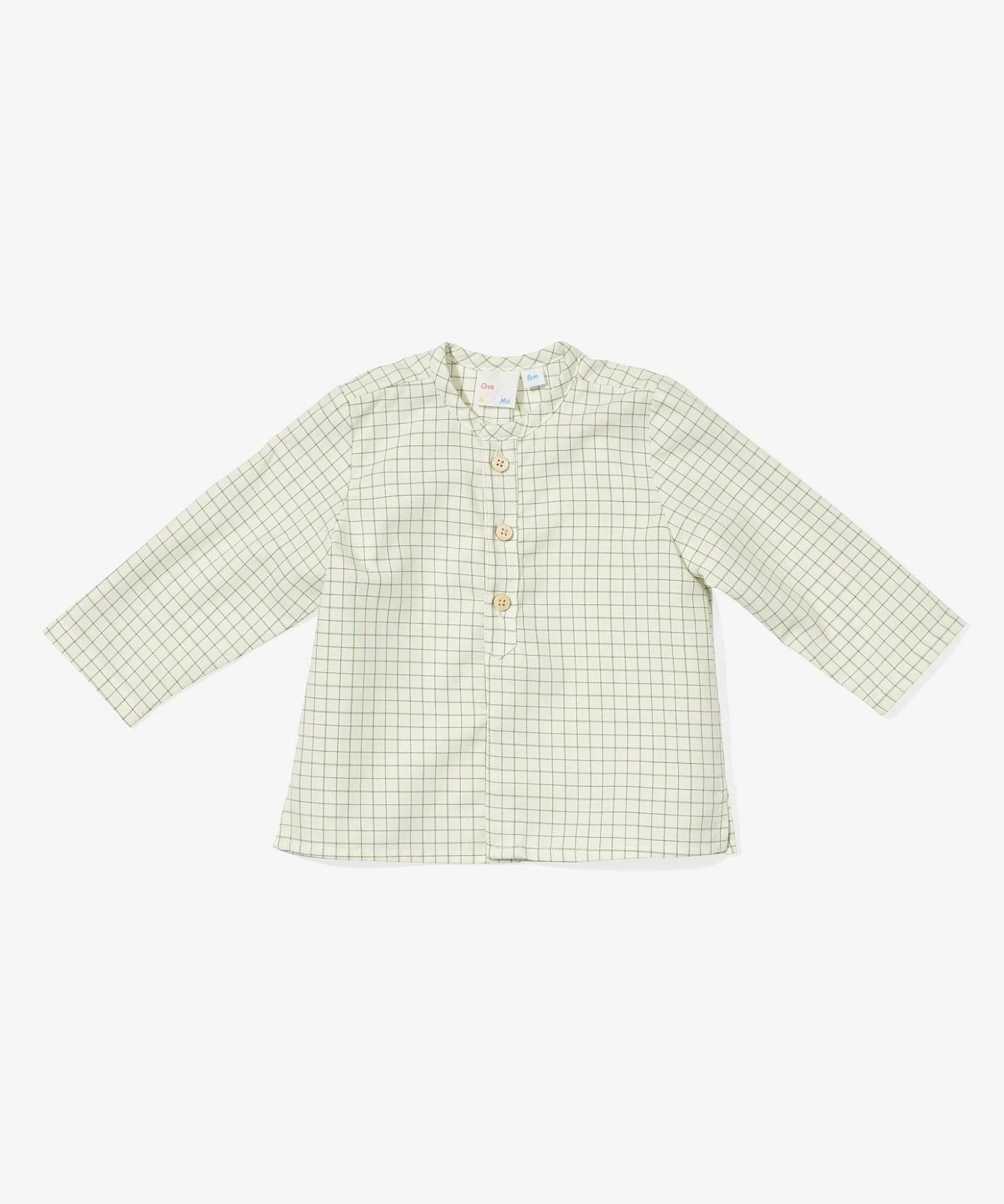 Our collarless casual shirt for baby. With a hidden button in the front placket this shirt opens completely for ease of dressing, although looks like a traditional three-button shirt. Our Lupo is the child equivalent to this shirt. In our signature dot poplin with Oso stacked buttons.