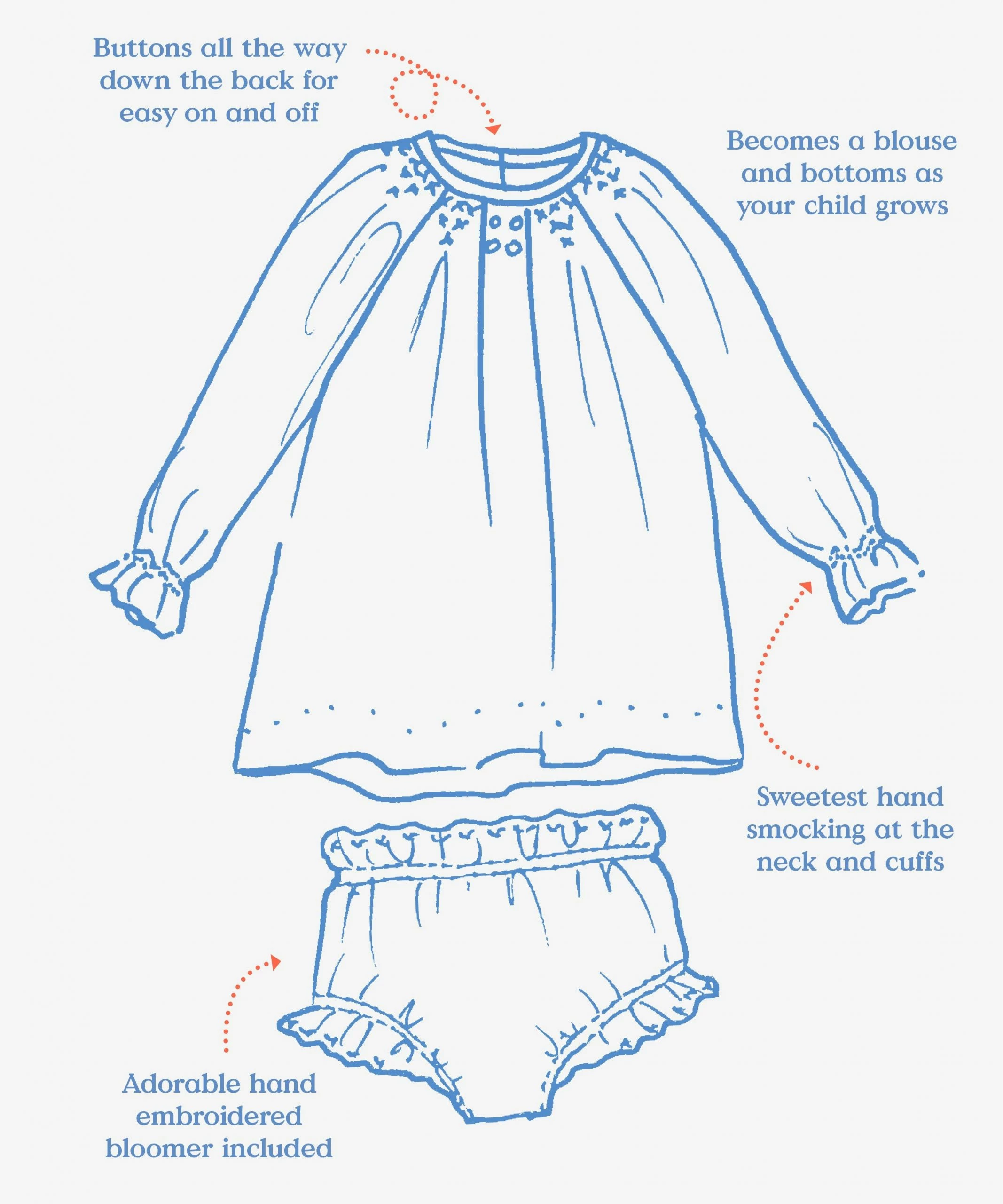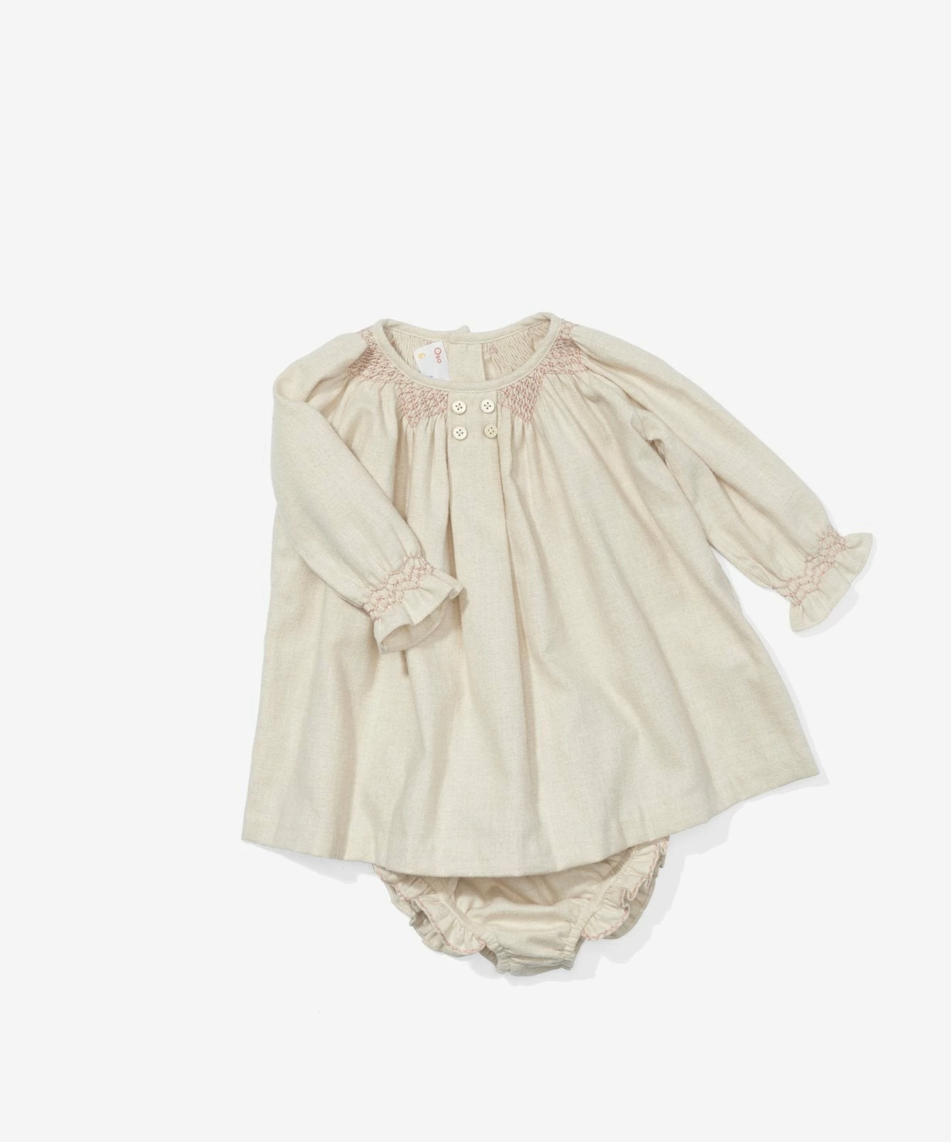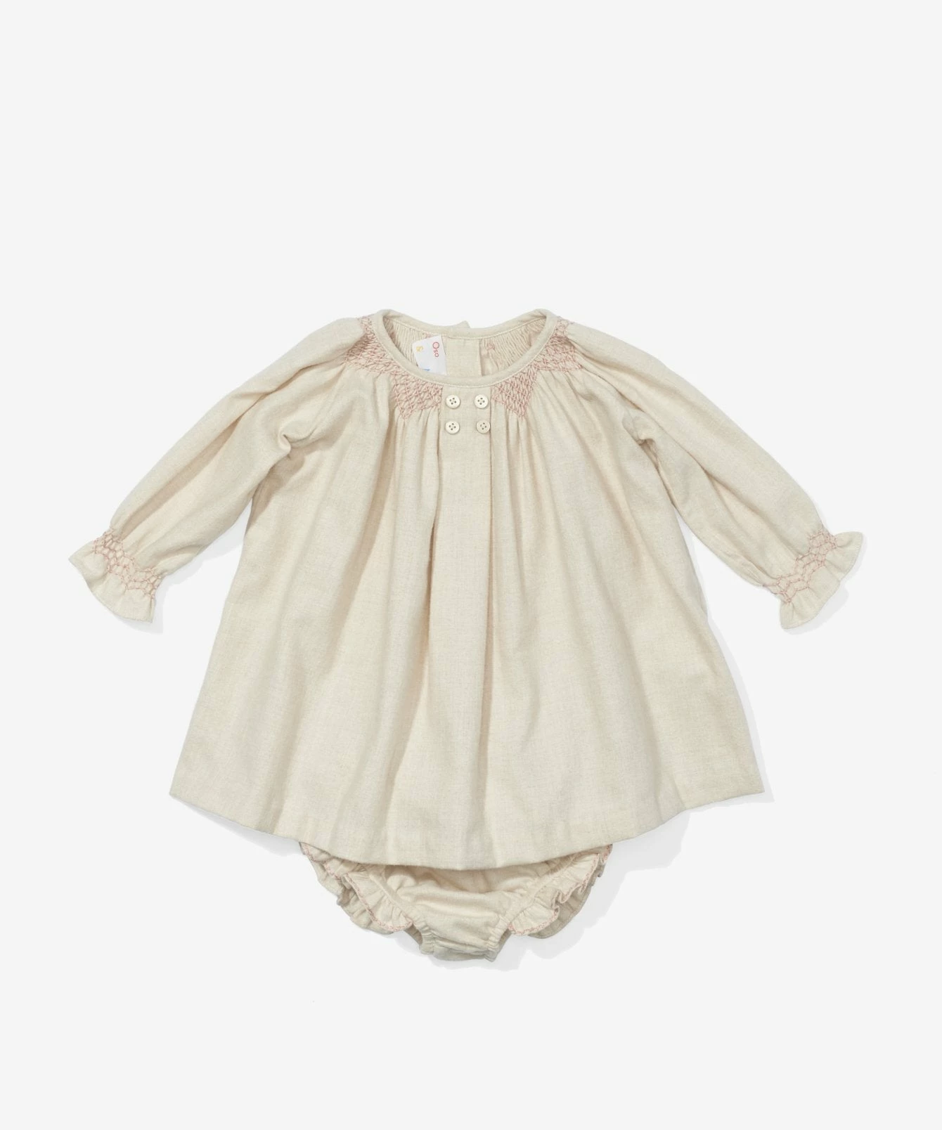 This beautifully smocked dress is designed to grow with your child. A dress at first, then as a tunic with its hand embroidered ruffled bloomer showing and later on even as a top with pants. In our lightweight oatmeal flannel with pink smocking.