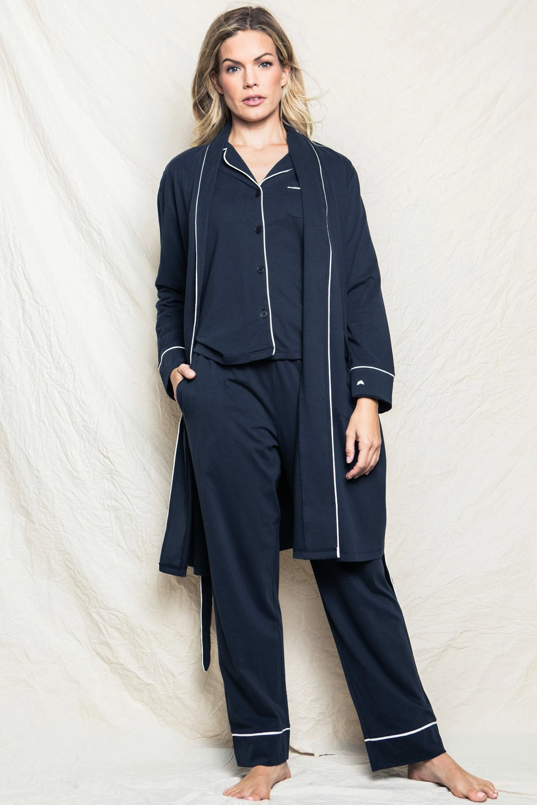 - Length falls below the knee for ease of movement and includes all the lovely details (chic piping on the cuffs, generous sash) that grace our classic pajama silhouettes.