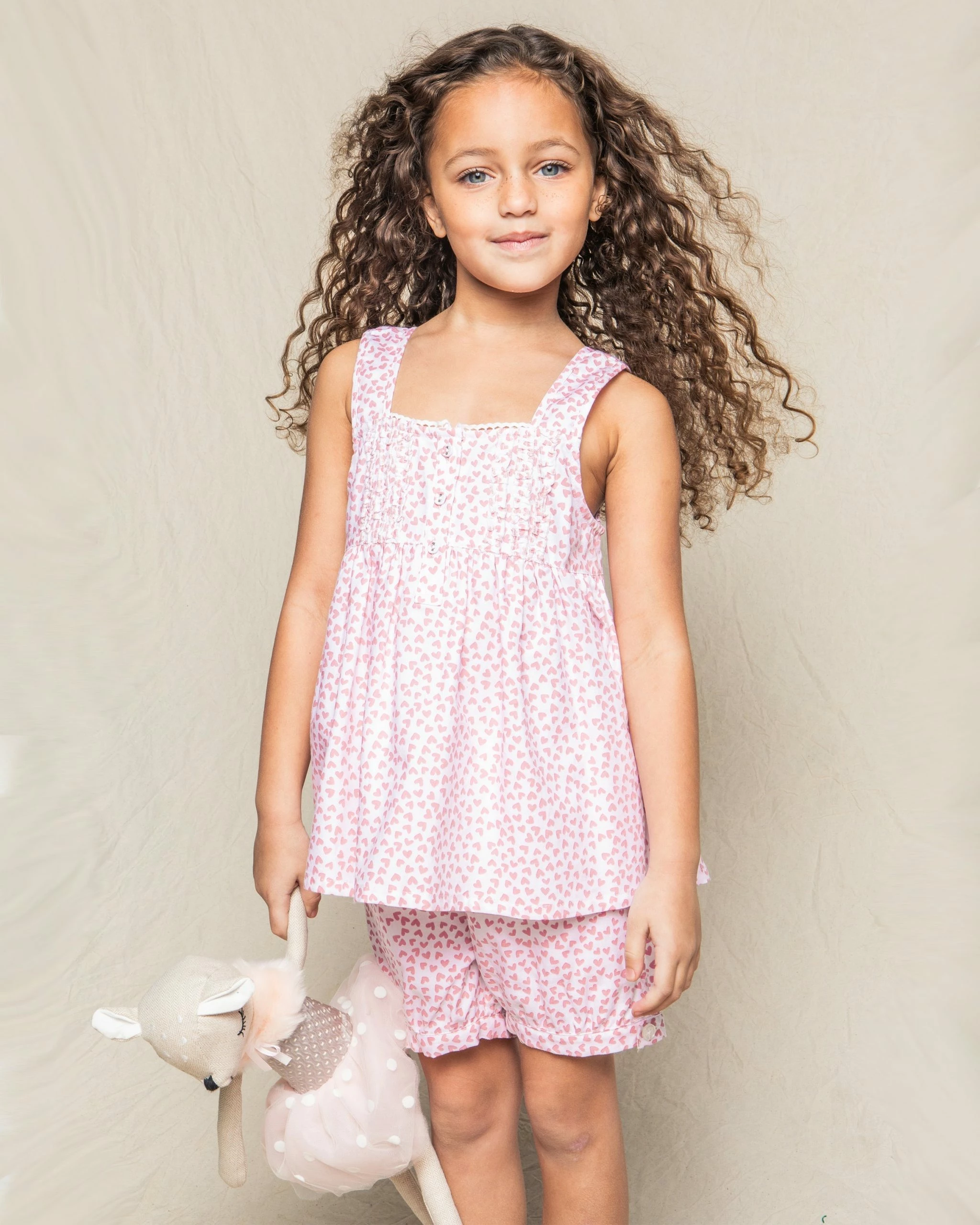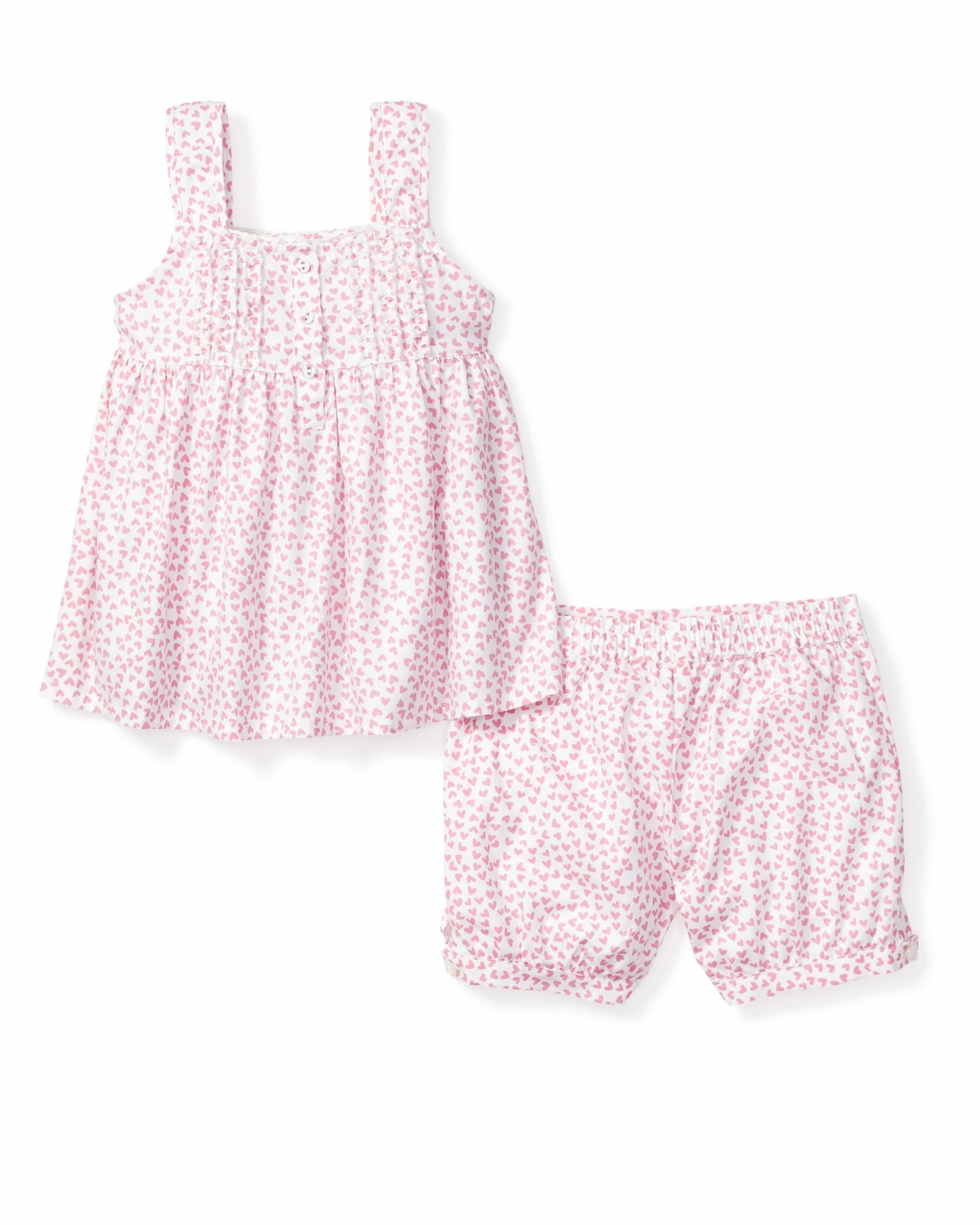 Like joyful confetti, the little pink hearts dance across the fabric as if batting their eyelashes. Designed after our best selling Nightgown, the Charlotte Short Set has stunning attention to detail with delicate cloth buttons, an intricately designed packet, and classic bloomer bottoms.