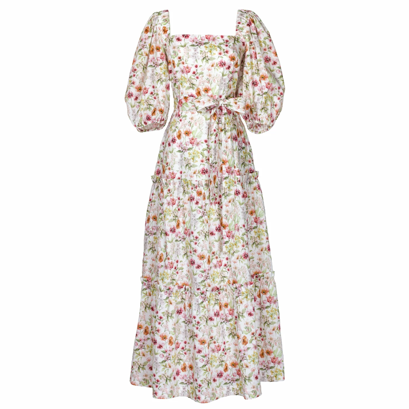 Crafted in a silk-like cotton from Italy, this delicate print is inspired by botanicals at the Babington gardens in Summerset. An ultra-flattering square neckline, 3/4 sleeves, full length, flounce and pockets create a feminine, yet effortless silhouette that will be your go-to for special events this Spring.
