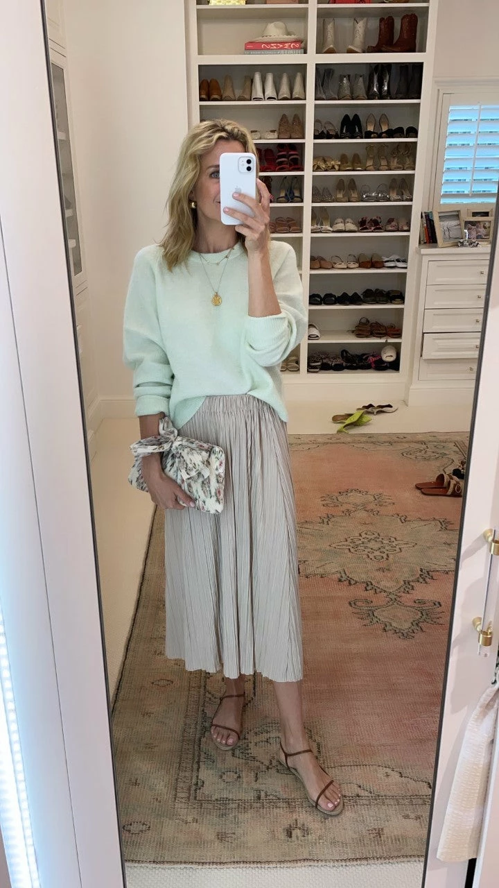 - This long pleated skirt is cut from a jersey fabric with a fluid floaty effect.