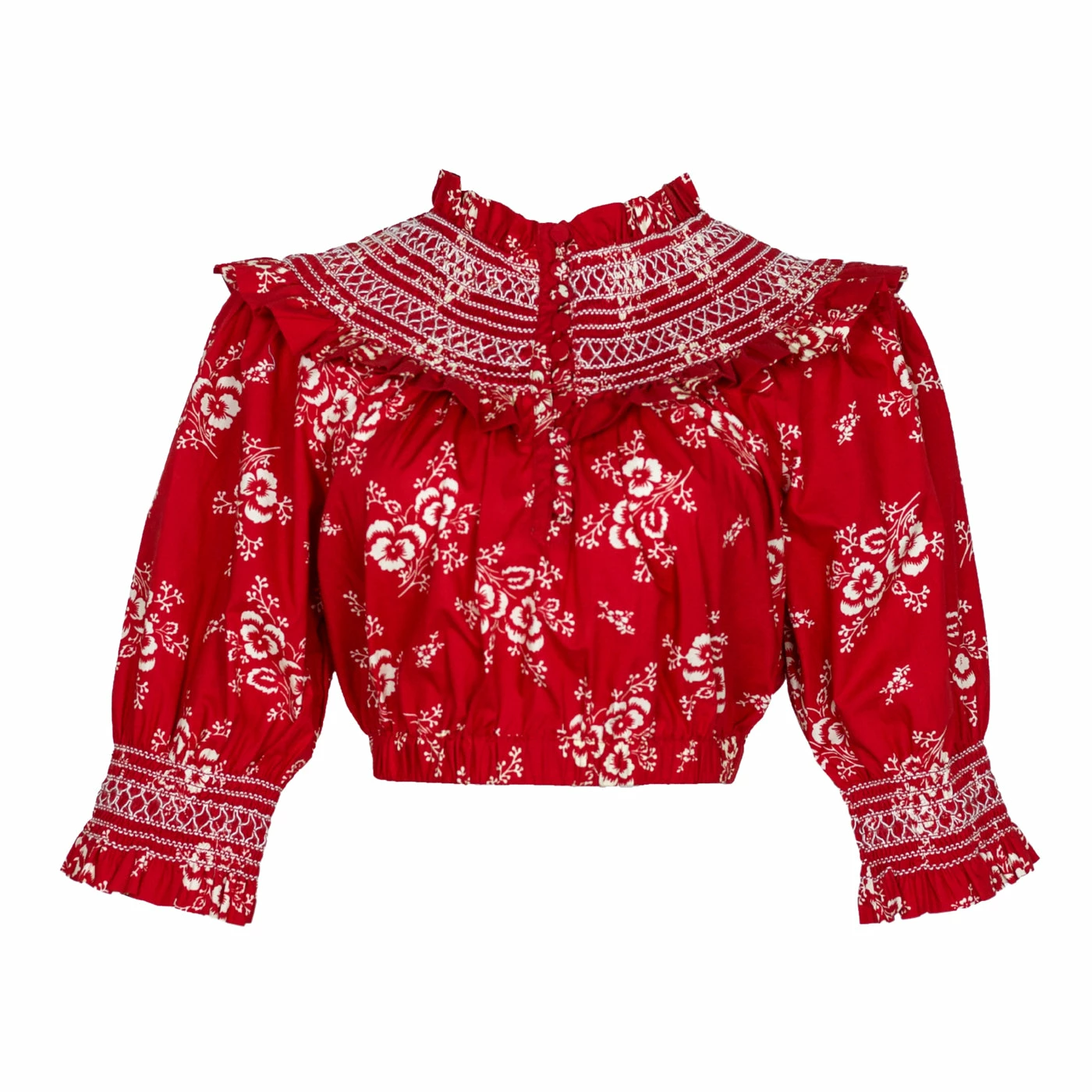 The Alessia floral print cropped top features ruffle and smocked detailing around the neckline and puff sleeves.