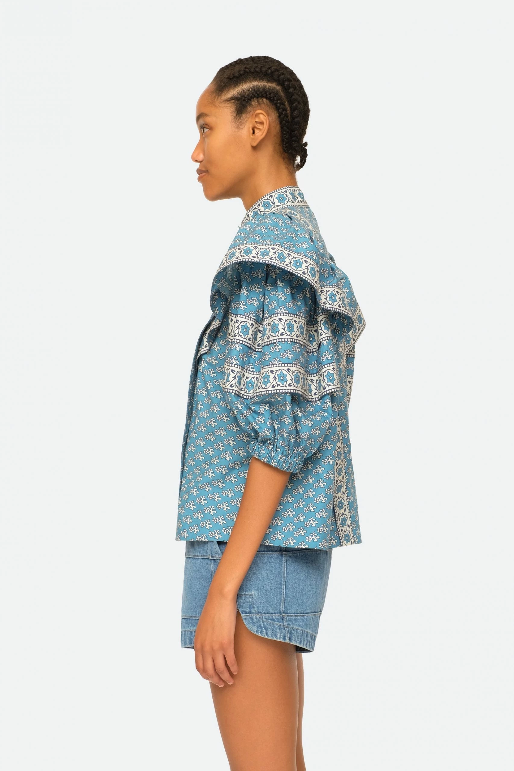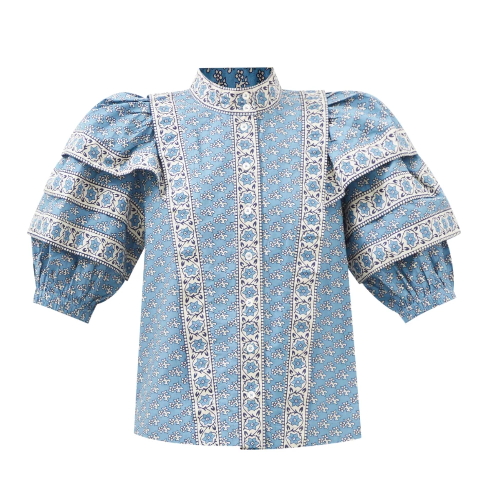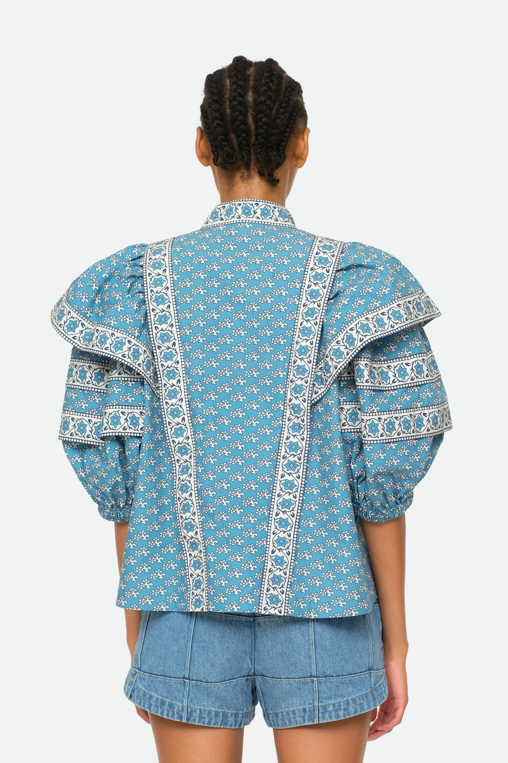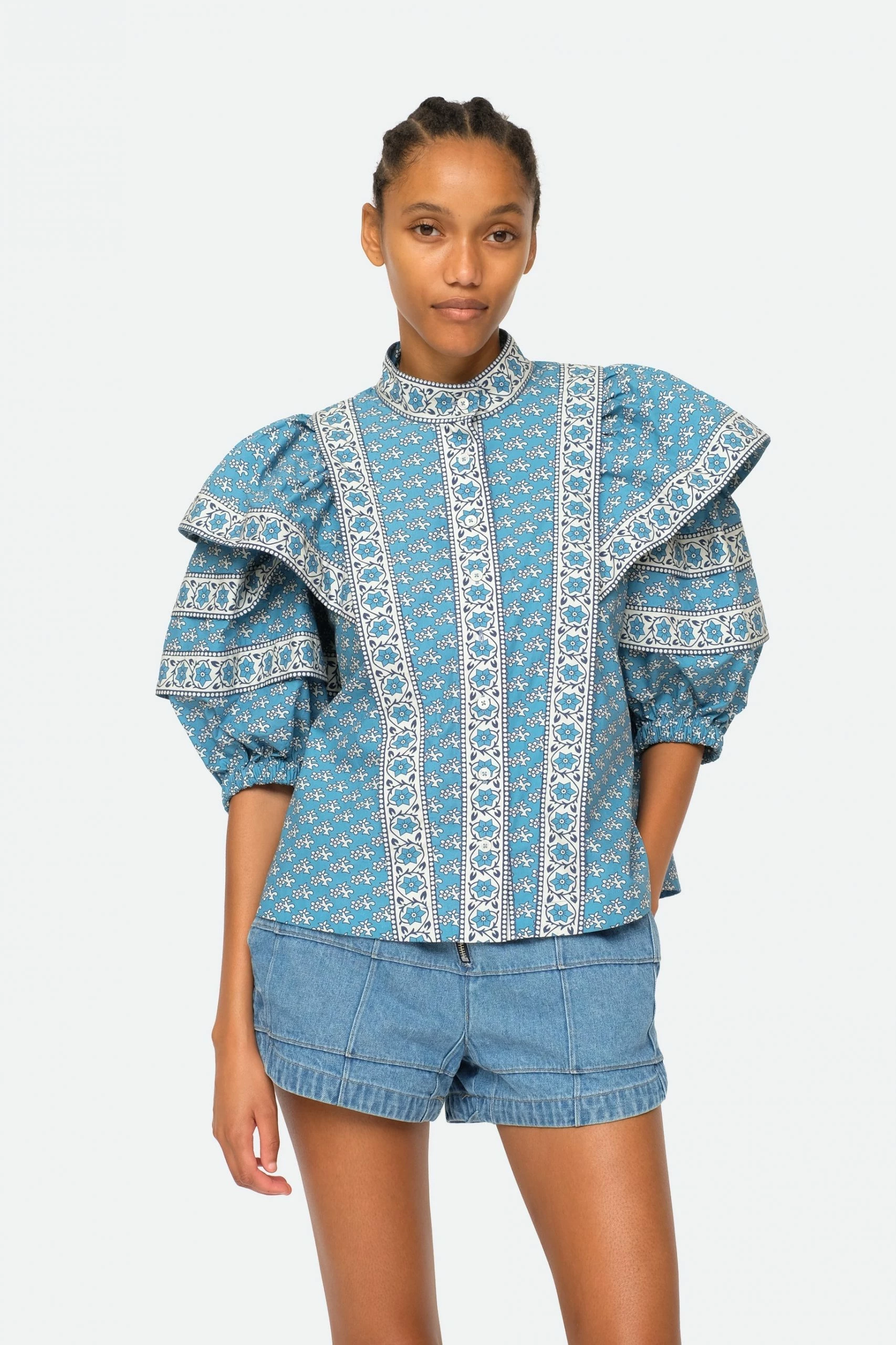 The Fernanda tile print top features short puff sleeves and ruffled detailing.