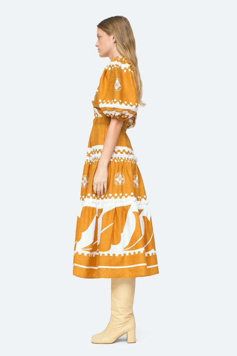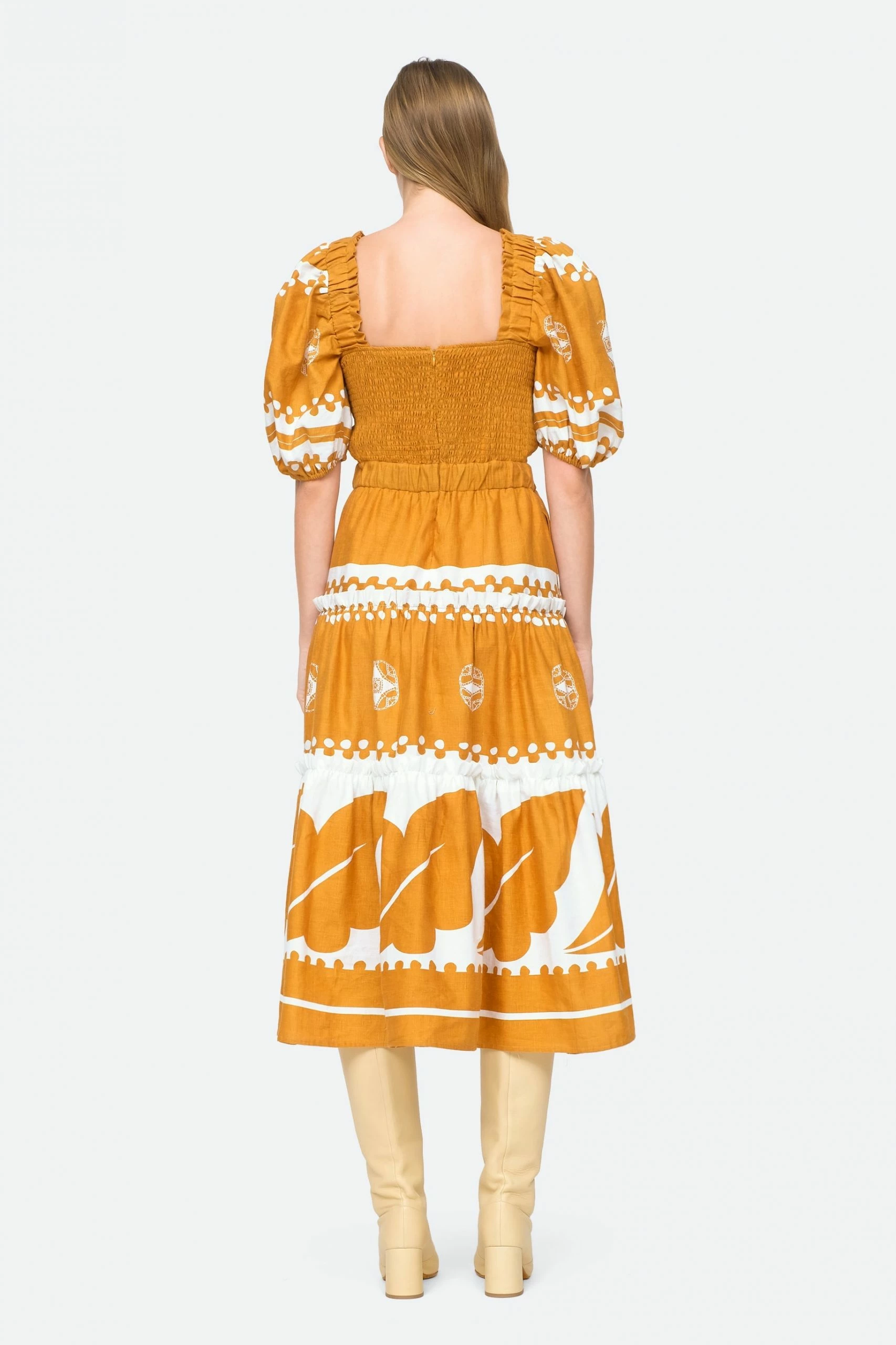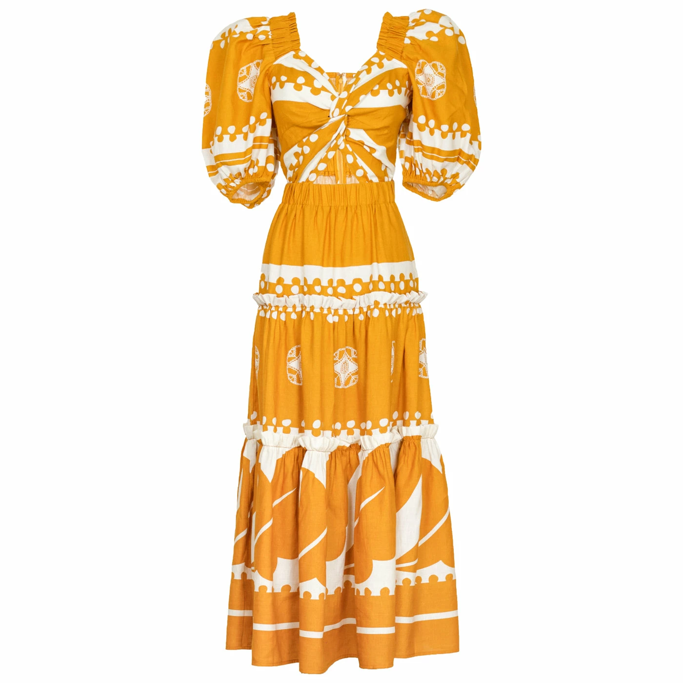 The Liora cutout placement print dress features puff sleeves, cutout front detail, and midi silhouette.