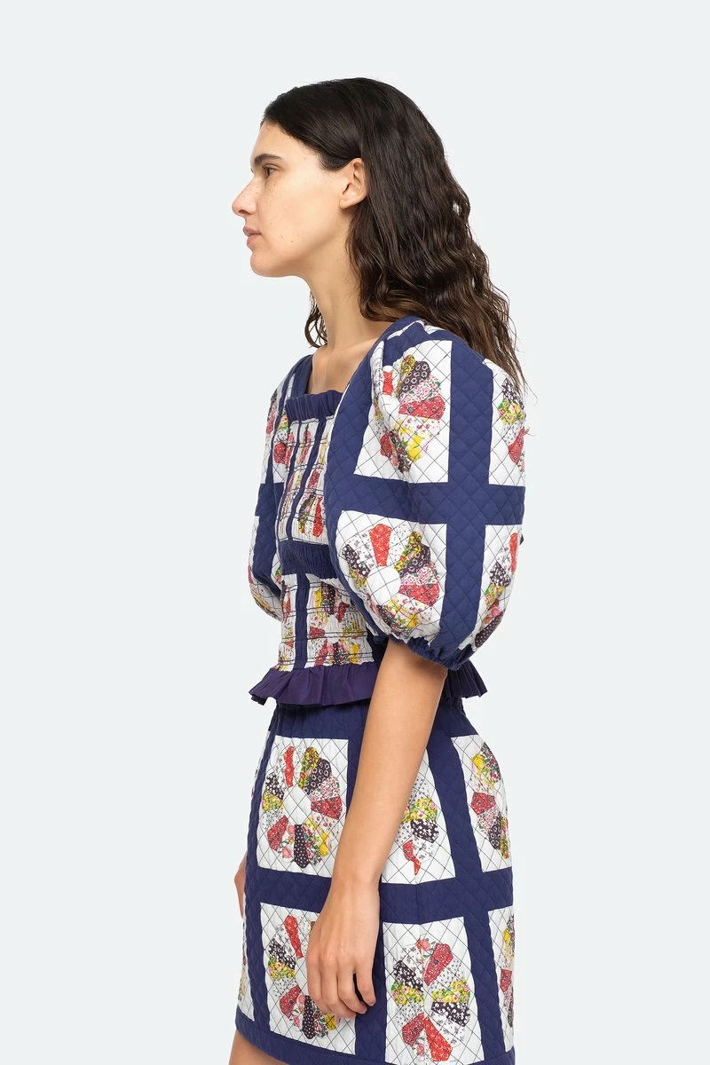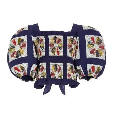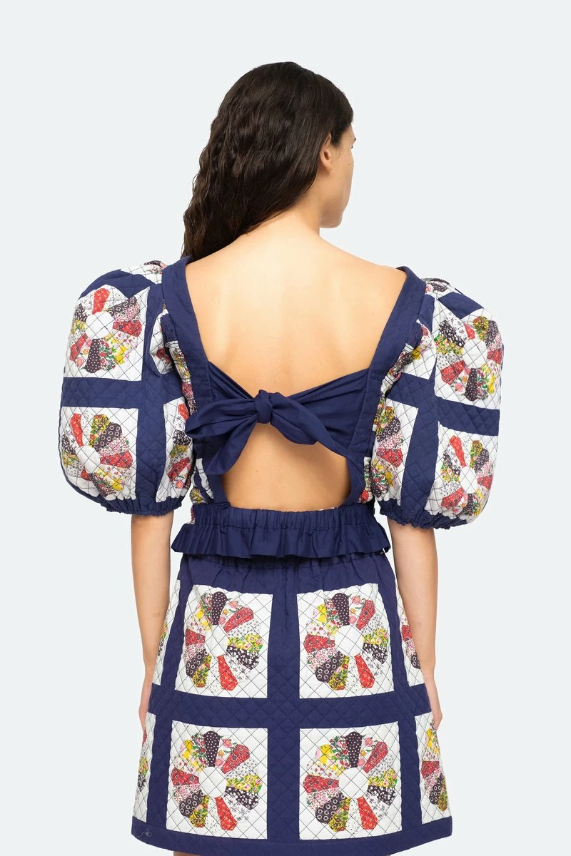 The Pippin patchwork print top features a multi colored patchwork design, smocked bodice, short puff sleeves, ruffle detailing and open back with ties.