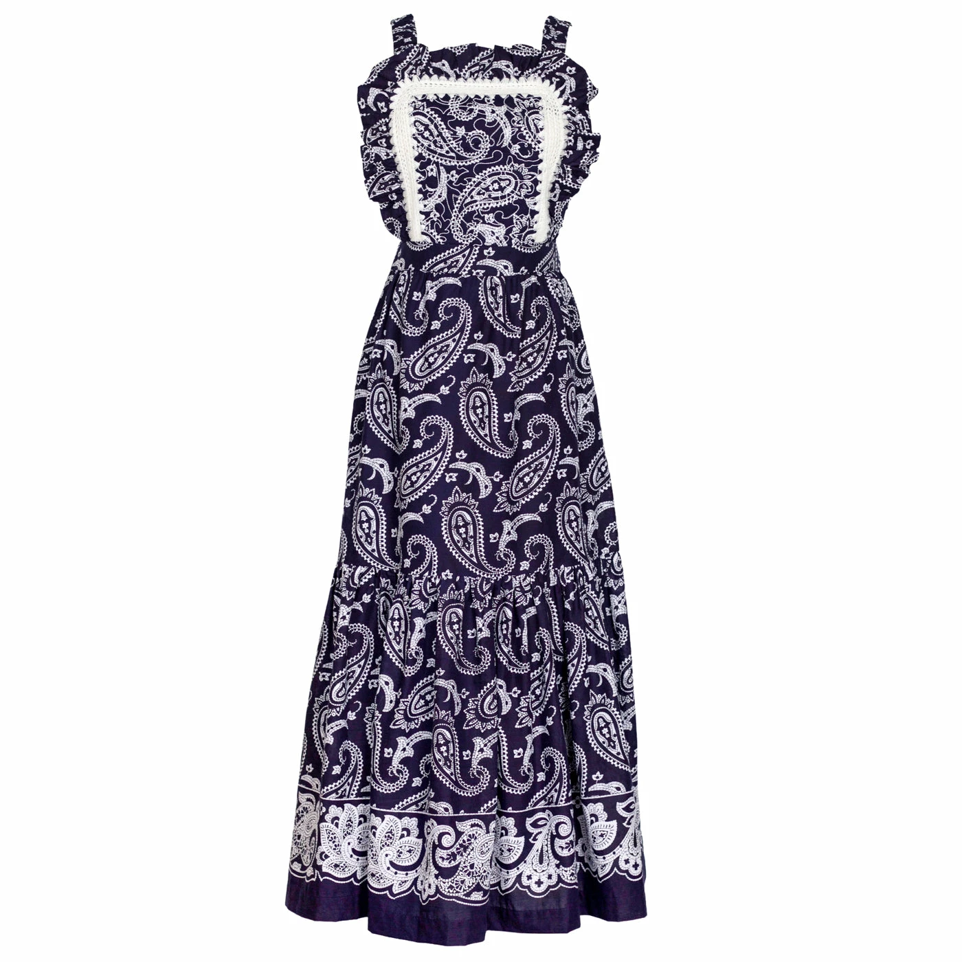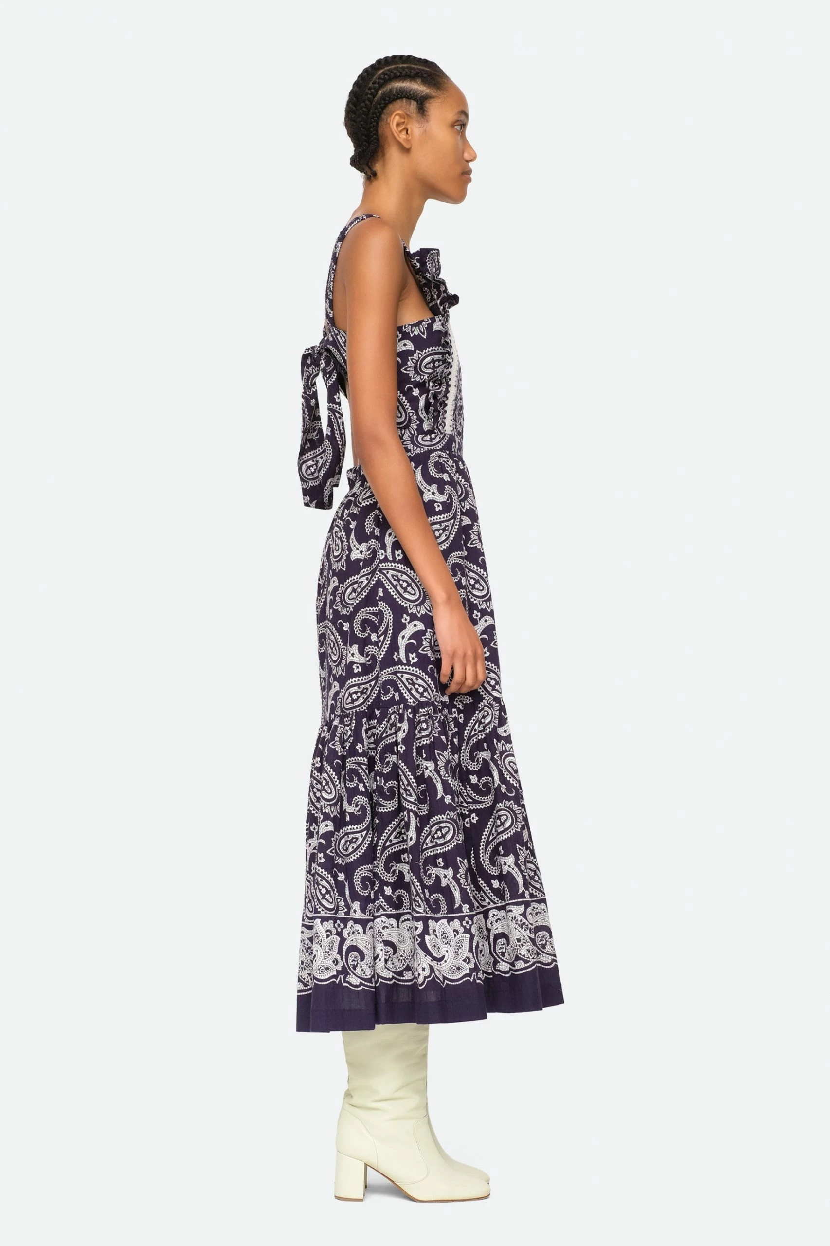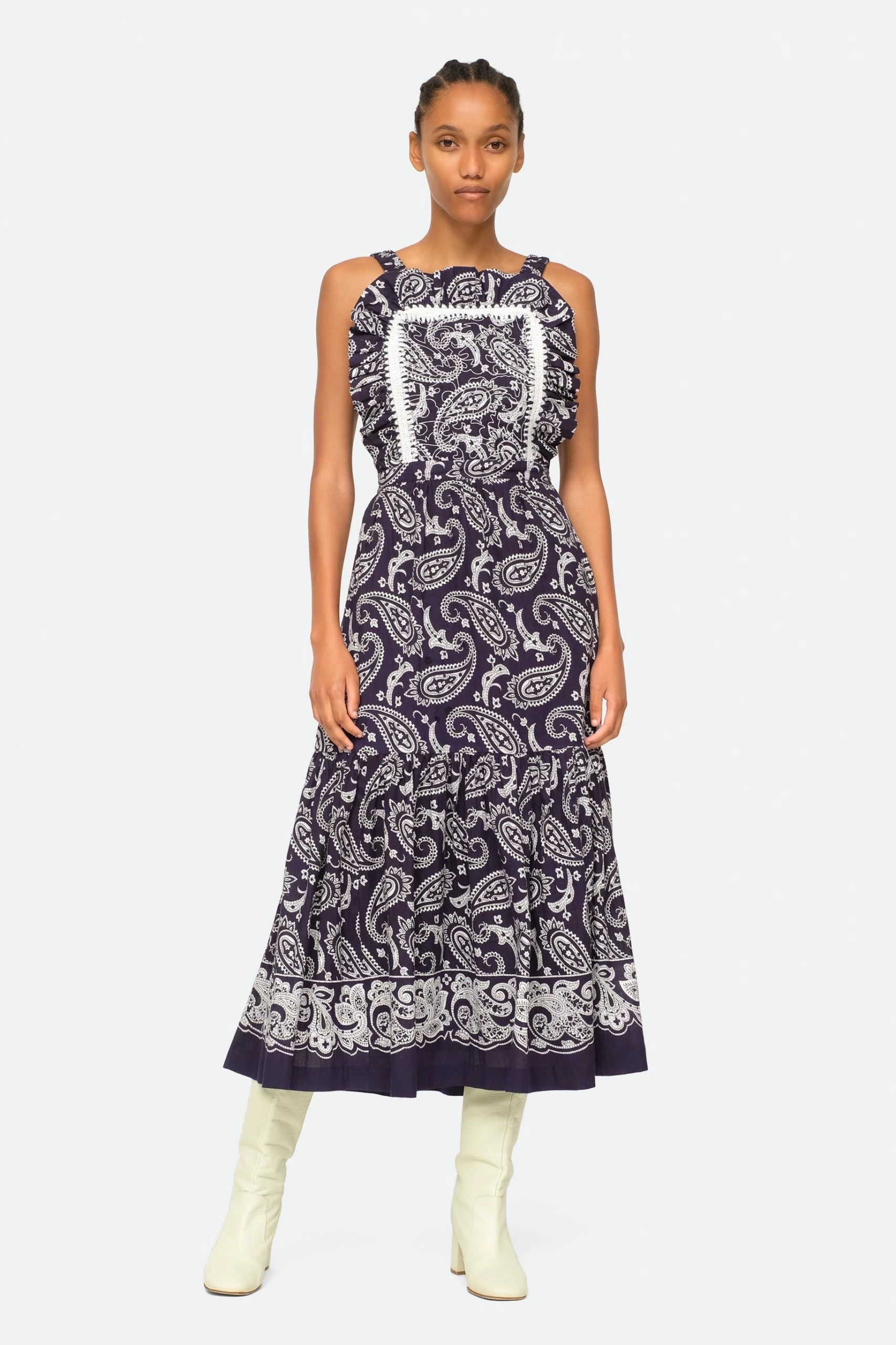 The Theodora paisley embroidered quilted apron dress features ruffle detailing, midi hemline and open back that secures with ties.