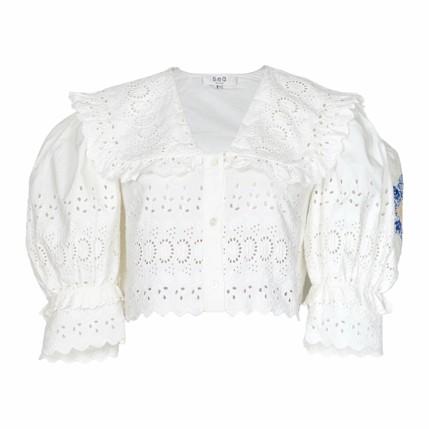 As soon as we came across Sea NY, we knew it was a brand we needed on The Avenue. We’re obsessed with their unique vintage-feeling designs, that are the sort of staples LZ strives to collect in her own personal closet. The Violette top in blue floral features puff sleeves and eyelet details.Â
