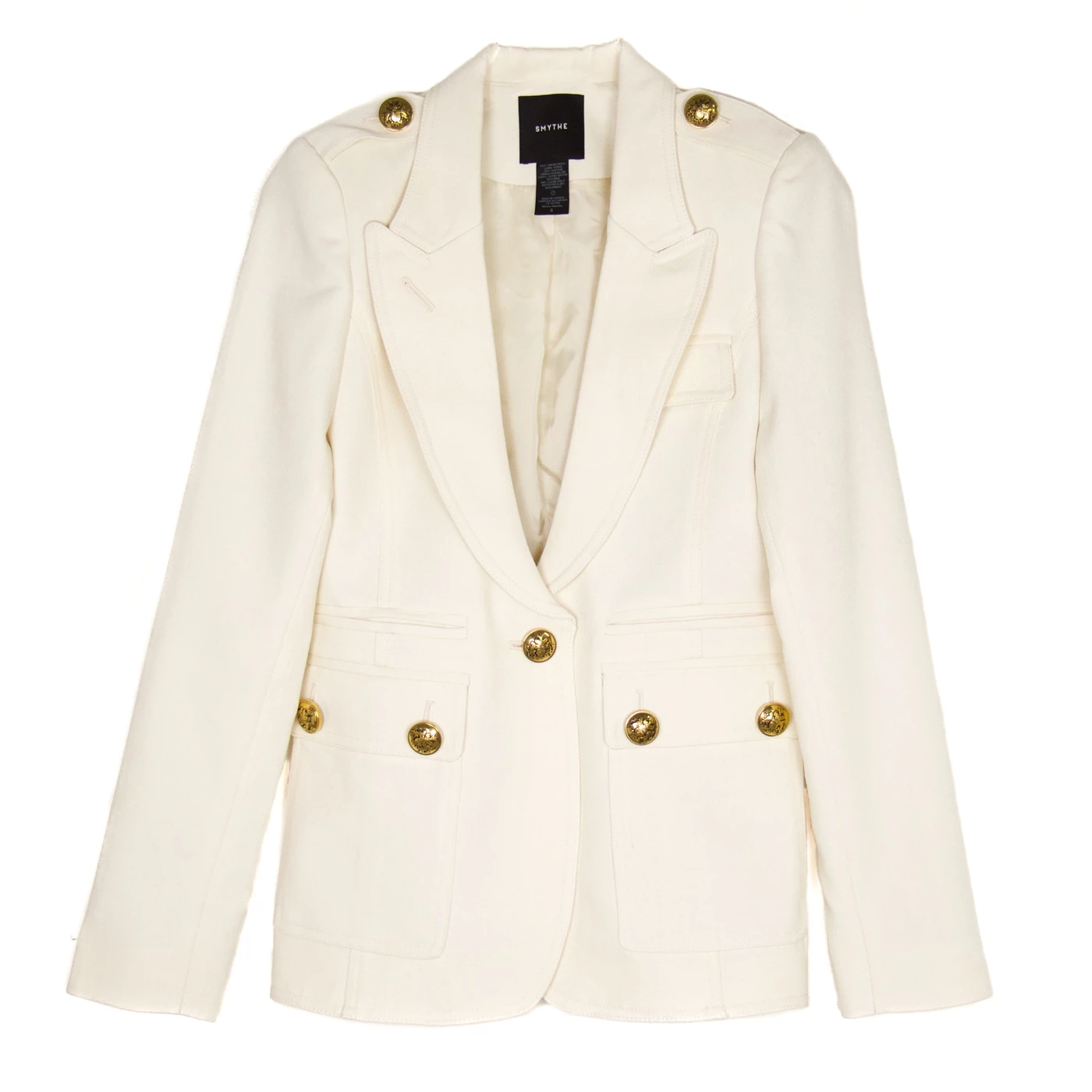 Decidedly tailored, this single-breasted blazer features military detailing including epaulettes, cargo pockets, and antique gold hardware. Curvy figures may wish to go up a size.