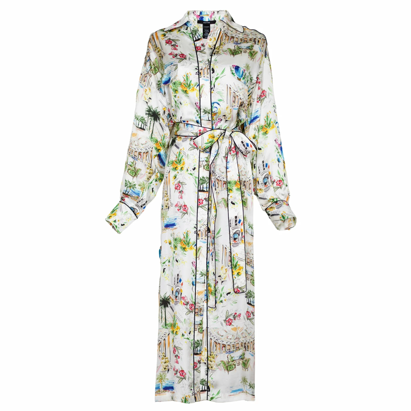 This dress features a relaxed fit, midi-length shirt dress with contrast piping, tie belt and deep side slits. This garment fits true to size, take your usual size.