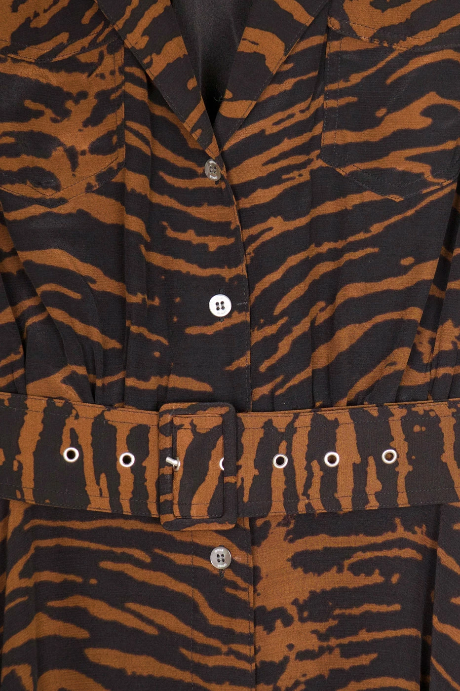 A fresh take on Staud’s classic Millie Dress, updated in this season’s Mahogany Zebra print & exclusively cut to mini length. This dress features a button down front and matching belt.