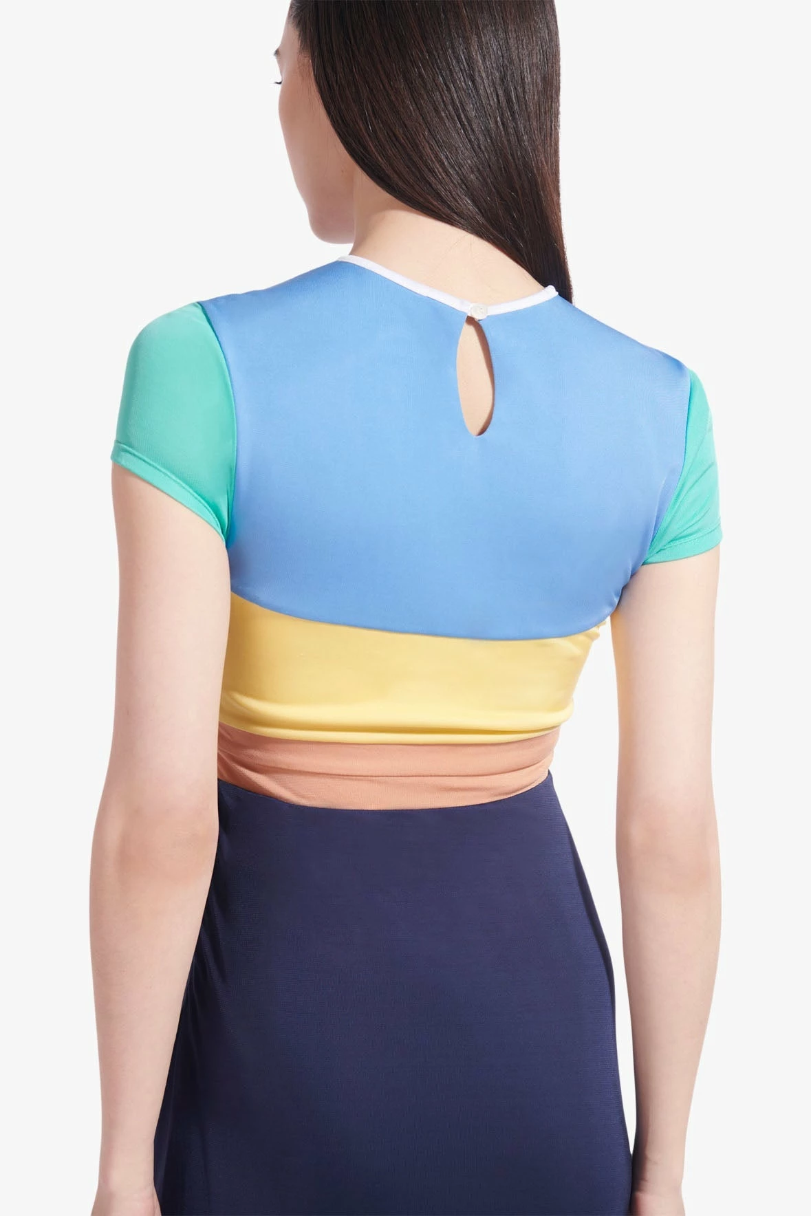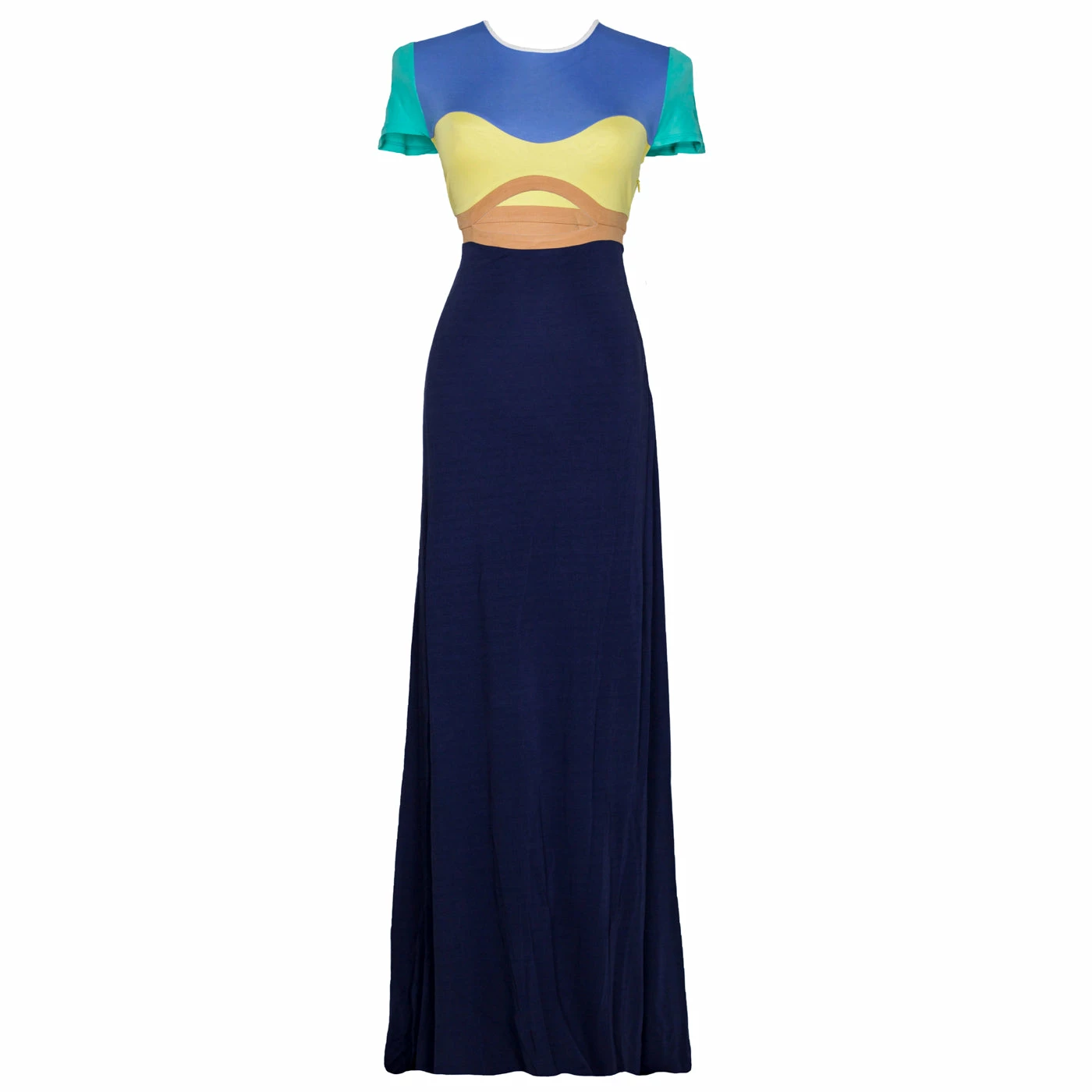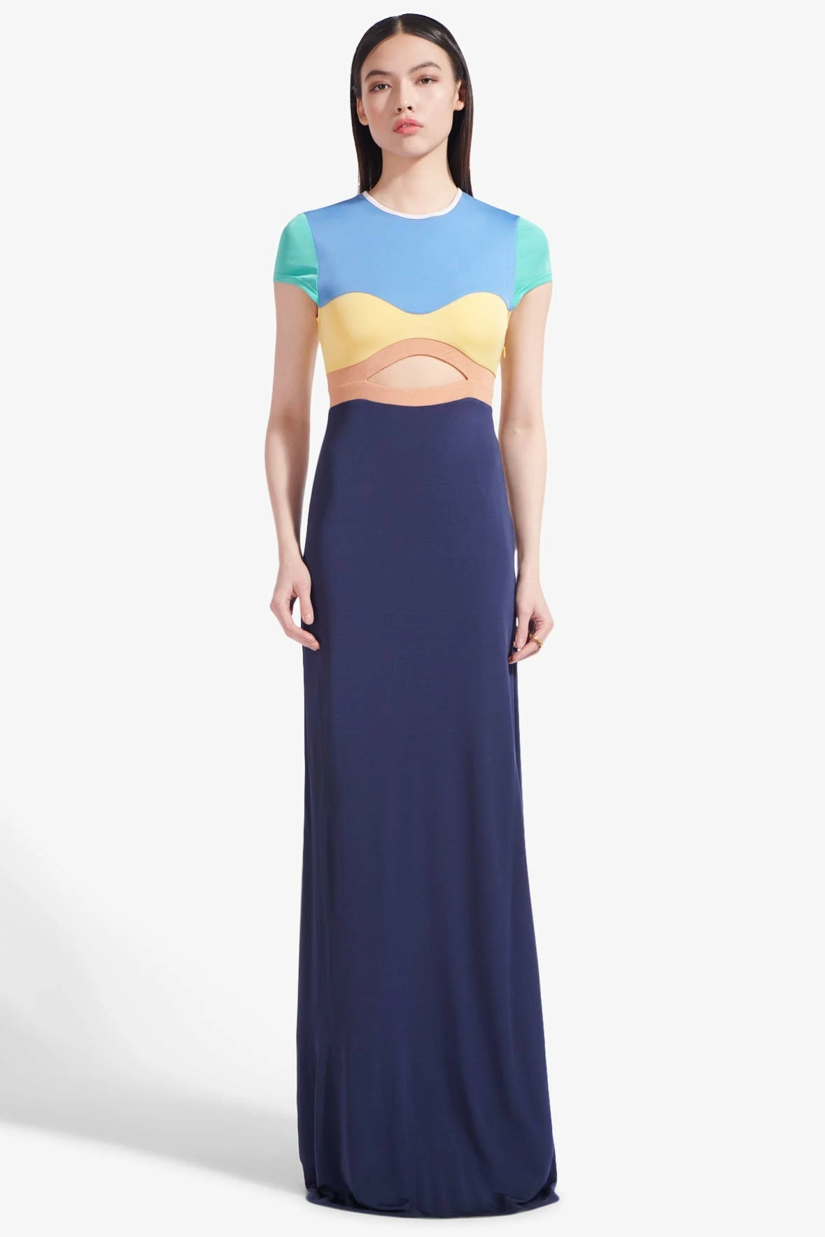 A short-sleeved maxi dress with an under bust cutout and color blocking, the Piera Dress is made out of a slinky rayon jersey fabric.