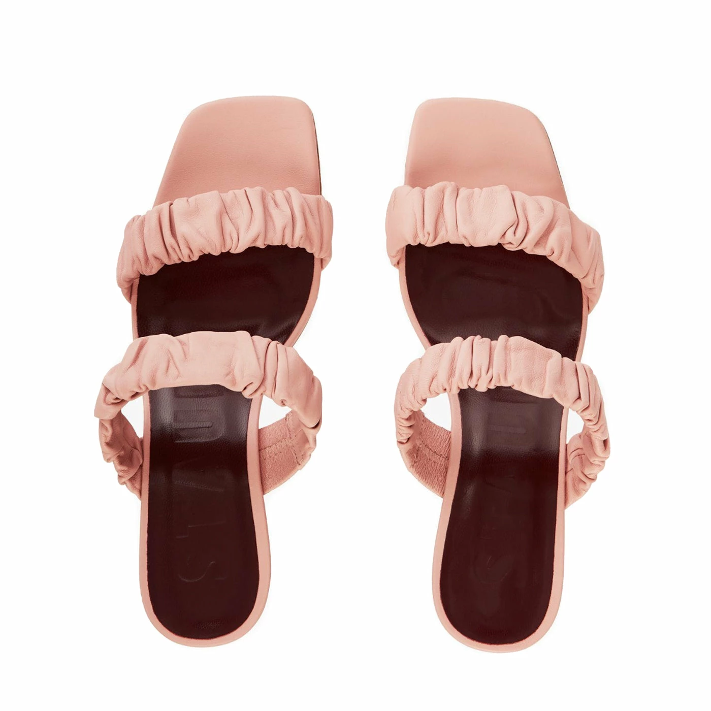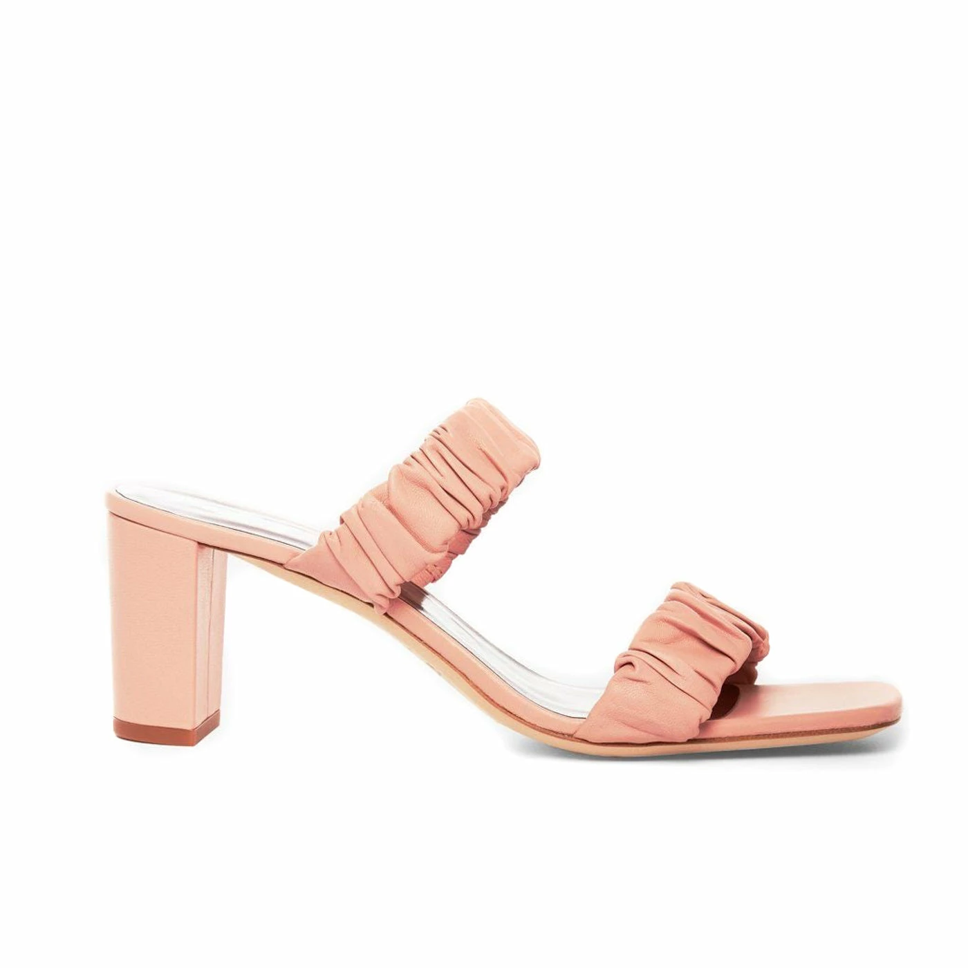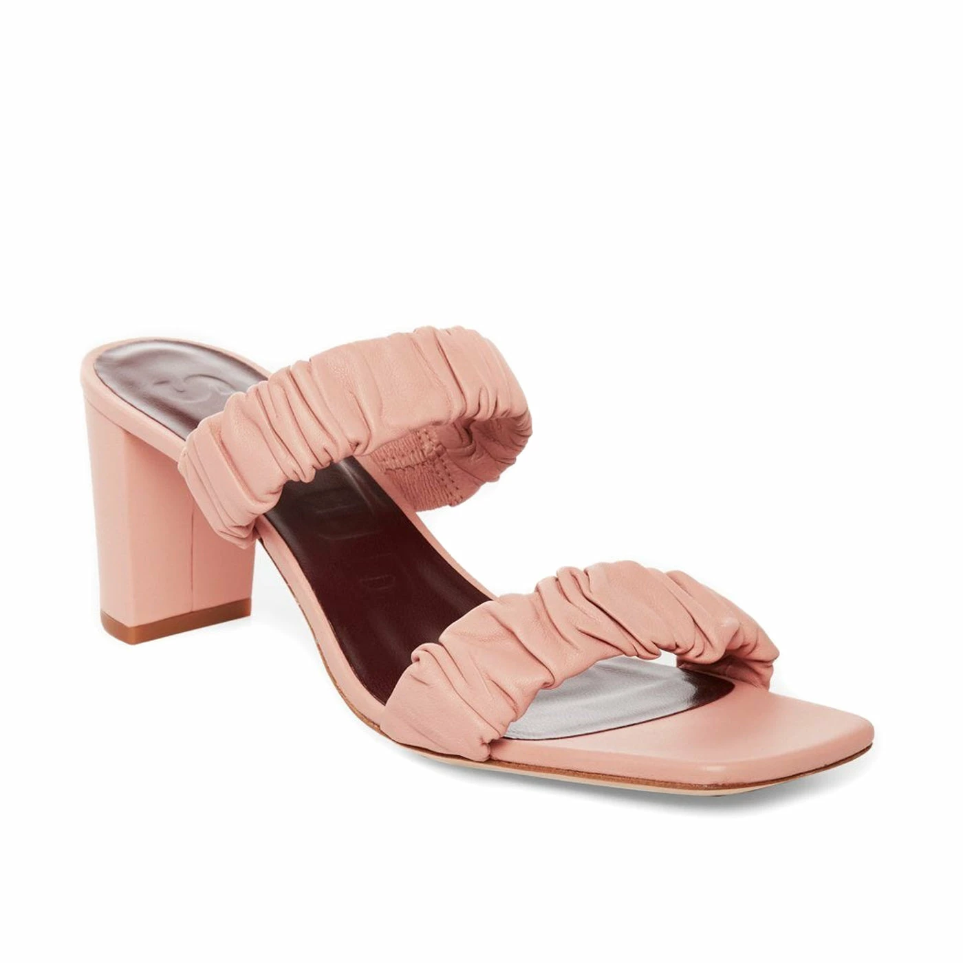 The soft ruched leather heel, the Frankie Ruched Sandal features an open square toe and mid heel.