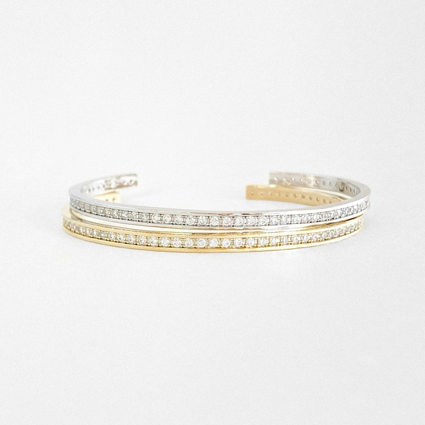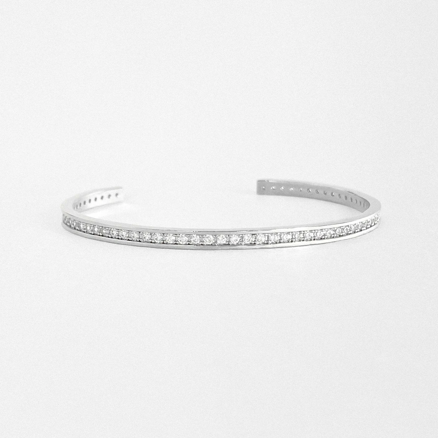 - 14k gold or rhodium plated dainty pavé cubic zirconia cuff bracelet.