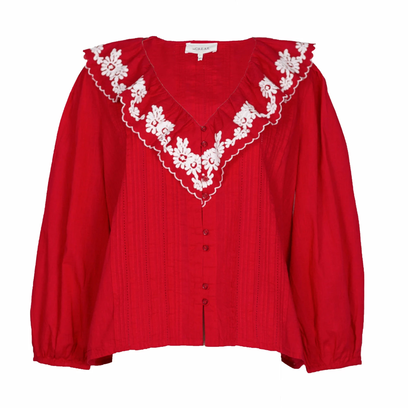 This delightful blouse has hand-embroidered detailing along its dramatic collar, pleating throughout the body, and glamourous sleeves that gather and ruffle.