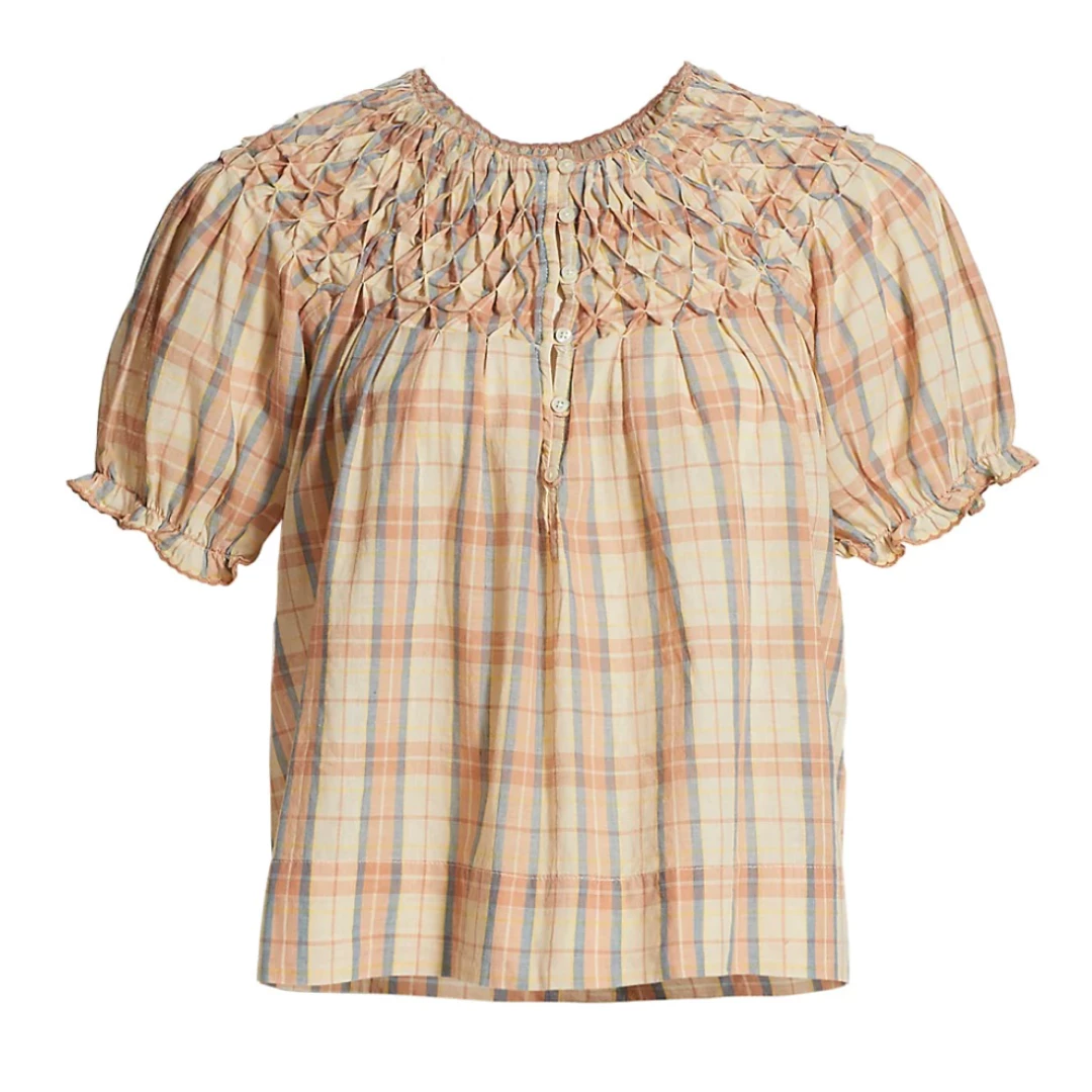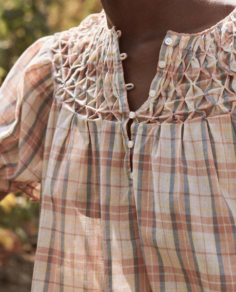 This boxy blouse features an elegantly smocked neckline that leads to a deep v-cut with small button details. Its sleeves are finished in a sweet ruffle with a contrast of red.