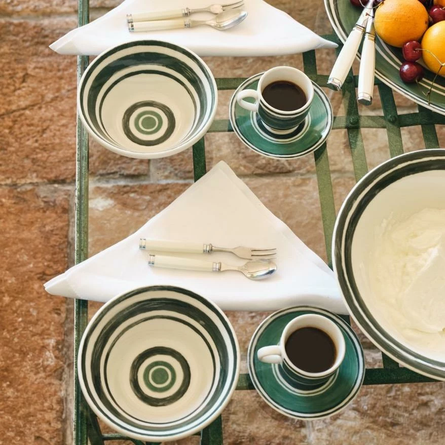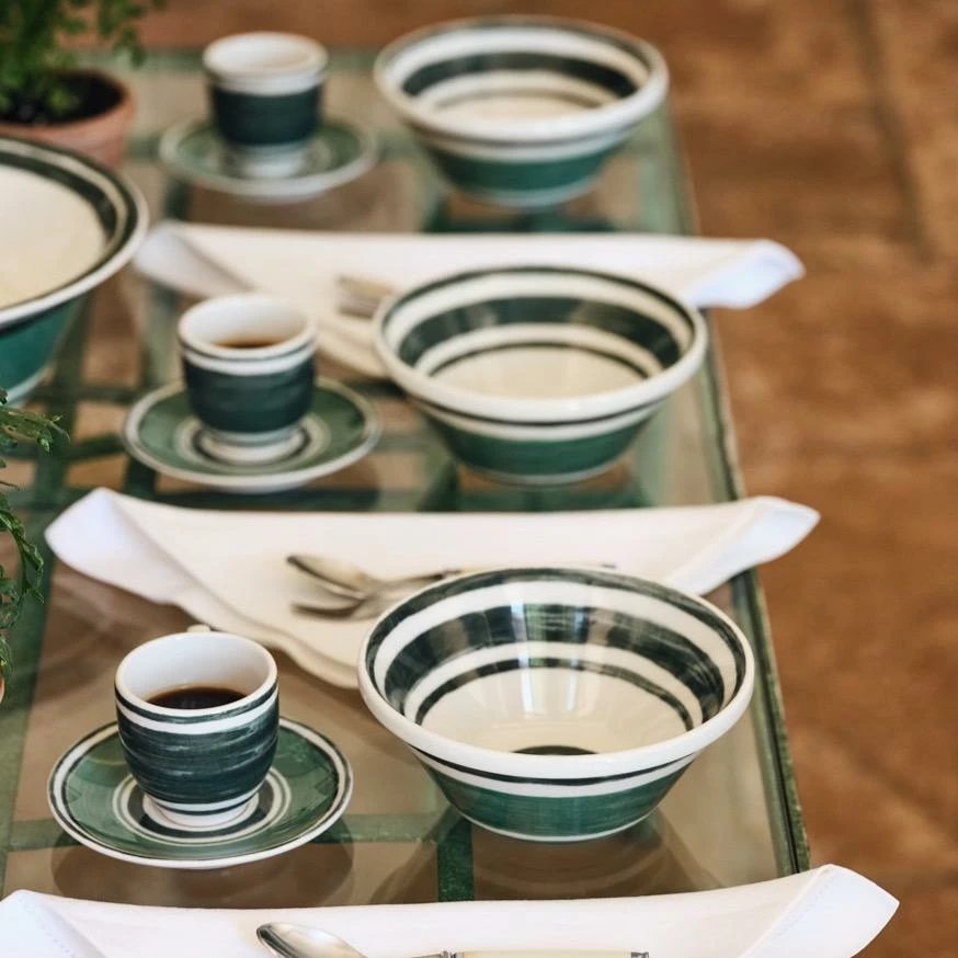 Handcrafted bowl in fine porcelain adorned with hand-painted Maze pattern in green.