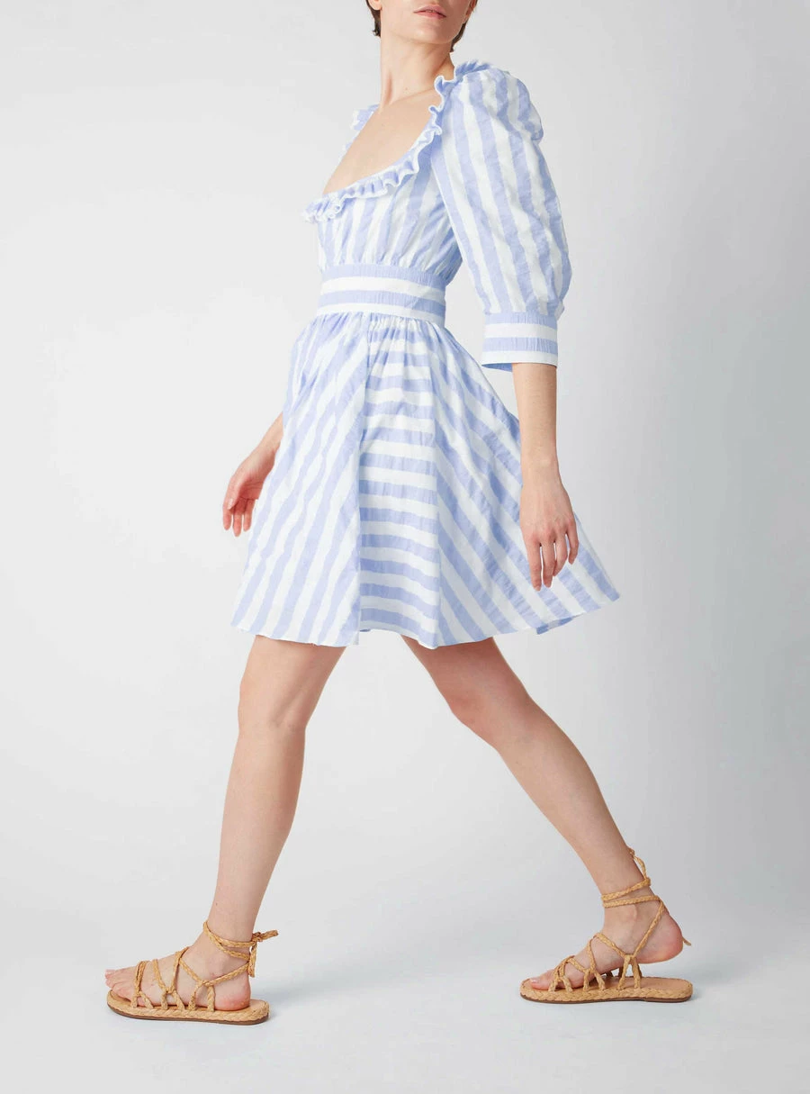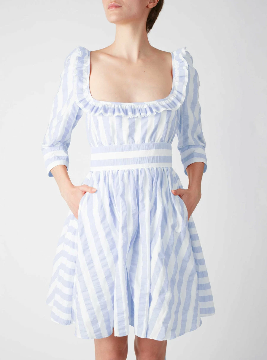 The Yolande dress is a modern version of a pre-revolutionary 18th century aristocratic garment. Its beautiful deep neckline is highlighted by a charming ruffle. The three quarter sleeves and swinging voluminous skirt will be a perfect addition to your wardrobe for garden parties and weddings, during the happy summer days.