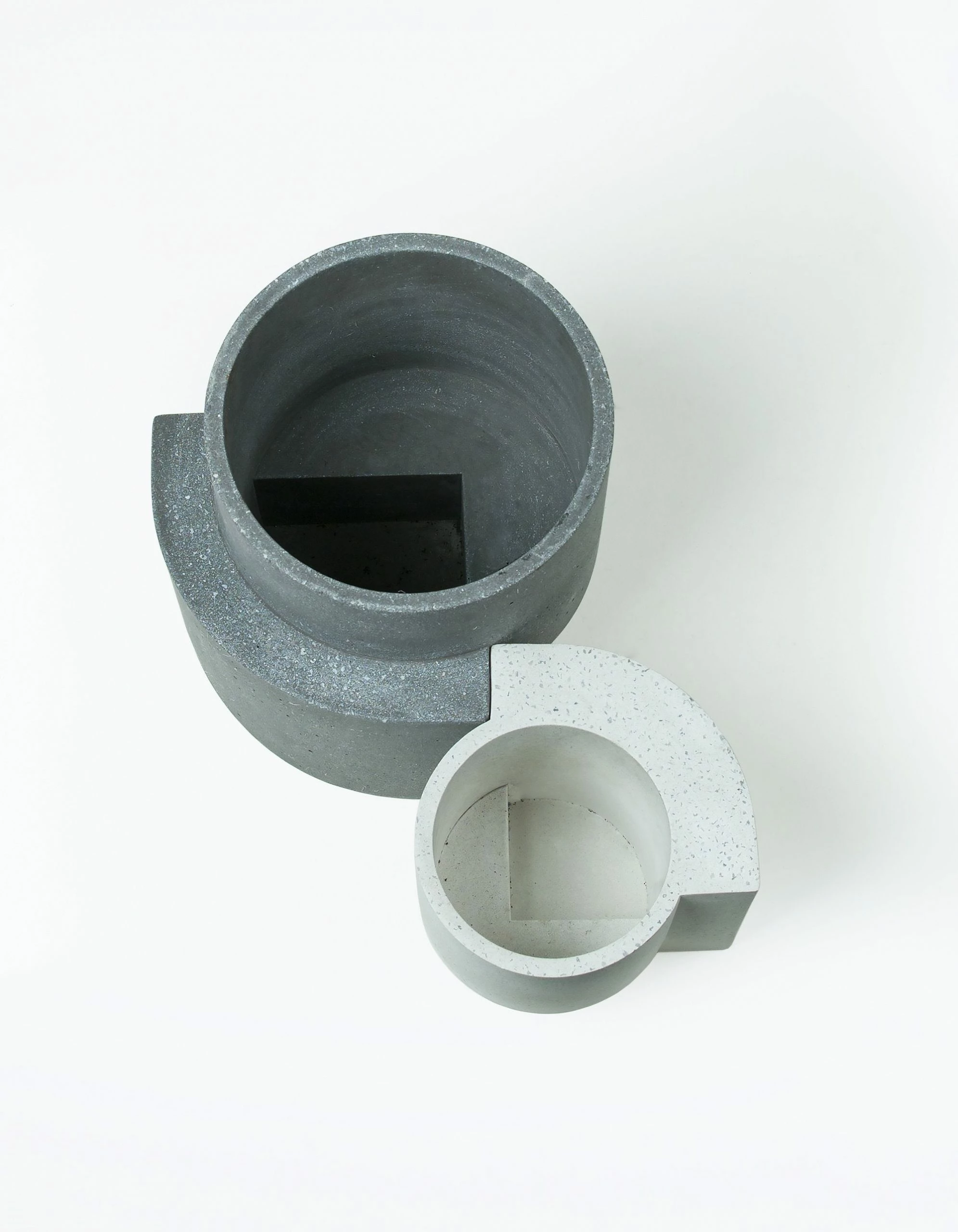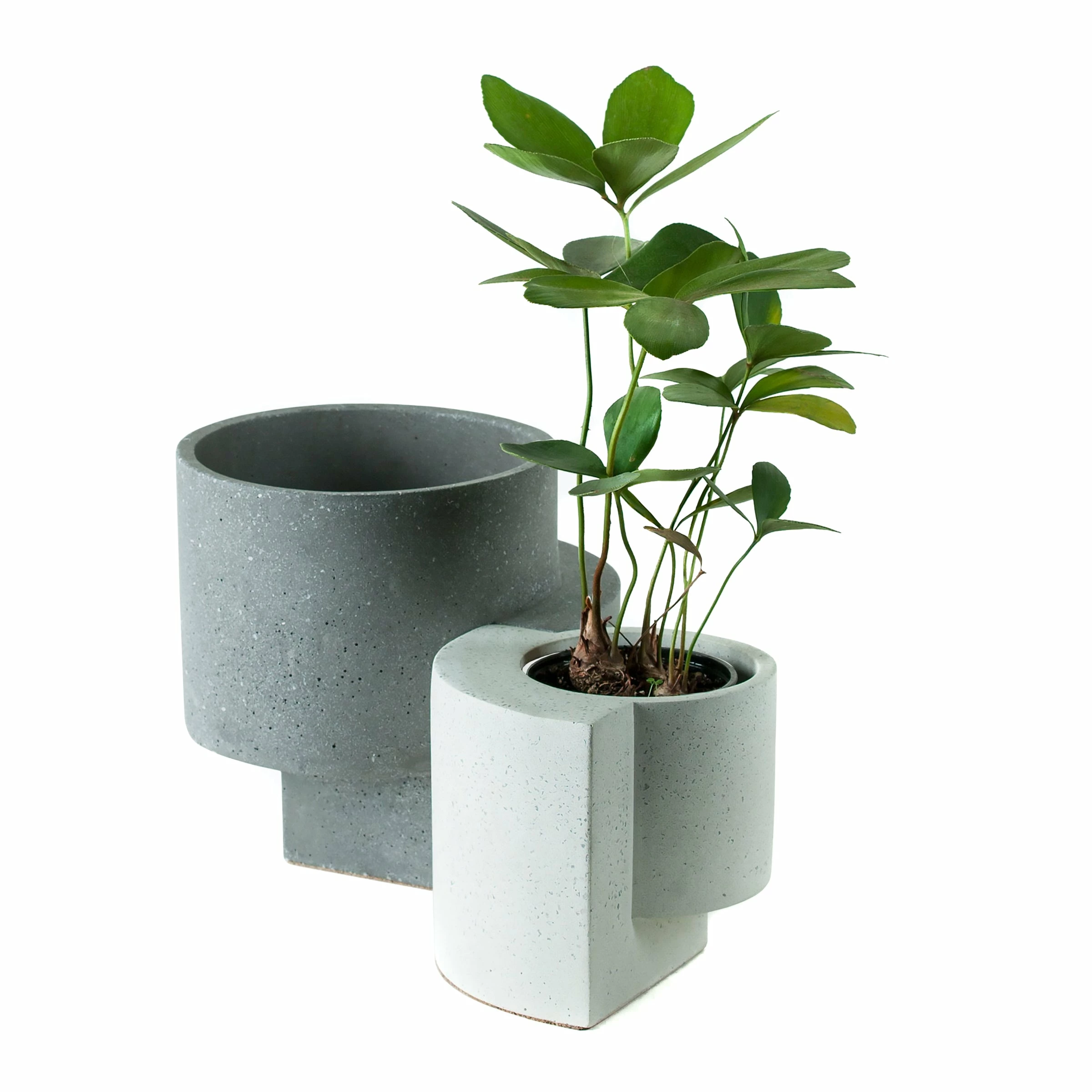 The Ying Yang set of Platform Planters includes one 4″ and one 6″ vessel. Natural stones are poured into matte concrete to create the design that includes a recessed drainage area. Display on their own or snake them together to create a chain.