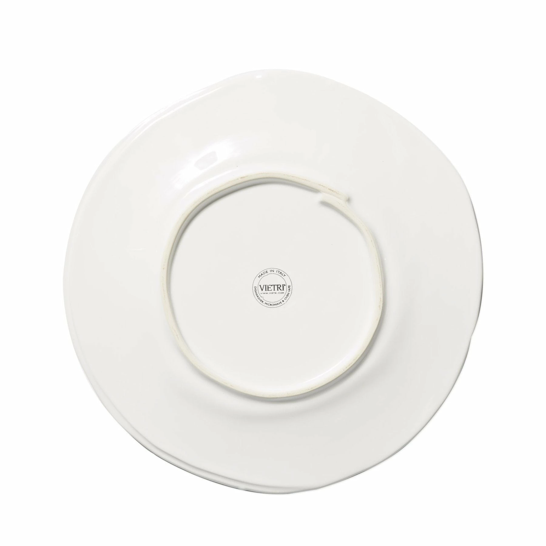 The hand painted fir tree design with red cardinal details is quintessentially Christmas. Handpainted on Italian stoneware in Tuscany, this Holiday European Salad Plate reveals a cheerful design on a rustic yet chic shape. This collection was inspired by the overlapping wooden mold that was used for centuries to form Parmesan and other cheeses throughout Italy.