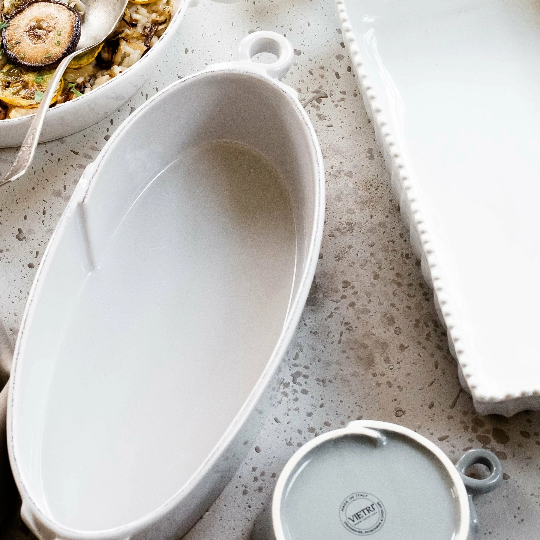 Bake your mother’s traditional lasagna recipe or your family’s favorite casserole in the Lastra Handled Oval Baker. Handcrafted of durable Italian stoneware, this oval baking dish easily transitions from oven to table.