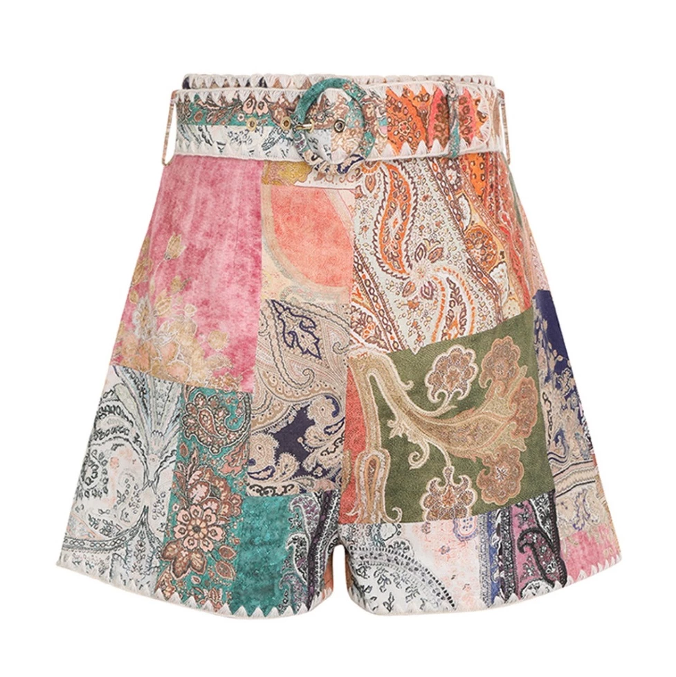 The Anneke Fitted Short in Patch Paisley is a high waisted linen short featuring crochet edging at the hem and self cover belt.